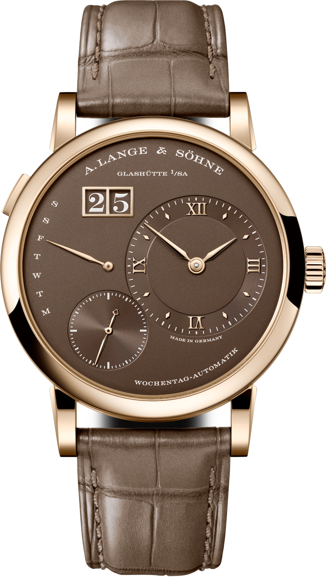 Si el chocolate se mezcla con la miel, que es el tono de la caja de oro de este reloj, el placer es doble. Se trata de la versión automática del clásico de cuerda manual Lange 1, y combina una ventana de fecha de gran tamaño, un pequeño segundero y un calendario semanal retrógrado. Mide 39,5 mm y está limitado a 250 unidades.