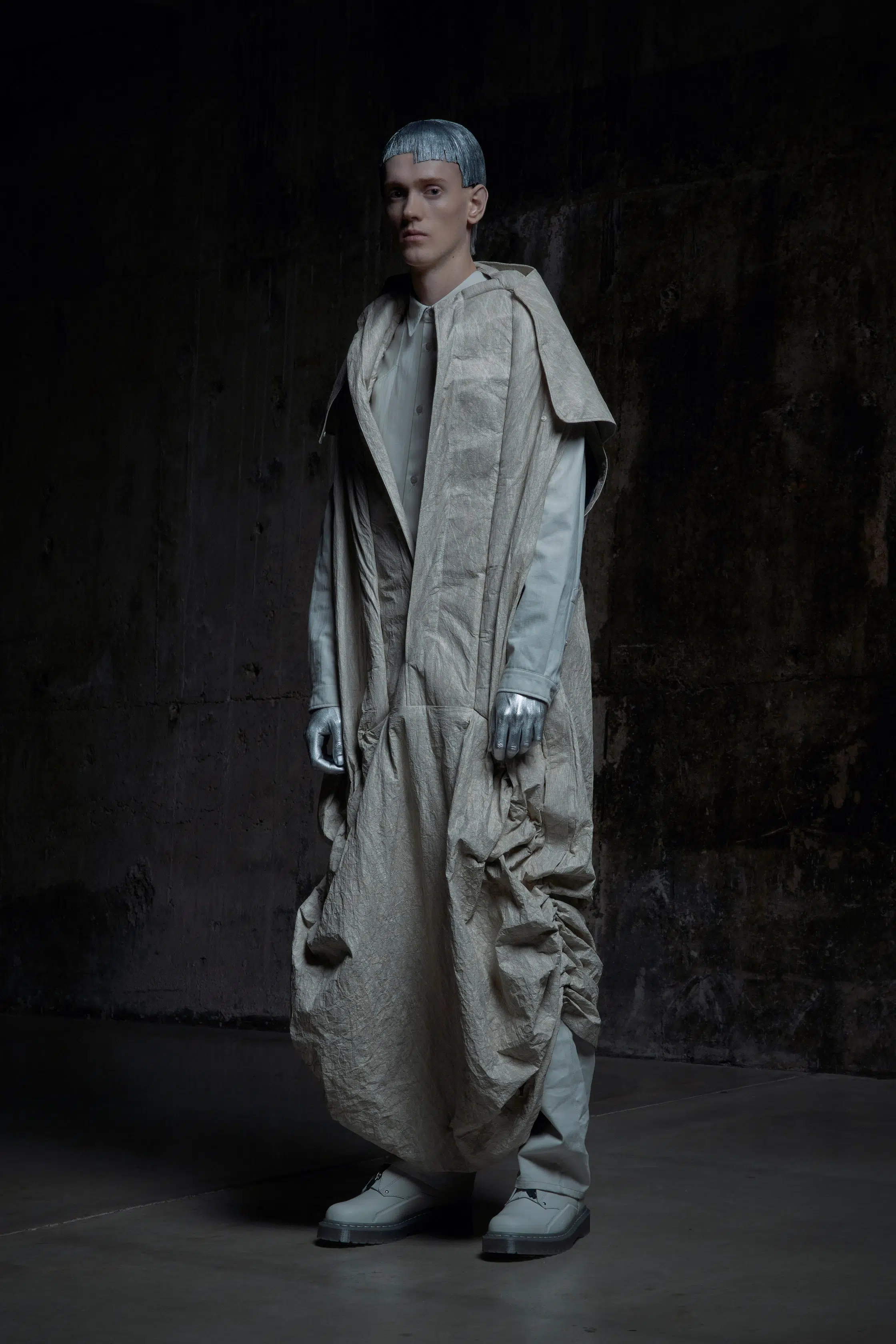 Refiriéndose a este último argumento, no encontramos mejor ejemplo que los pantalones de pata de arco, que reflejan la elasticidad del plomo, el acabado marmóreo de las prendas exteriores, tácticamente pragmáticas, y las piezas de sarga de lona teñida a las que se aplicó un patrón lineal creado mediante la compresión de fotografías de Londres, Nueva York, Milán y Tokio. Además, hay que destacar cómo Ross ha hecho referencia a la actual situación de pandemia que aún atravesamos, diseñando coberturas para la cabeza que, según él, ayudan a protegerte y a escapar. Y no podemos terminar esta «review» sin destacar los maxi bolsos de color bronce que el diseñador ha creado.