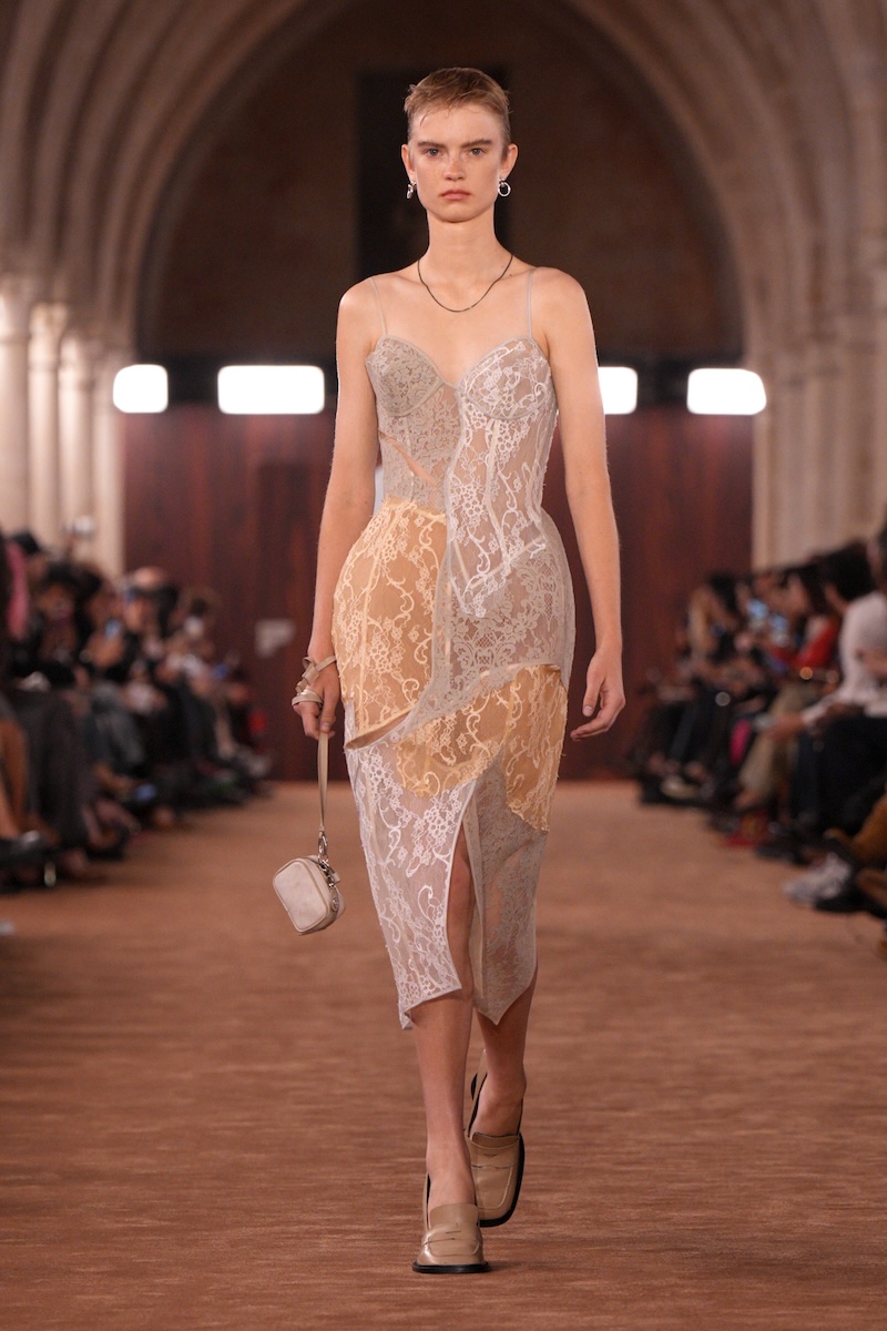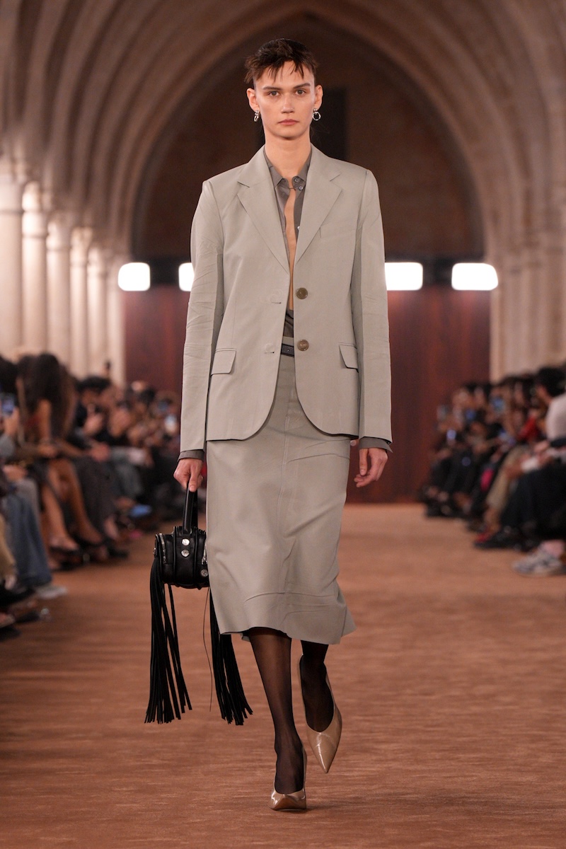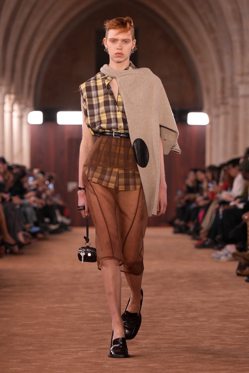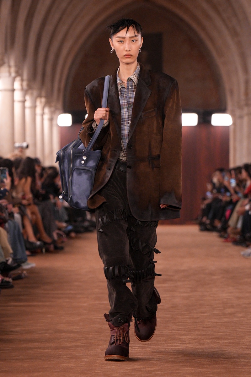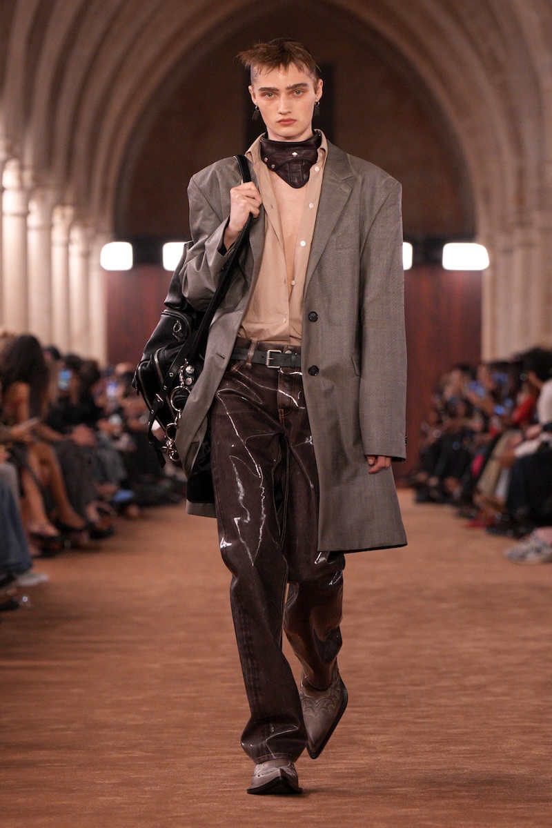 El contraste marca el ritmo. Camisa de leñador con falda ligera. Popelín deslavado. Cuero y ante con aspecto gastado, como trabajados hasta el límite. Knitwear en capas finas. Suéteres con agujeros llevados al exterior. Mientras que el denim se usa como campo de experimentación; roto, recompuesto y tratado con látex. La silueta «1999» vuelve, pero distorsionada.