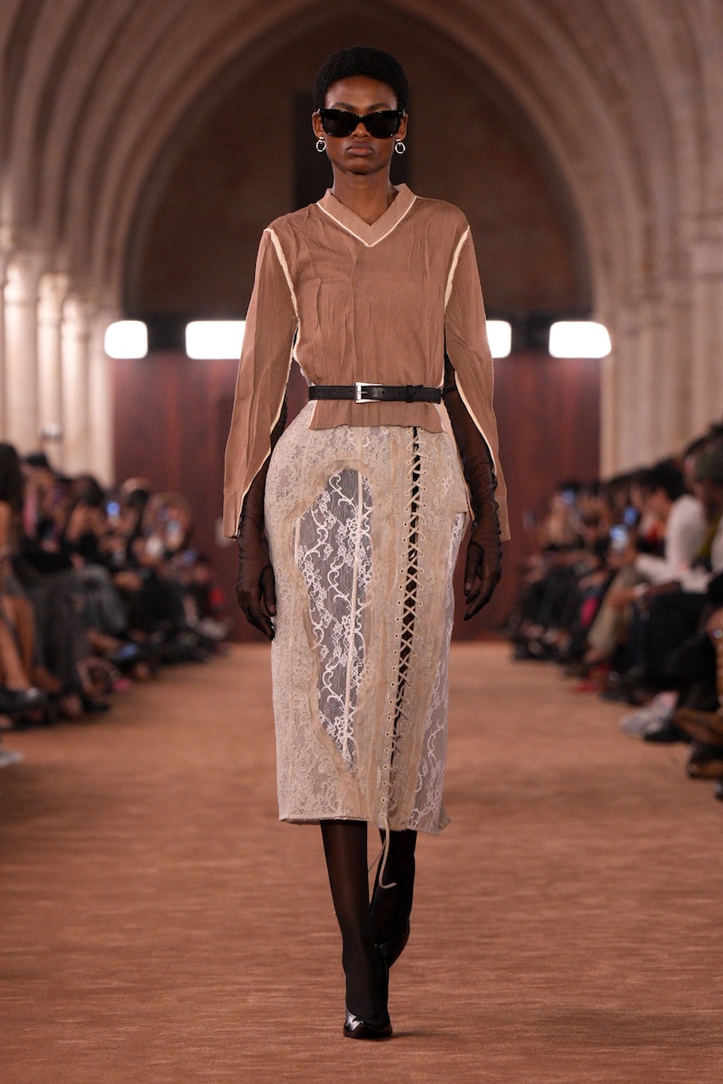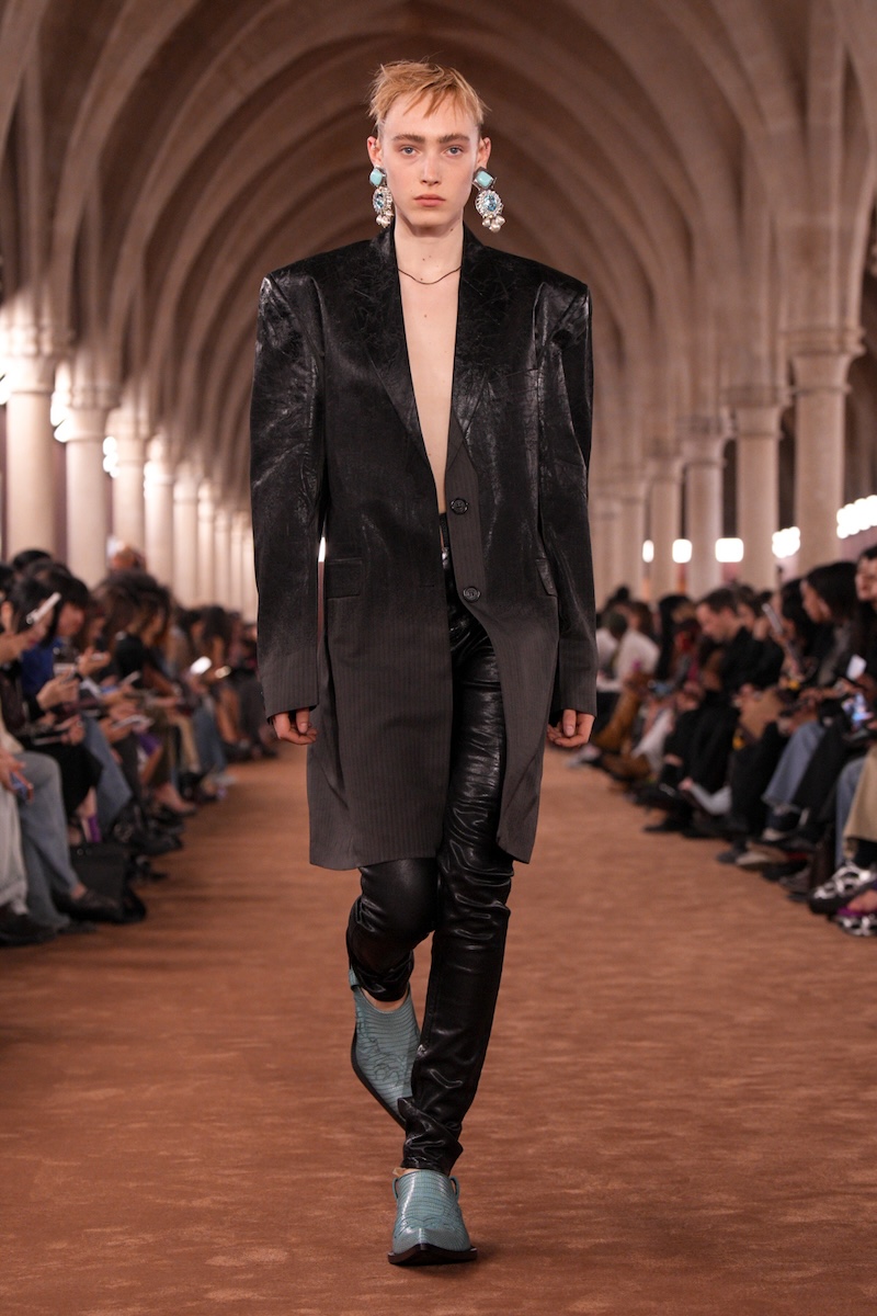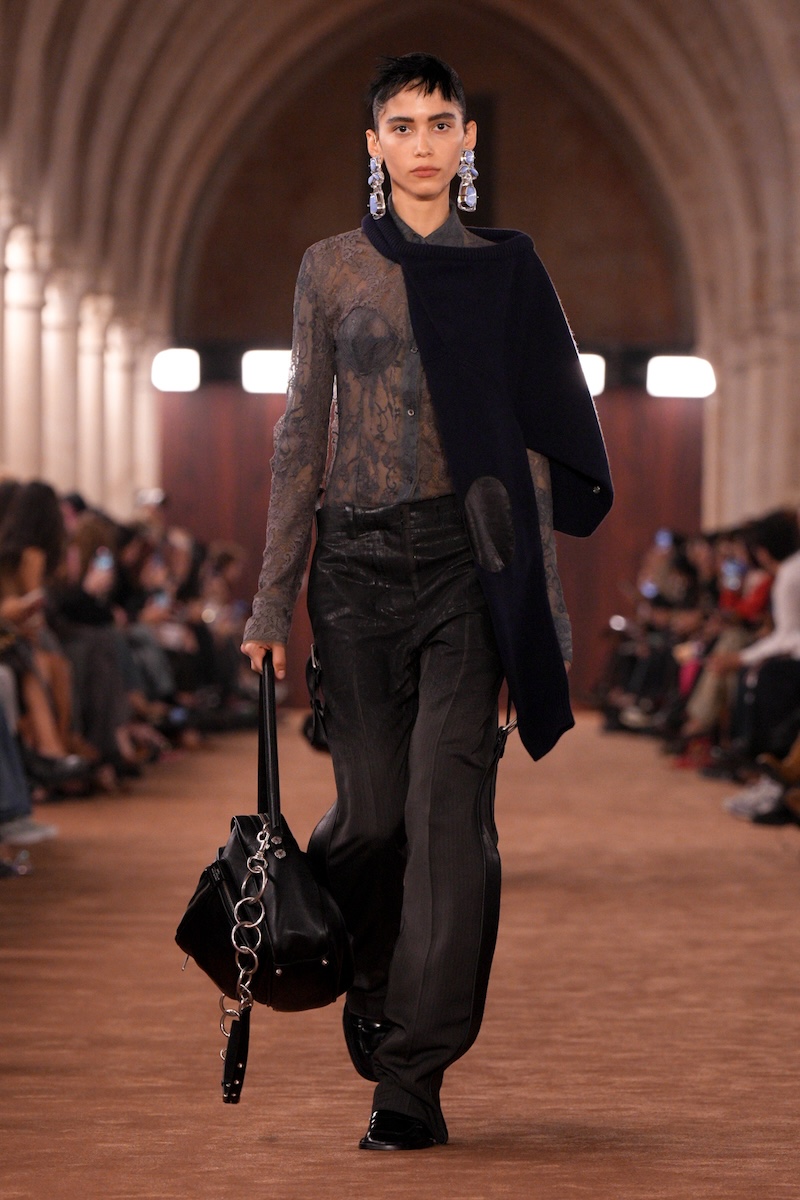 Las prendas juegan con la androginia. Chaquetas de traje desestructuradas. Camisas de uniforme. Encaje de alta costura convertido en patchwork, casi como piel tatuada.