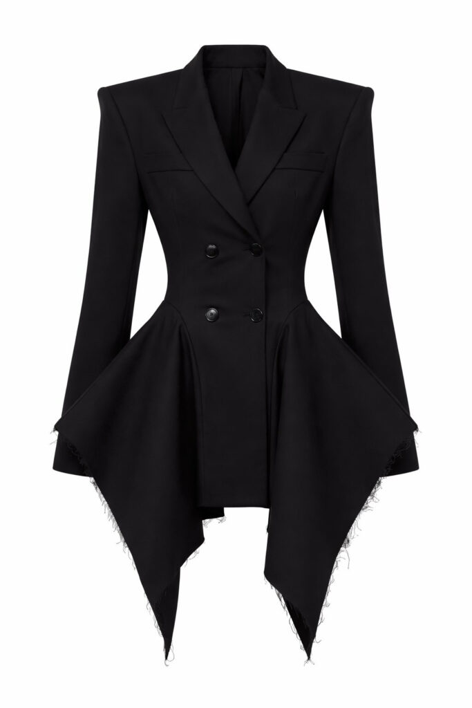 La prenda diseñada para el concierto de Sídney se ha realizado de forma artesanal en lana fría. De este modo, la estructura entretelada aporta rigidez a los alerones laterales, un elemento clave del diseño. Además, la pieza refleja los valores centrales de ACROMATYX. Entre ellos, destacan las siluetas pensadas como una extensión del cuerpo, con una fuerte carga simbólica y una presencia escénica clara.