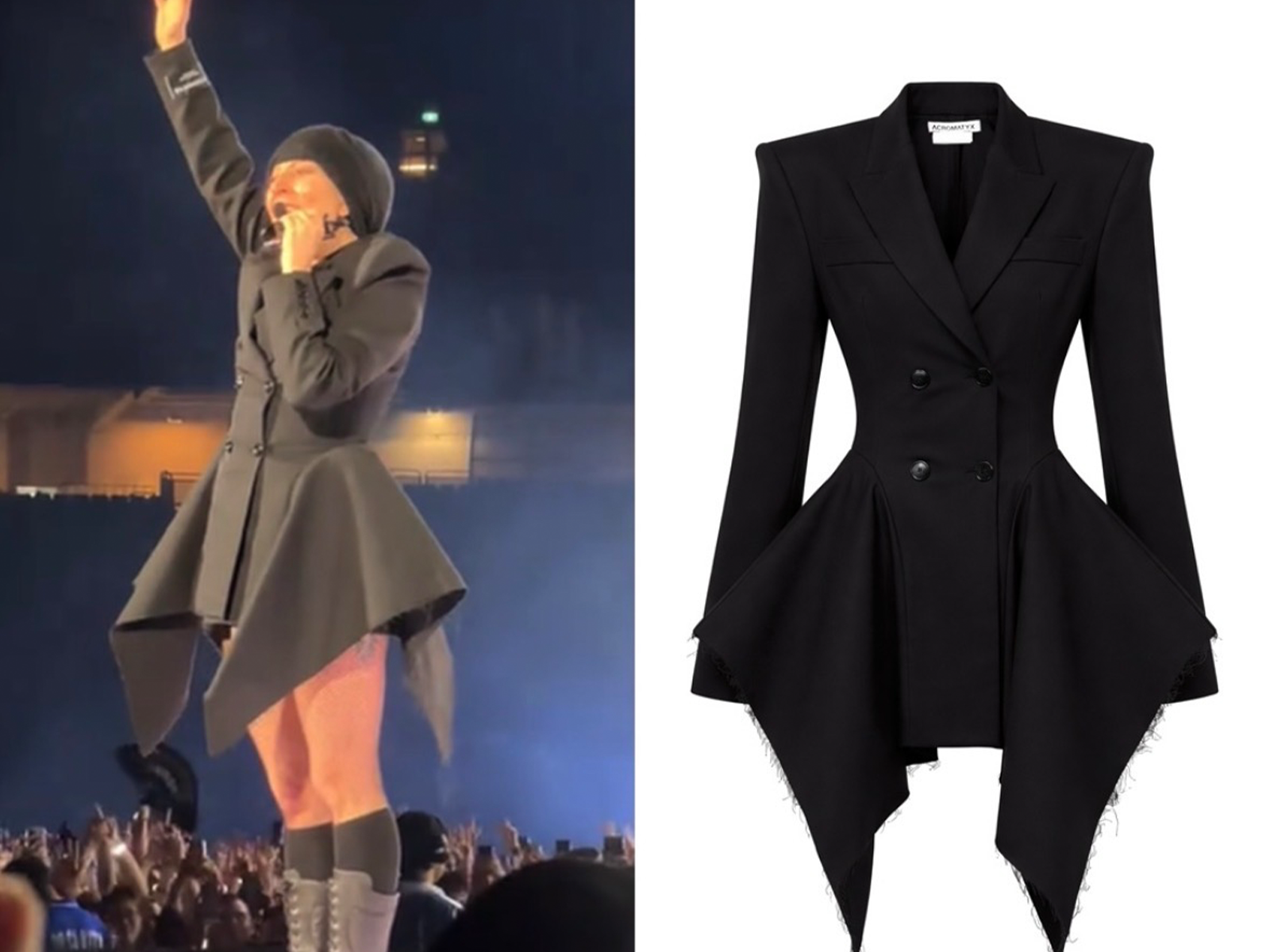 La prenda diseñada para el concierto de Sídney se ha realizado de forma artesanal en lana fría. De este modo, la estructura entretelada aporta rigidez a los alerones laterales, un elemento clave del diseño. Además, la pieza refleja los valores centrales de ACROMATYX. Entre ellos, destacan las siluetas pensadas como una extensión del cuerpo, con una fuerte carga simbólica y una presencia escénica clara.
