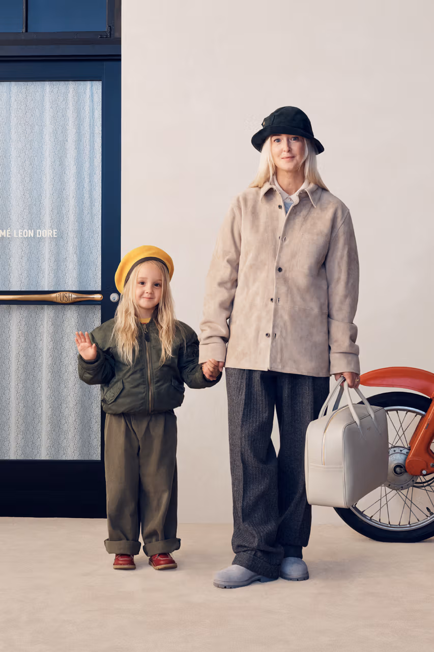 El lookbook muestra el equilibrio característico de ALD entre sastrería clásica y funcionalidad contemporánea. Las prendas exteriores destacan por su refinamiento. Entre ellas, chaquetas de lana, modelos de borrego como la Shearling Aviator Jacket y un abrigo largo de tweed con bolsillos utilitarios lucido por Osborne.
