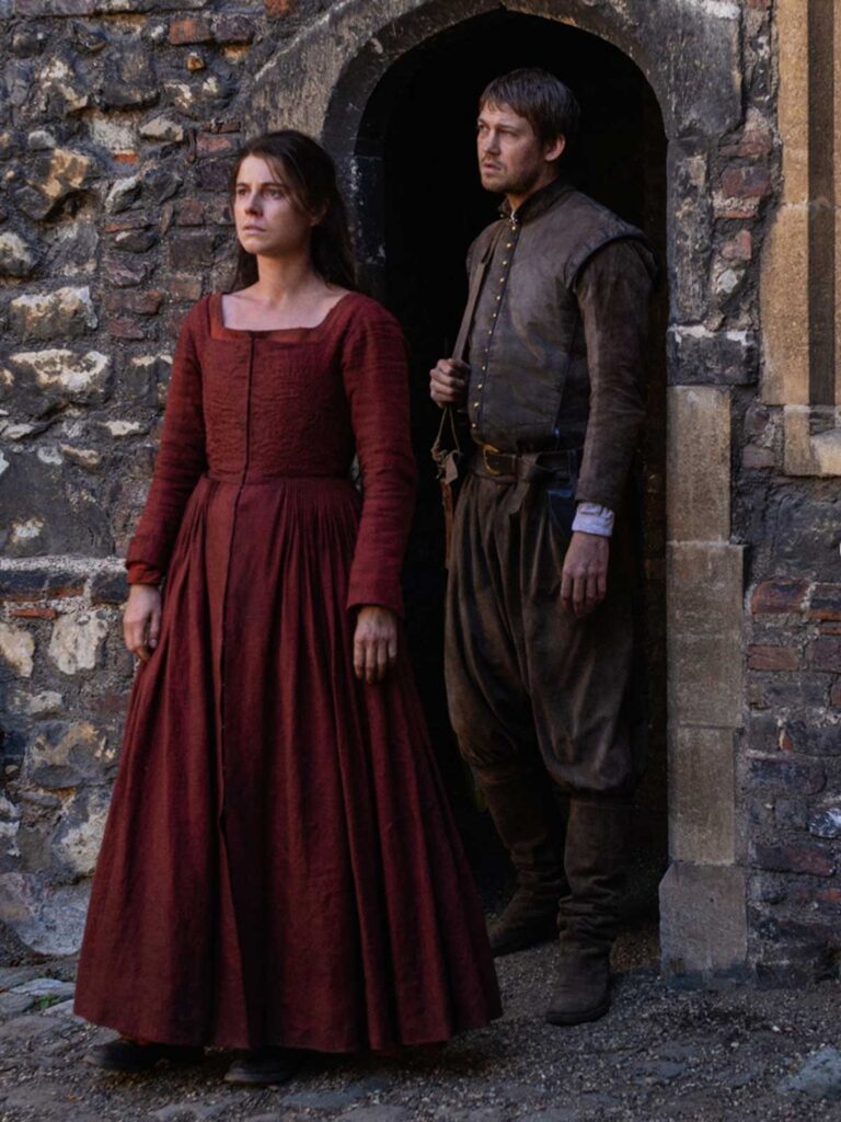Aunque Hamnet gira en torno a la figura de Shakespeare, su núcleo emocional reside en Agnes Hathaway, interpretada por Jessie Buckley. Su vestuario es el más expresivo y simbólicamente cargado, reflejando una conexión casi mística con el mundo natural. En los primeros actos, los rojos, naranjas y tonos óxido dominan su indumentaria, subrayando una energía vital que contrasta con los espacios cerrados y sombríos del entorno doméstico.
