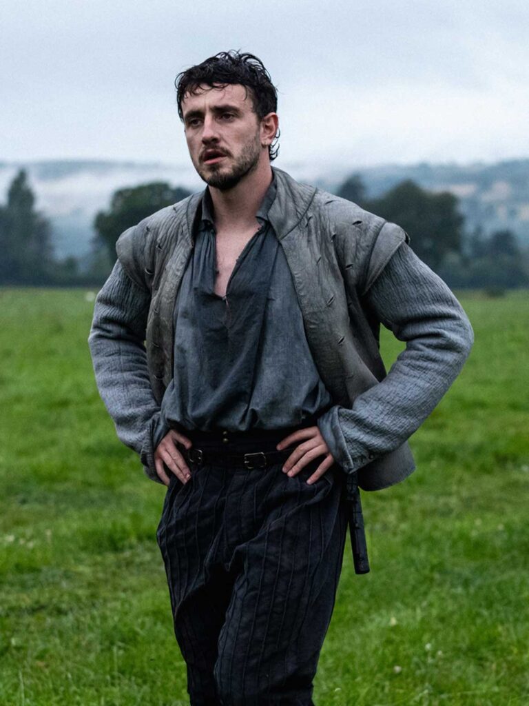 El William Shakespeare interpretado por Paul Mescal está definido por una relación defensiva con el mundo. Su vestuario construye una silueta cerrada, protegida, marcada por capas y volúmenes que funcionan como barreras simbólicas. No se trata de ocultar el cuerpo, sino de contenerlo, de evitar que la emoción se filtre hacia el exterior.
