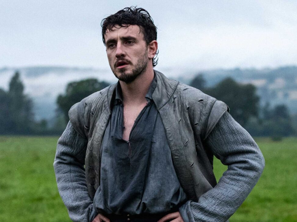 El William Shakespeare interpretado por Paul Mescal está definido por una relación defensiva con el mundo. Su vestuario construye una silueta cerrada, protegida, marcada por capas y volúmenes que funcionan como barreras simbólicas. No se trata de ocultar el cuerpo, sino de contenerlo, de evitar que la emoción se filtre hacia el exterior.