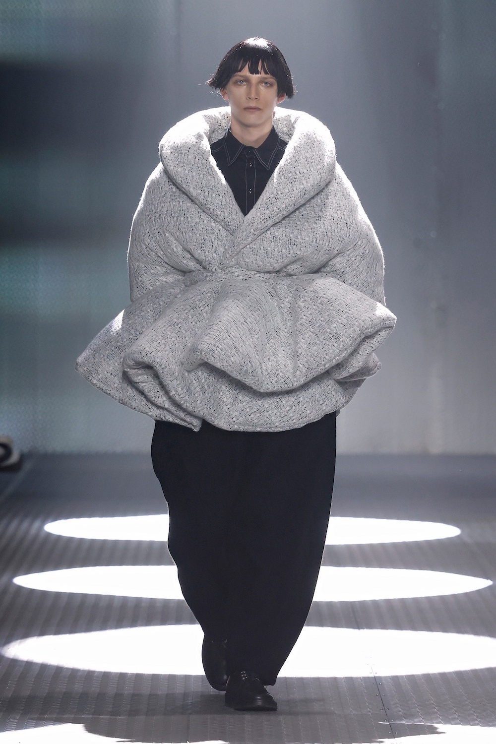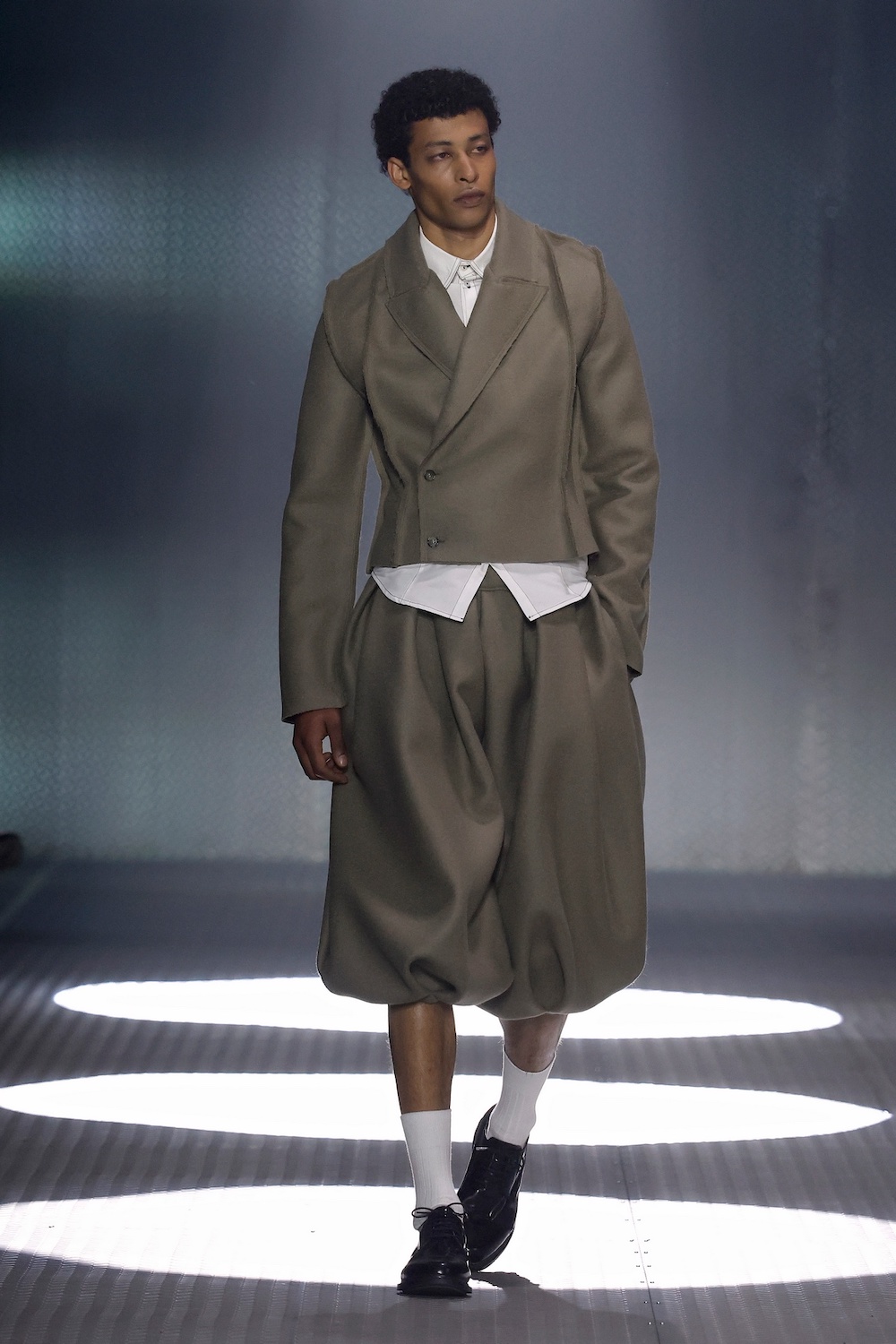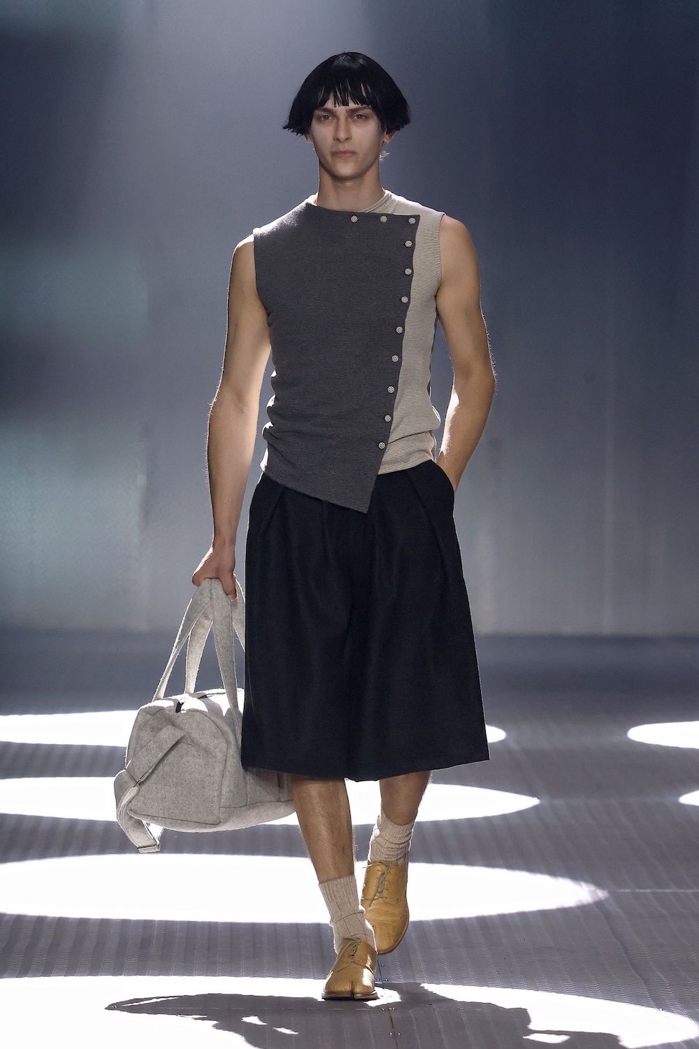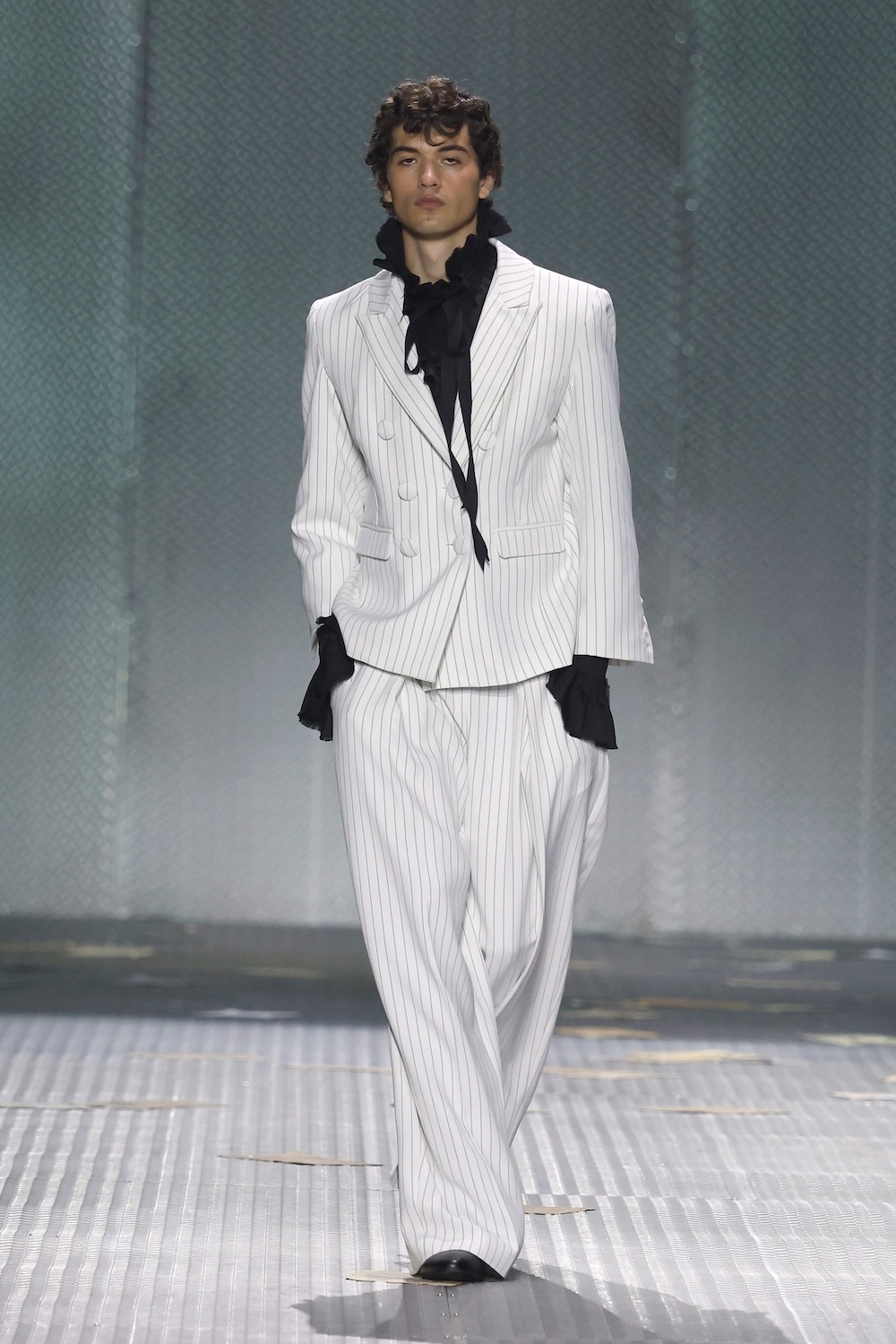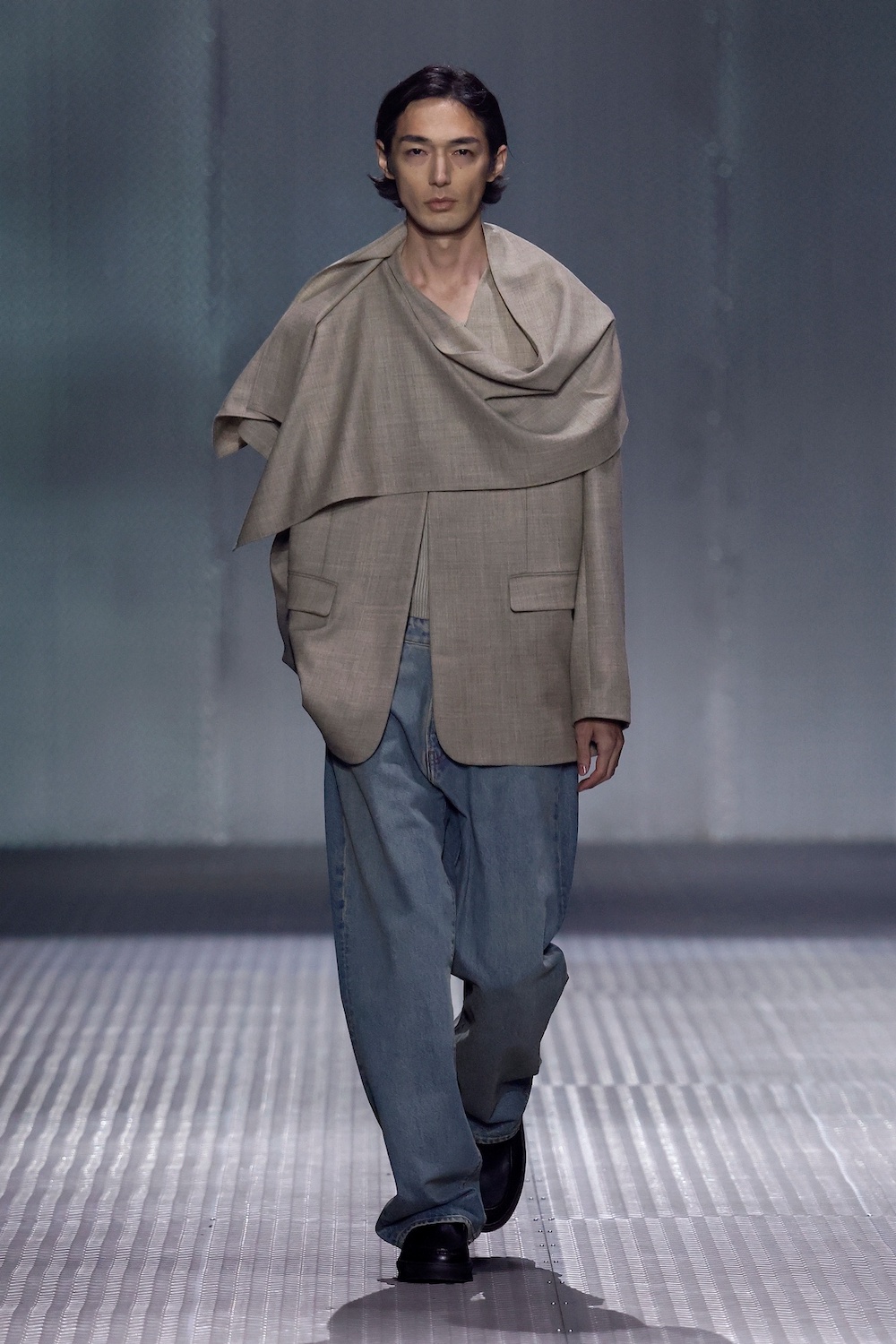 Las prendas se caracterizaban por sus asimetrías marcadas, con partes delanteras más cortas, espaldas alargadas y proporciones inesperadas, lo cual generaba movimiento y tensión visual. La sastrería clásica dialogaba con los tejidos creados a partir de retales, como si la materia estuviera aún pasando por un proceso de definición. El esmoquin como eje central se reinterpretaba en un lenguaje moderno, en el que la formalidad se flexibilizaba con un guiño sutil a la década de los sesenta.
