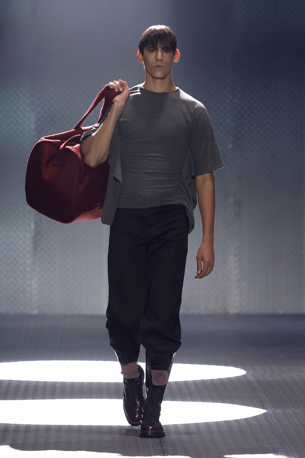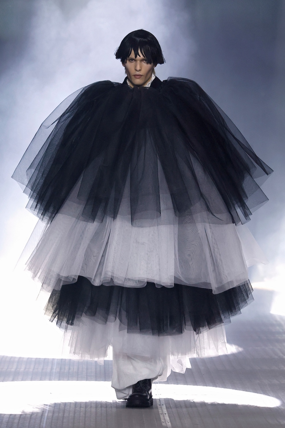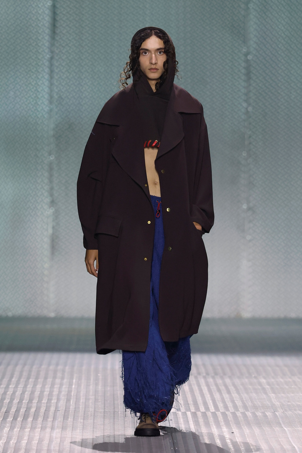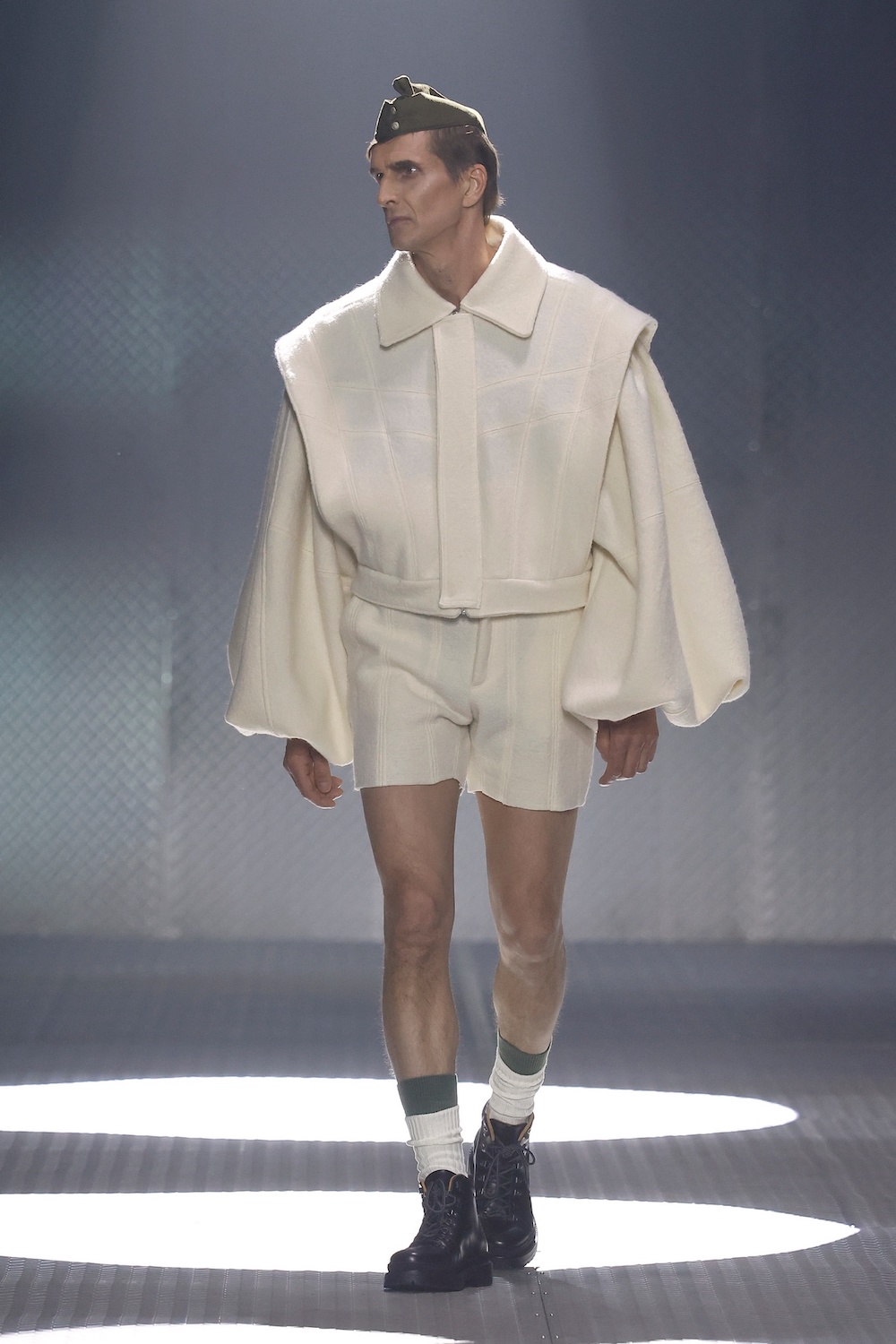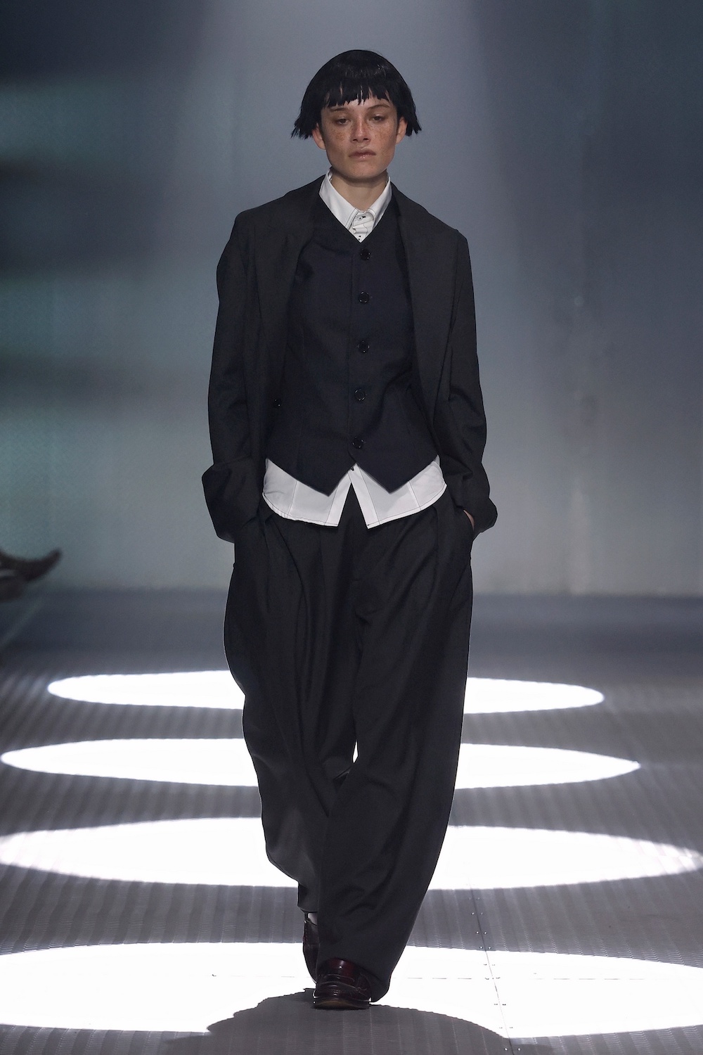 Las prendas se caracterizaban por sus asimetrías marcadas, con partes delanteras más cortas, espaldas alargadas y proporciones inesperadas, lo cual generaba movimiento y tensión visual. La sastrería clásica dialogaba con los tejidos creados a partir de retales, como si la materia estuviera aún pasando por un proceso de definición. El esmoquin como eje central se reinterpretaba en un lenguaje moderno, en el que la formalidad se flexibilizaba con un guiño sutil a la década de los sesenta.