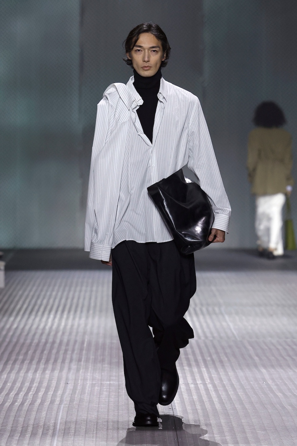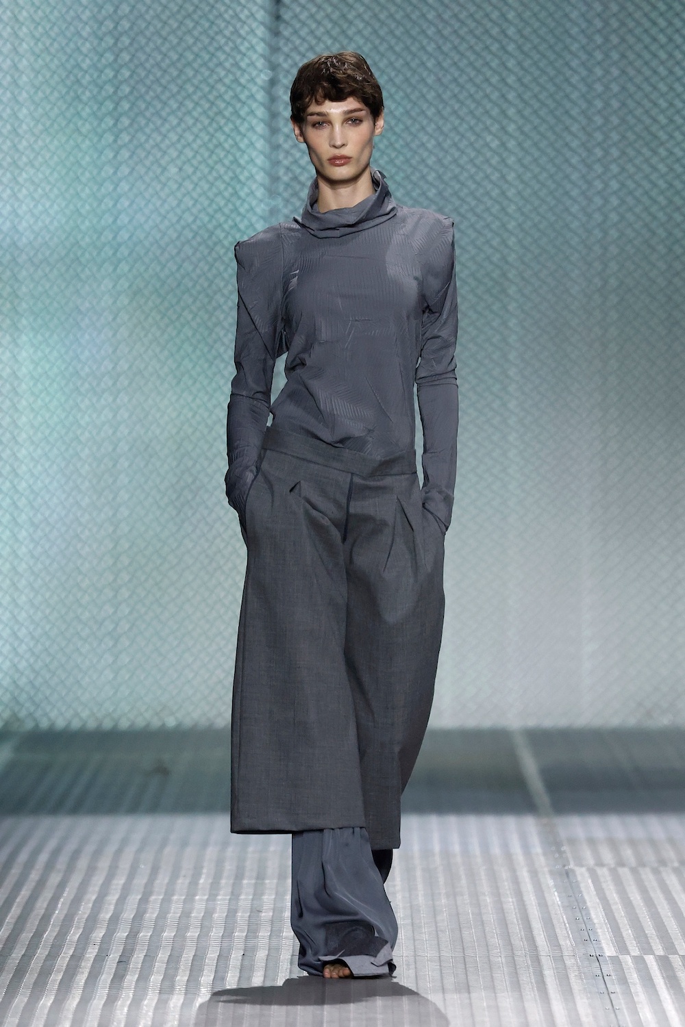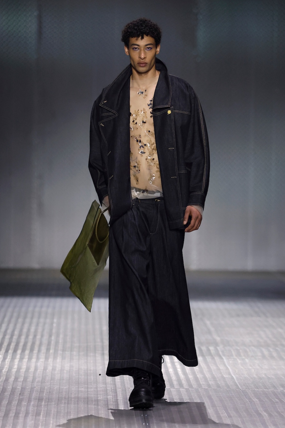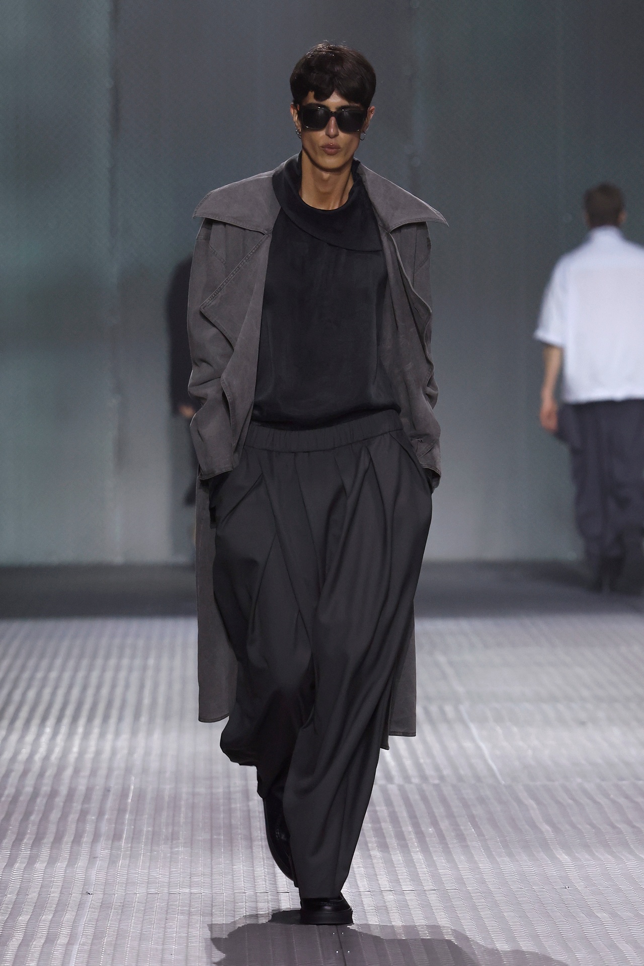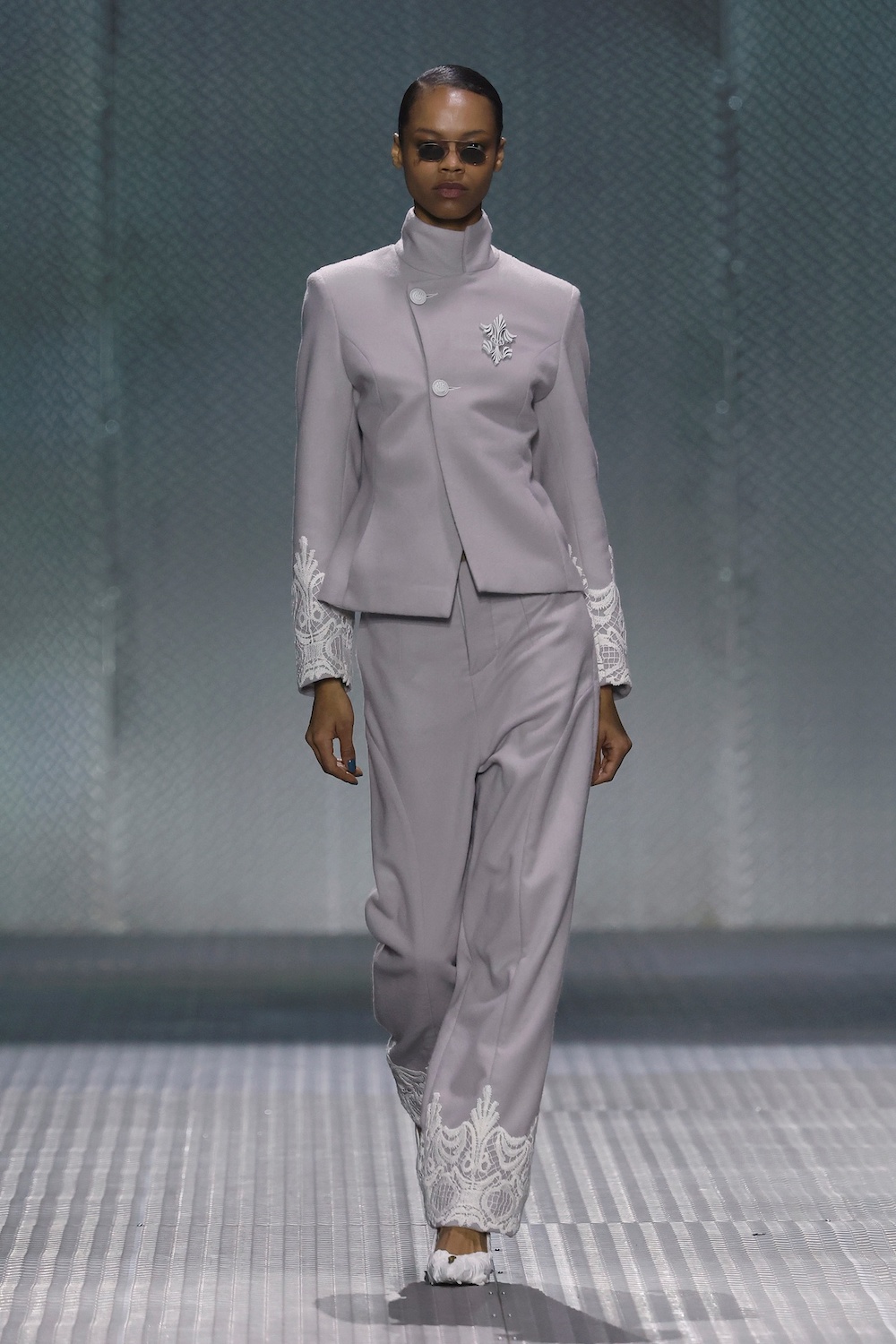 Las prendas se caracterizaban por sus asimetrías marcadas, con partes delanteras más cortas, espaldas alargadas y proporciones inesperadas, lo cual generaba movimiento y tensión visual. La sastrería clásica dialogaba con los tejidos creados a partir de retales, como si la materia estuviera aún pasando por un proceso de definición. El esmoquin como eje central se reinterpretaba en un lenguaje moderno, en el que la formalidad se flexibilizaba con un guiño sutil a la década de los sesenta.