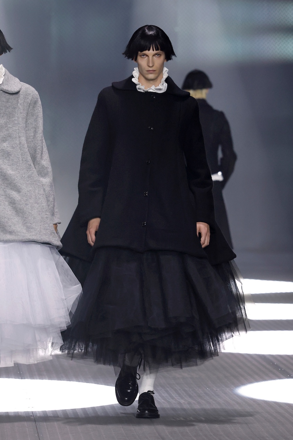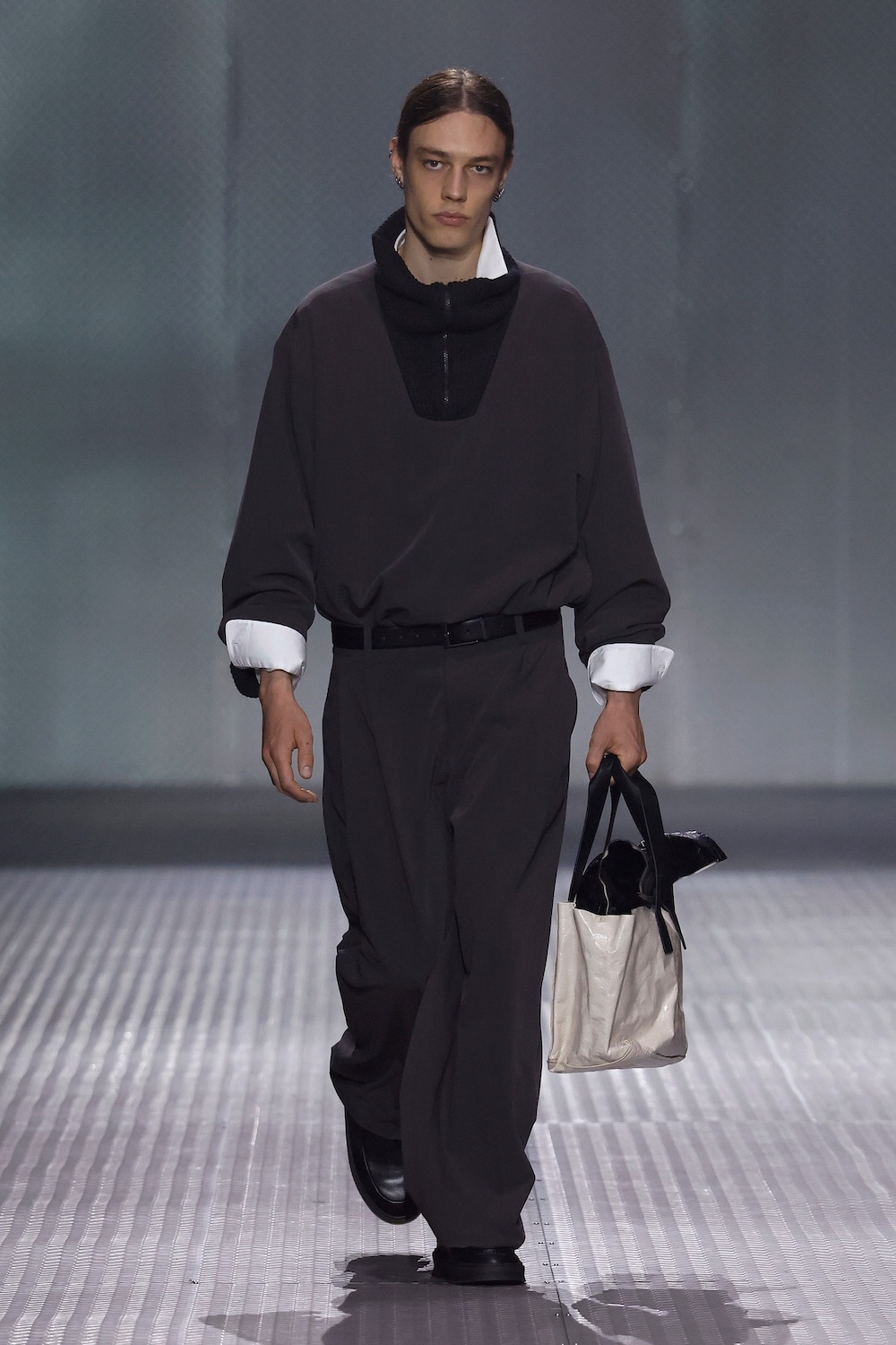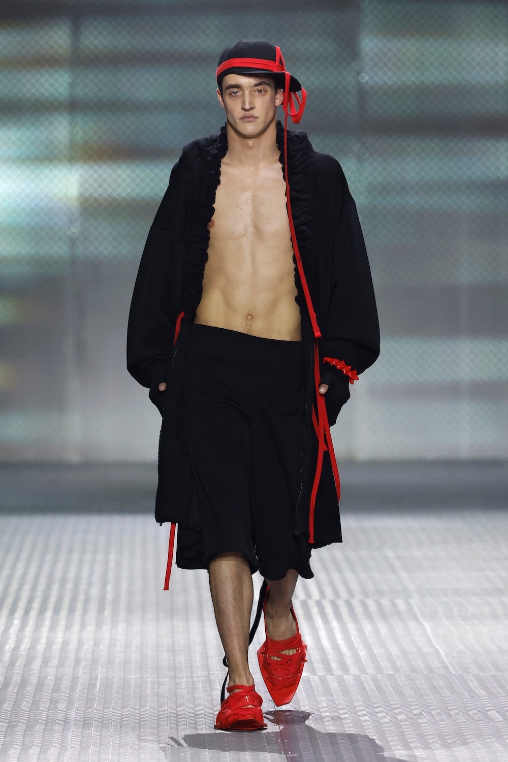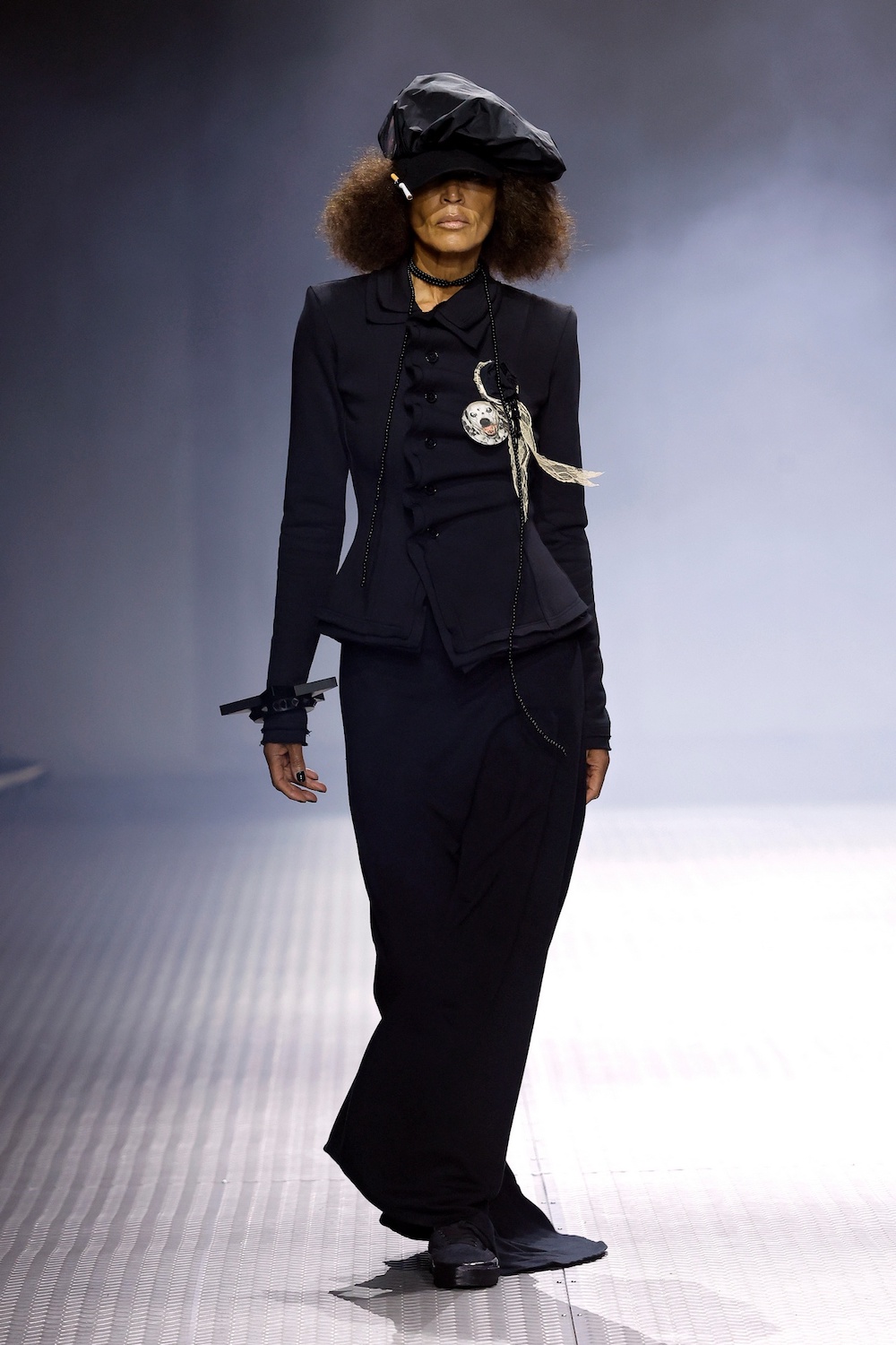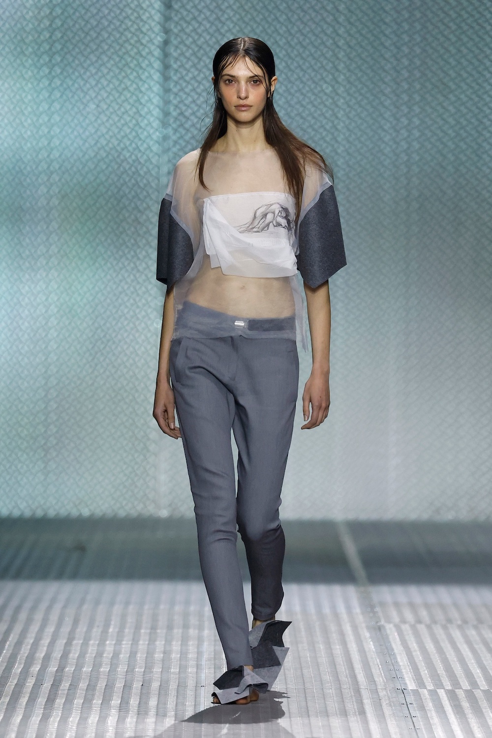 Las prendas se caracterizaban por sus asimetrías marcadas, con partes delanteras más cortas, espaldas alargadas y proporciones inesperadas, lo cual generaba movimiento y tensión visual. La sastrería clásica dialogaba con los tejidos creados a partir de retales, como si la materia estuviera aún pasando por un proceso de definición. El esmoquin como eje central se reinterpretaba en un lenguaje moderno, en el que la formalidad se flexibilizaba con un guiño sutil a la década de los sesenta.