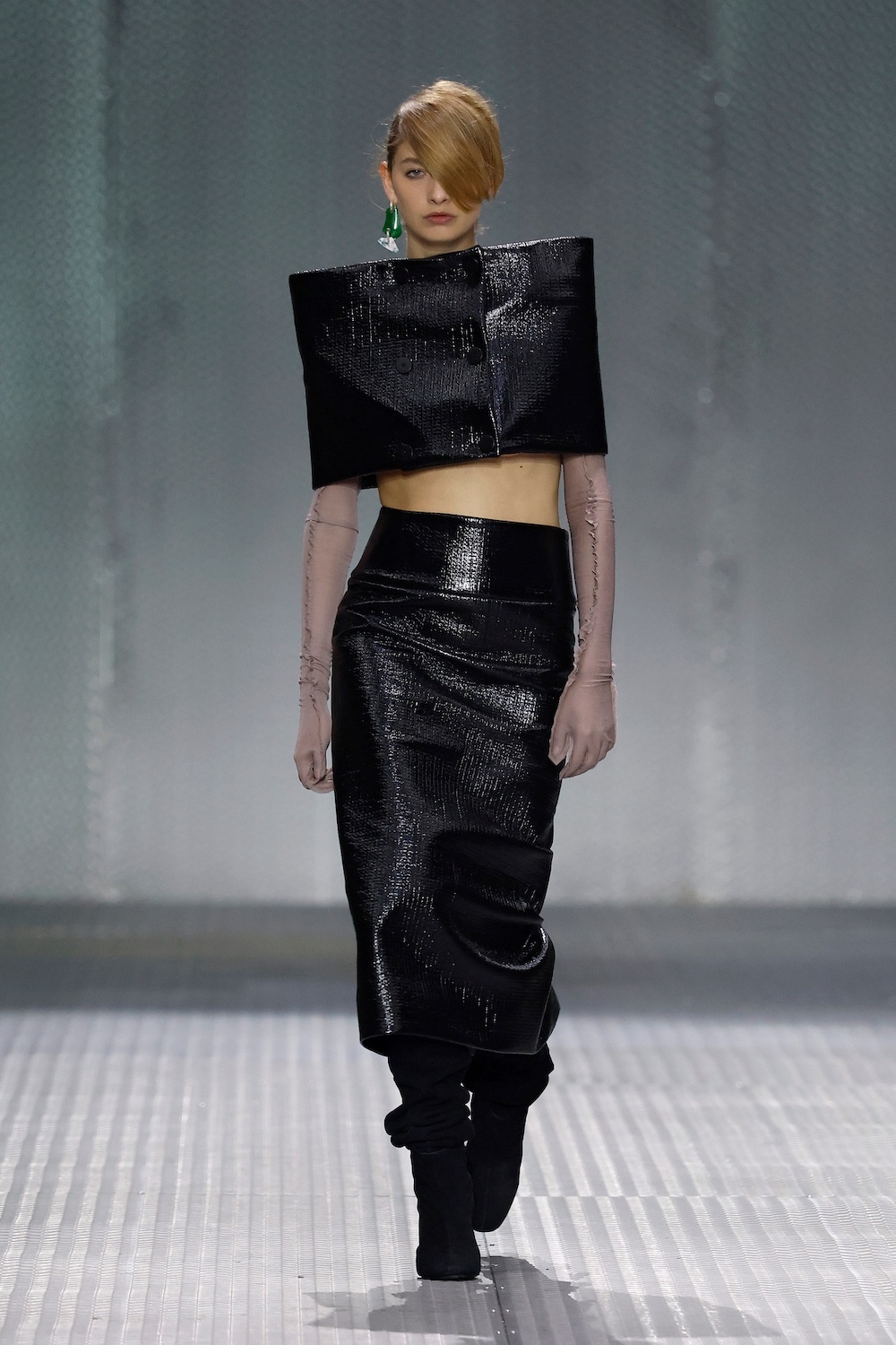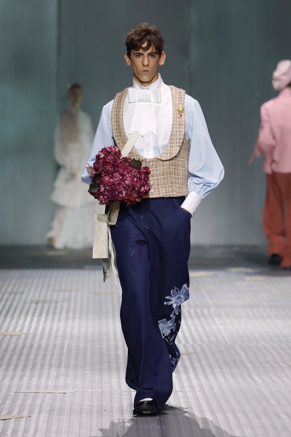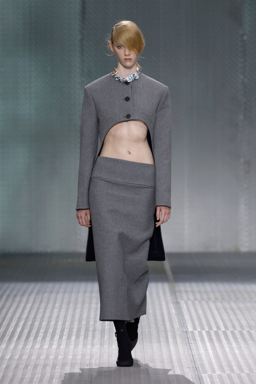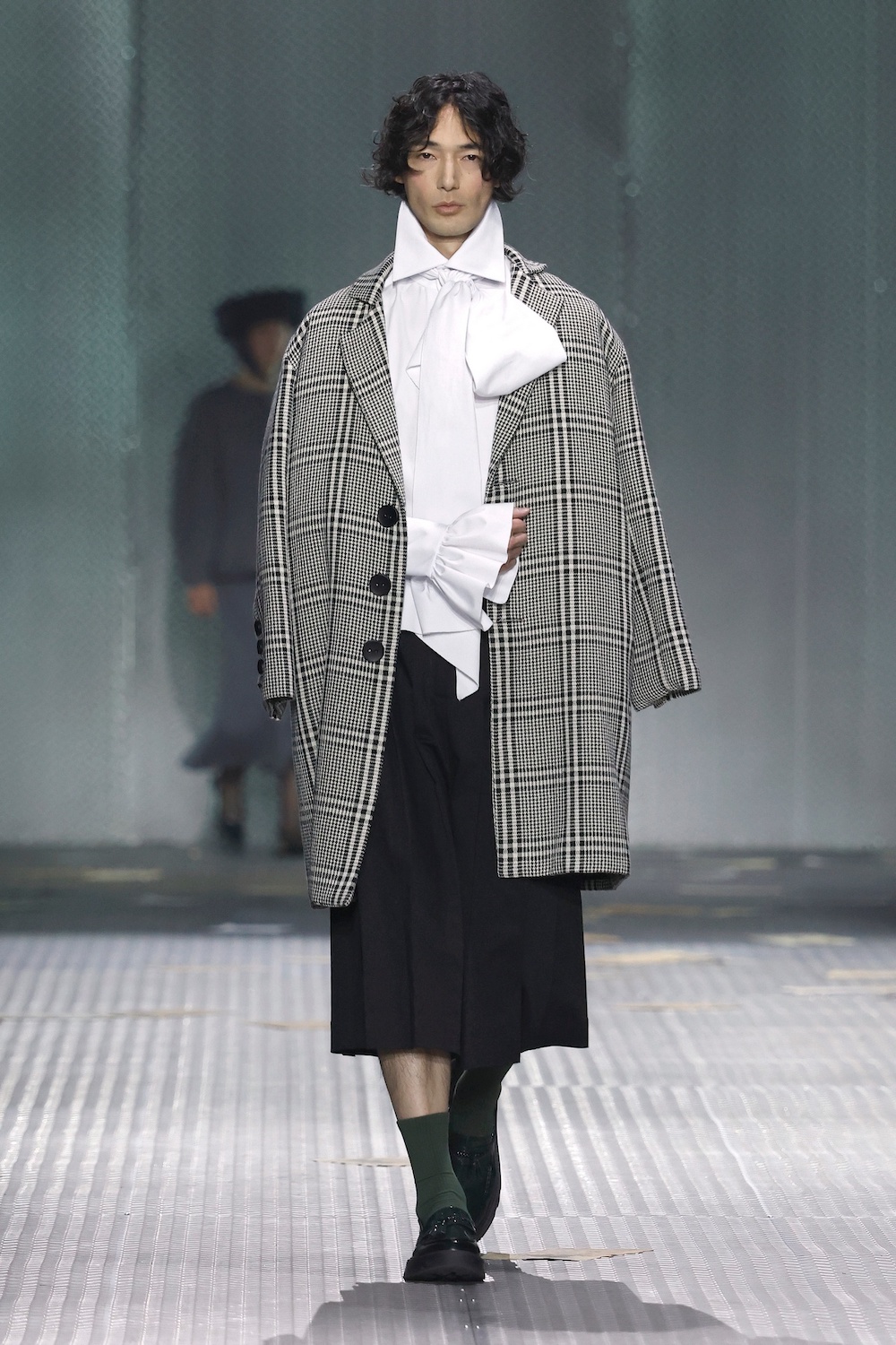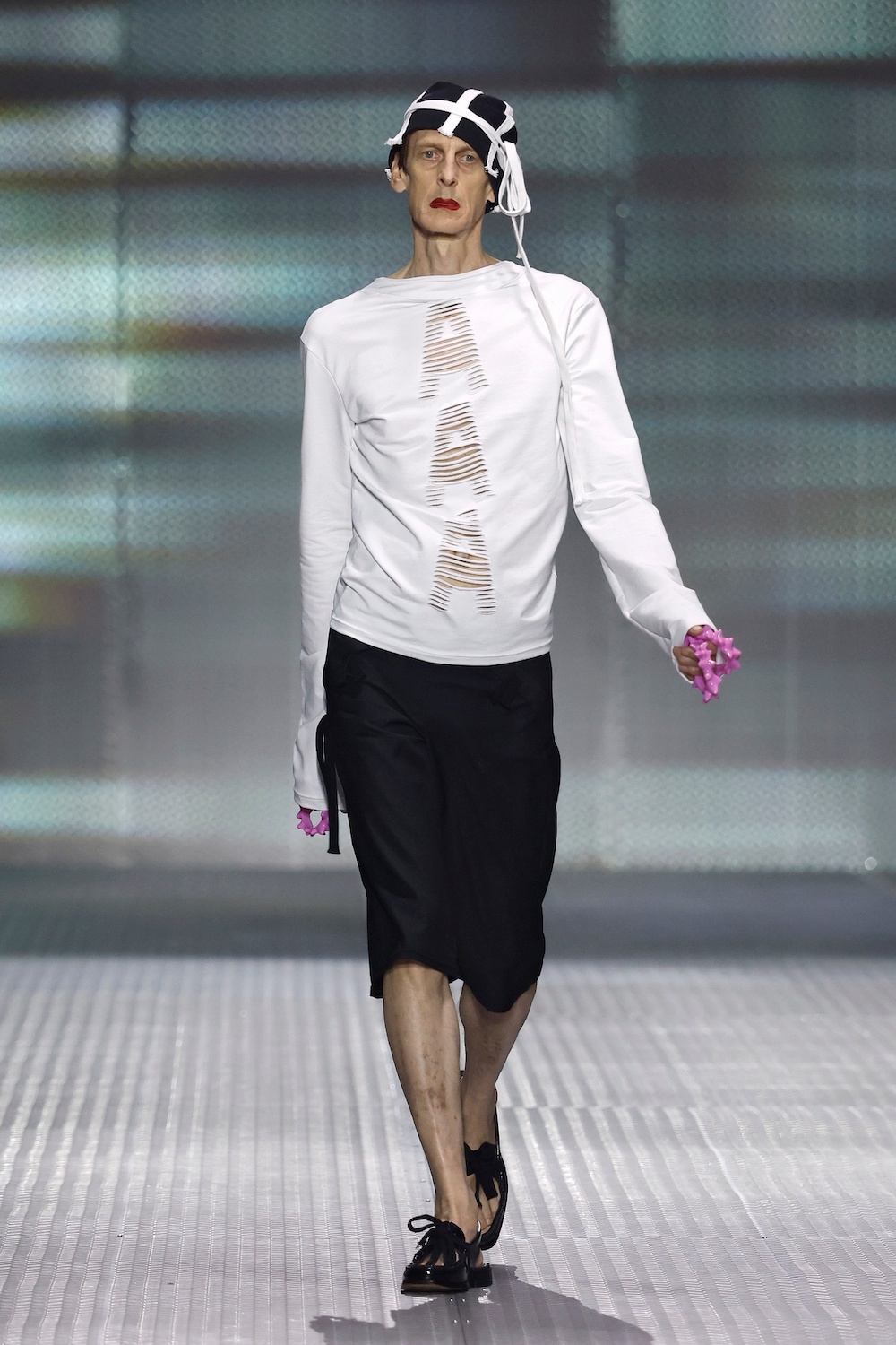 Las prendas se caracterizaban por sus asimetrías marcadas, con partes delanteras más cortas, espaldas alargadas y proporciones inesperadas, lo cual generaba movimiento y tensión visual. La sastrería clásica dialogaba con los tejidos creados a partir de retales, como si la materia estuviera aún pasando por un proceso de definición. El esmoquin como eje central se reinterpretaba en un lenguaje moderno, en el que la formalidad se flexibilizaba con un guiño sutil a la década de los sesenta.