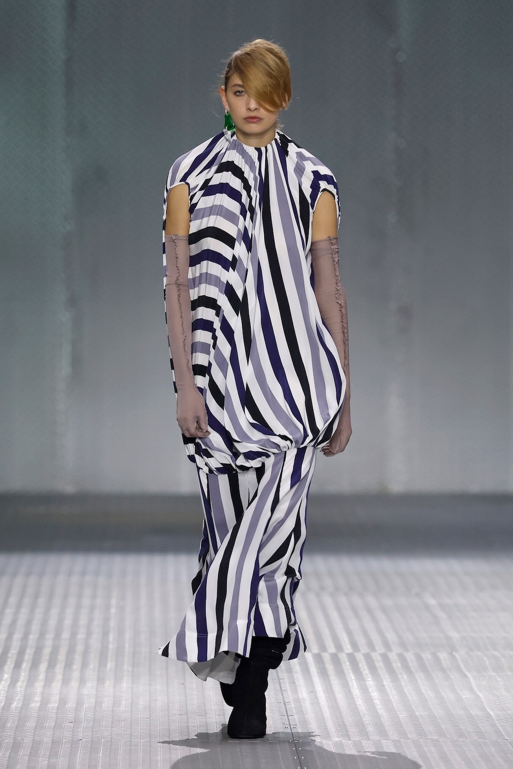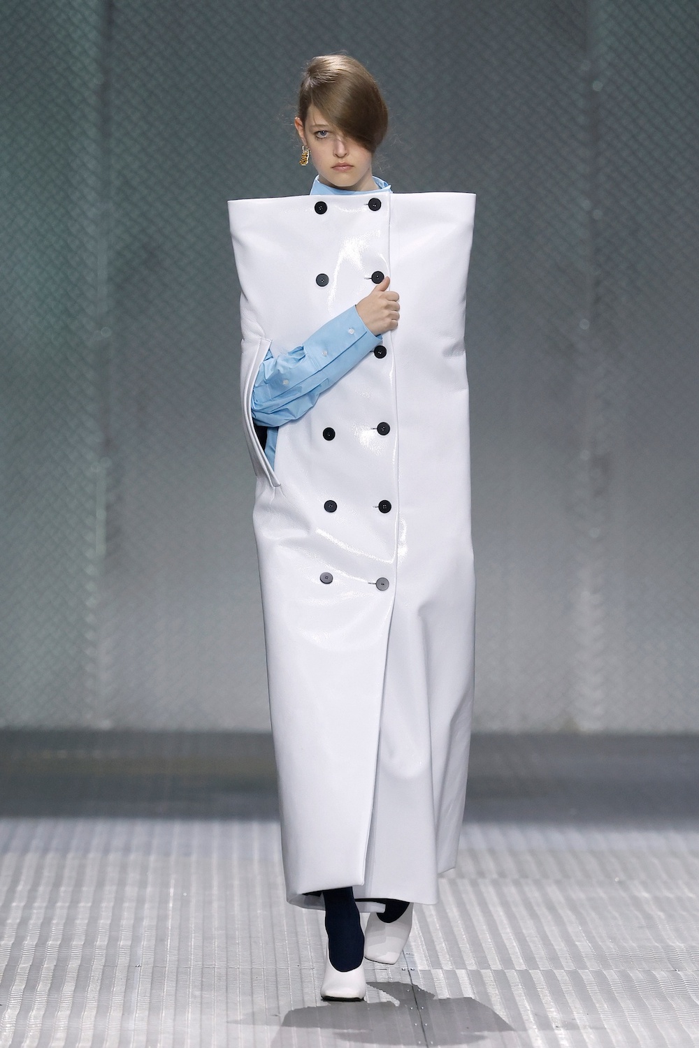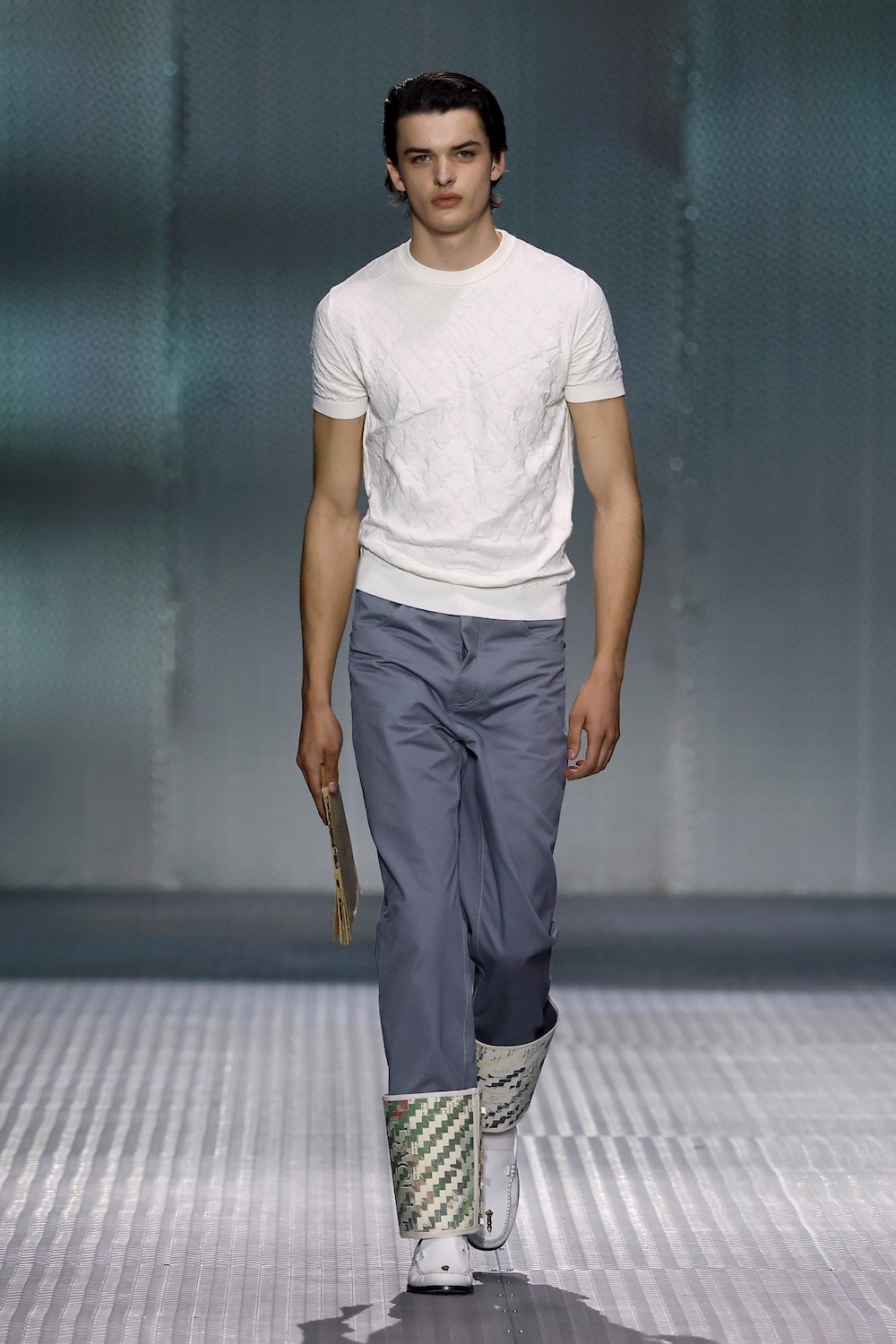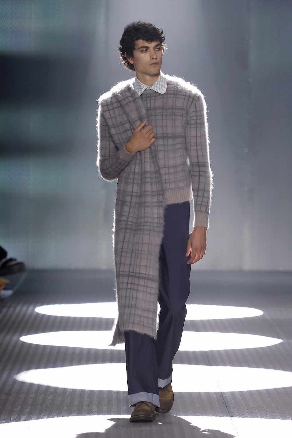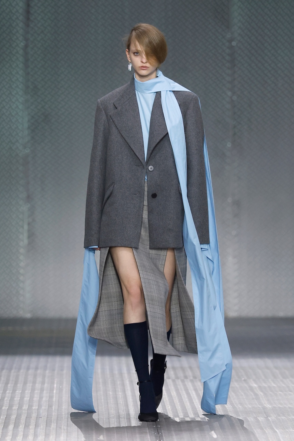Las prendas se caracterizaban por sus asimetrías marcadas, con partes delanteras más cortas, espaldas alargadas y proporciones inesperadas, lo cual generaba movimiento y tensión visual. La sastrería clásica dialogaba con los tejidos creados a partir de retales, como si la materia estuviera aún pasando por un proceso de definición. El esmoquin como eje central se reinterpretaba en un lenguaje moderno, en el que la formalidad se flexibilizaba con un guiño sutil a la década de los sesenta.