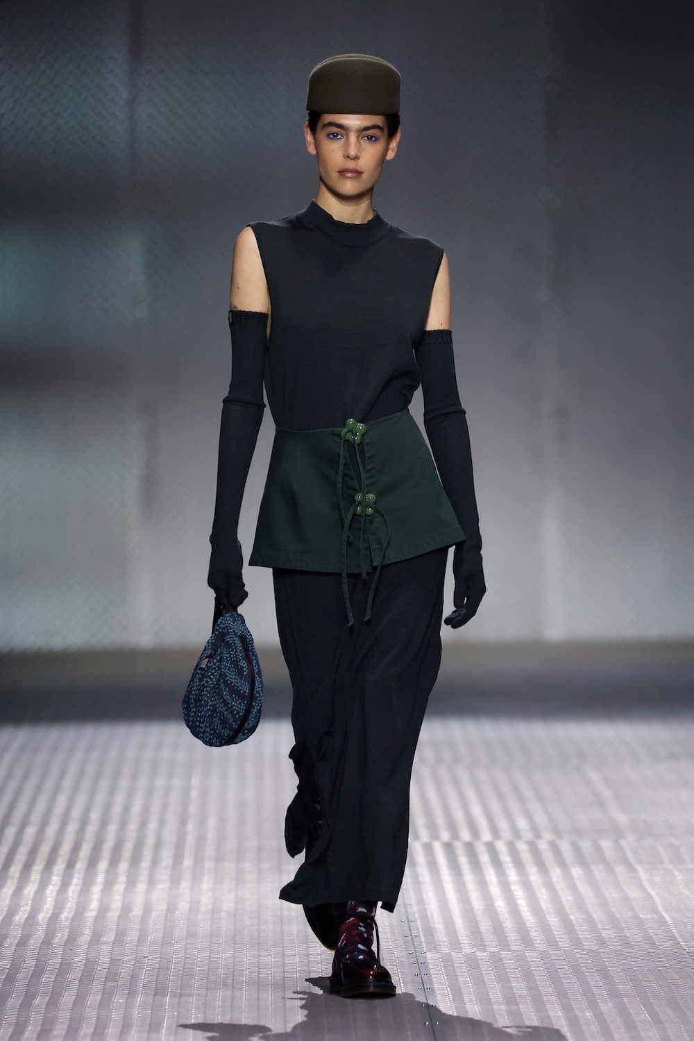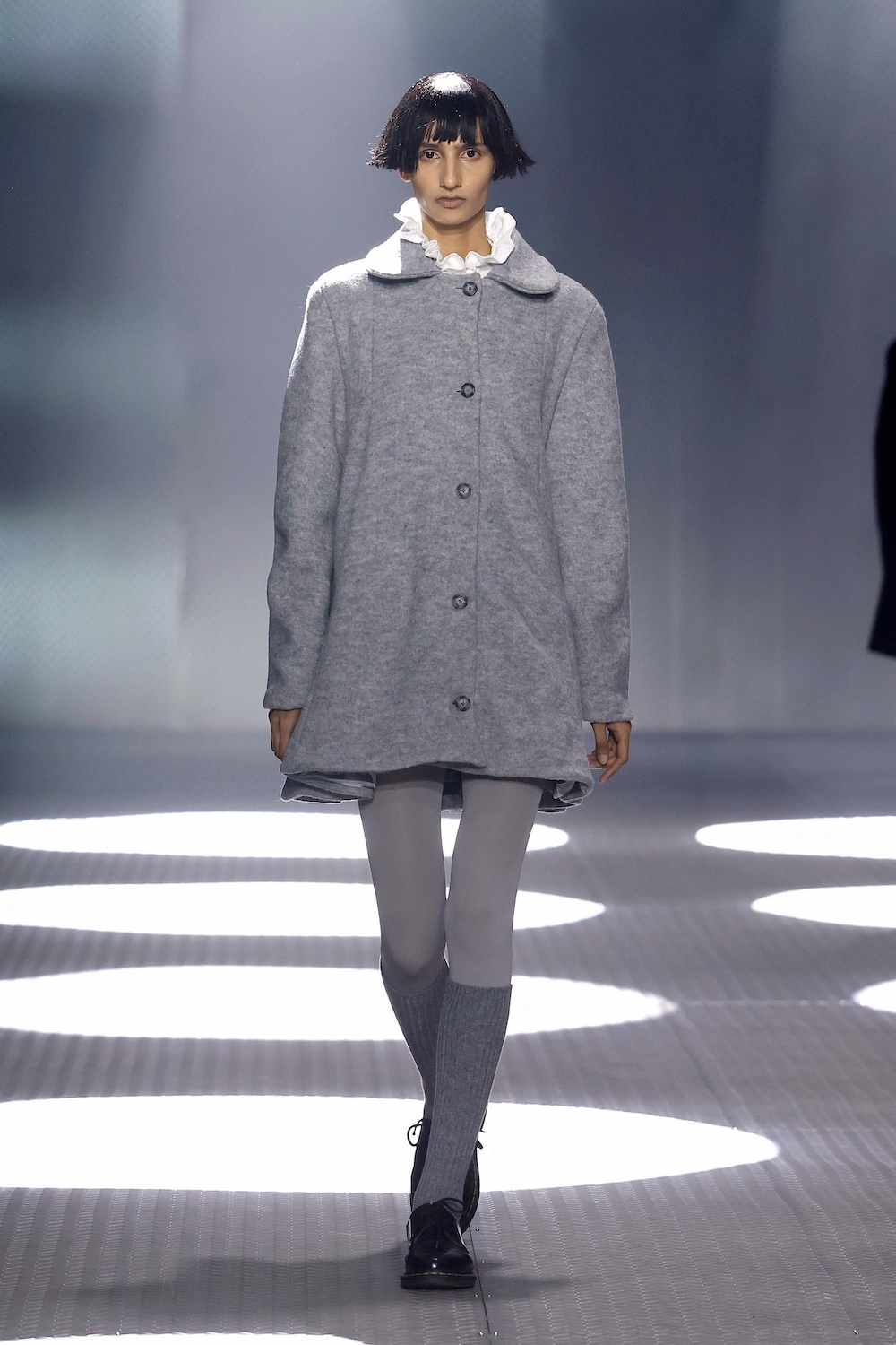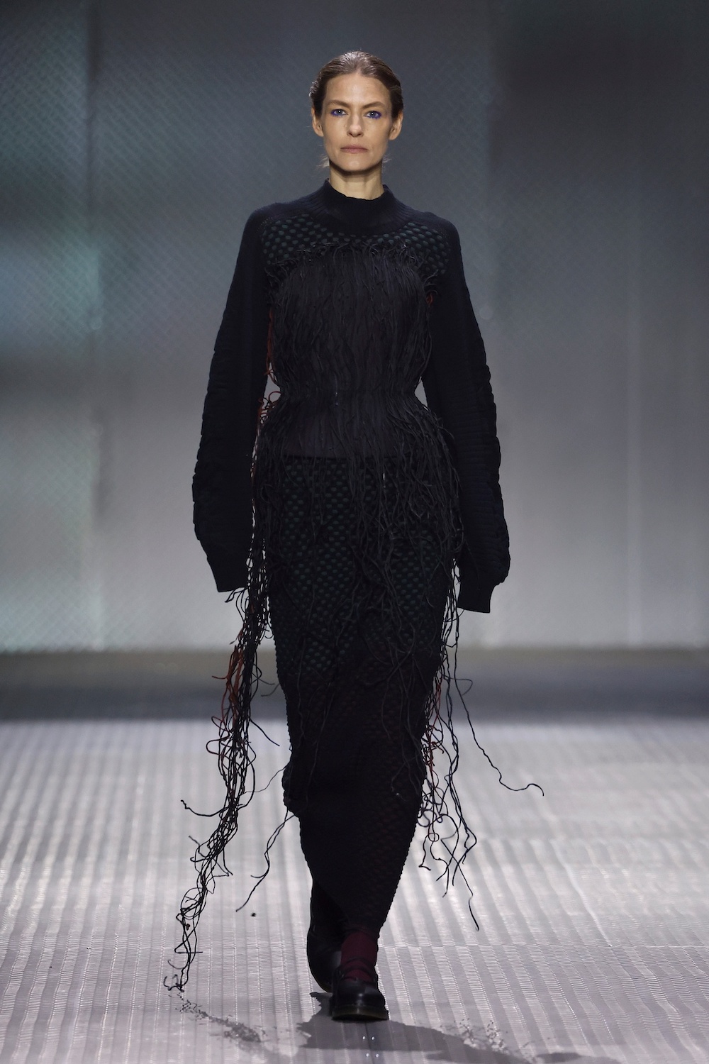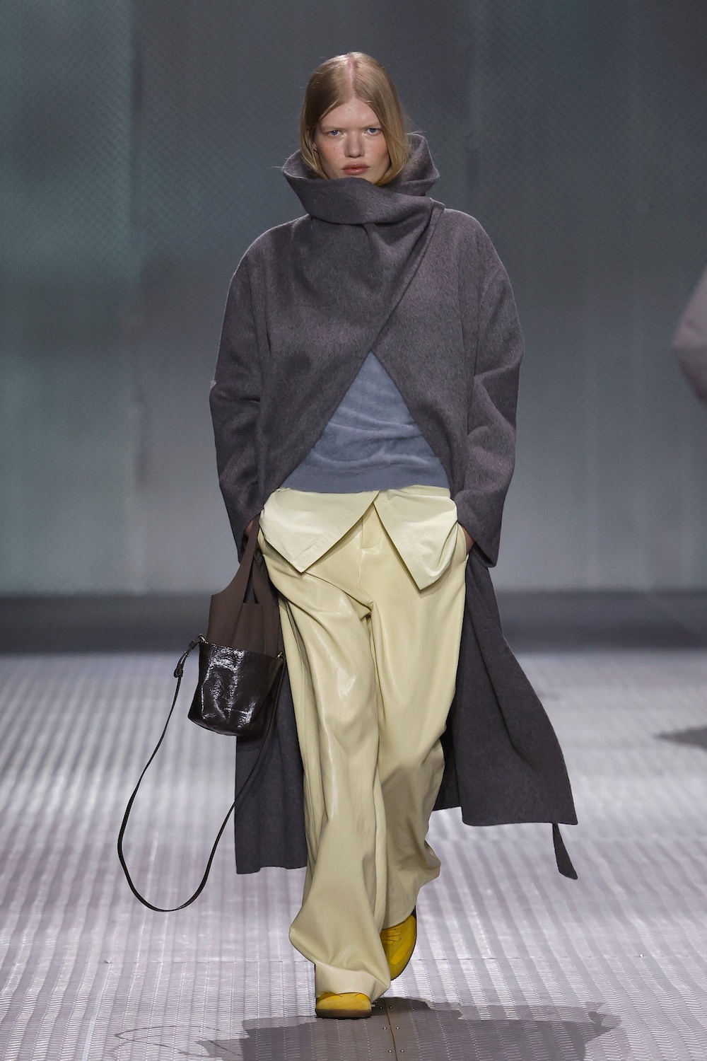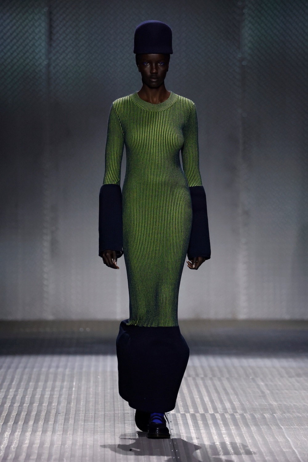 «Heritage» defendía el punto como un lenguaje en sí mismo a través de abrigos, chaquetas, jerséis de punto grueso, cárdigans y vestidos que definían la silueta. Las estructuras realizadas a mano, las texturas densas y los volúmenes equilibrados resaltaban la artesanía, con cuellos envolventes y mangas anchas que proporcionaban estructura. La paleta combinaba colores de tierra y verdes que evocaban la naturaleza, con toques de colores primarios que brindaban energía y contraste. Una colección que celebraba la comunidad y el conocimiento compartido, posicionando así el punto como una categoría estratégica.