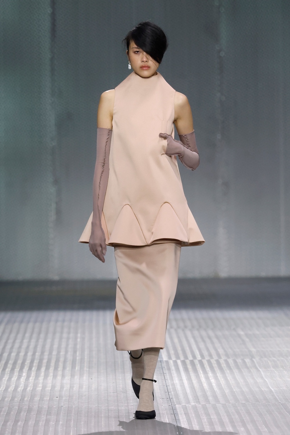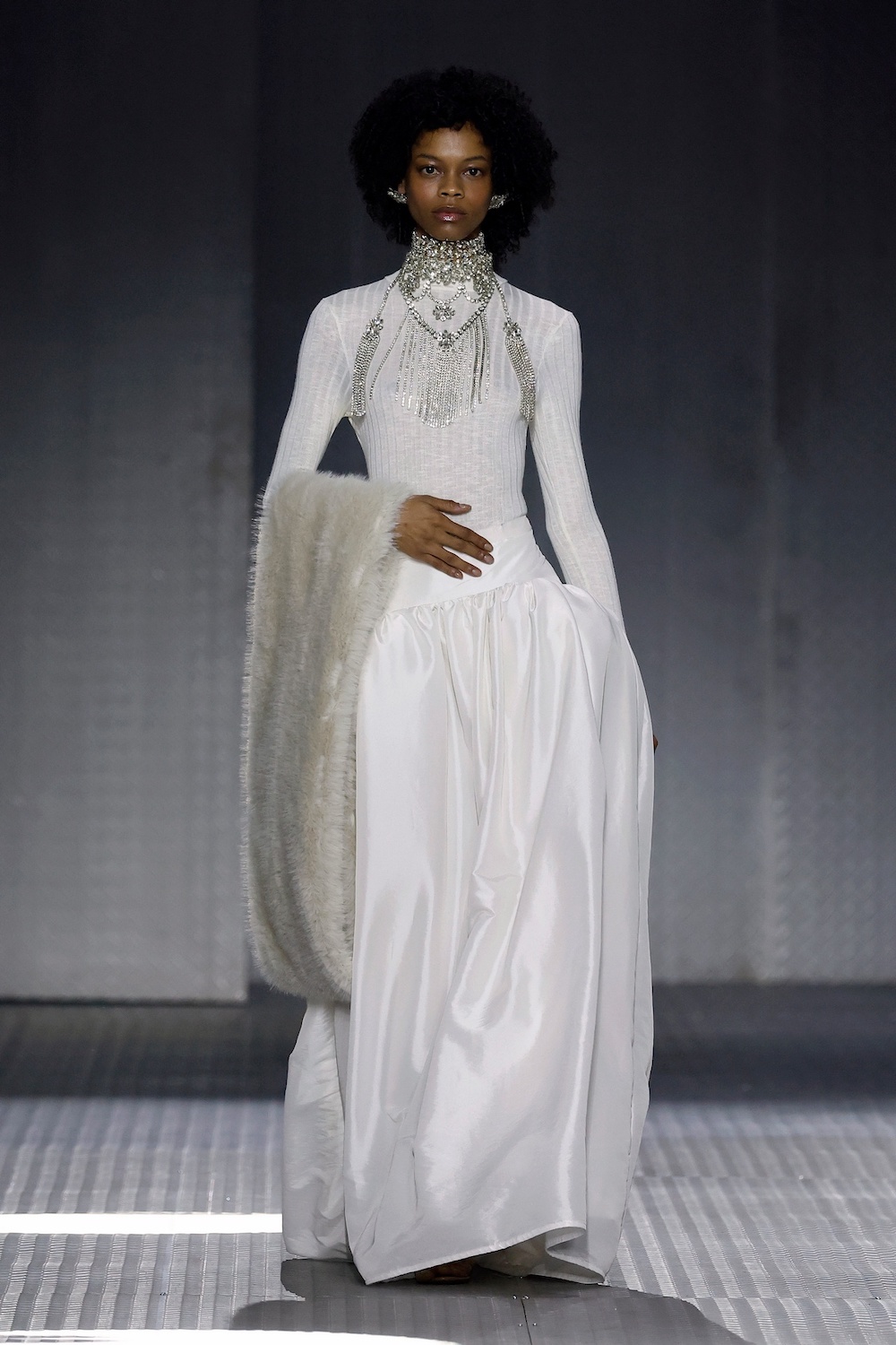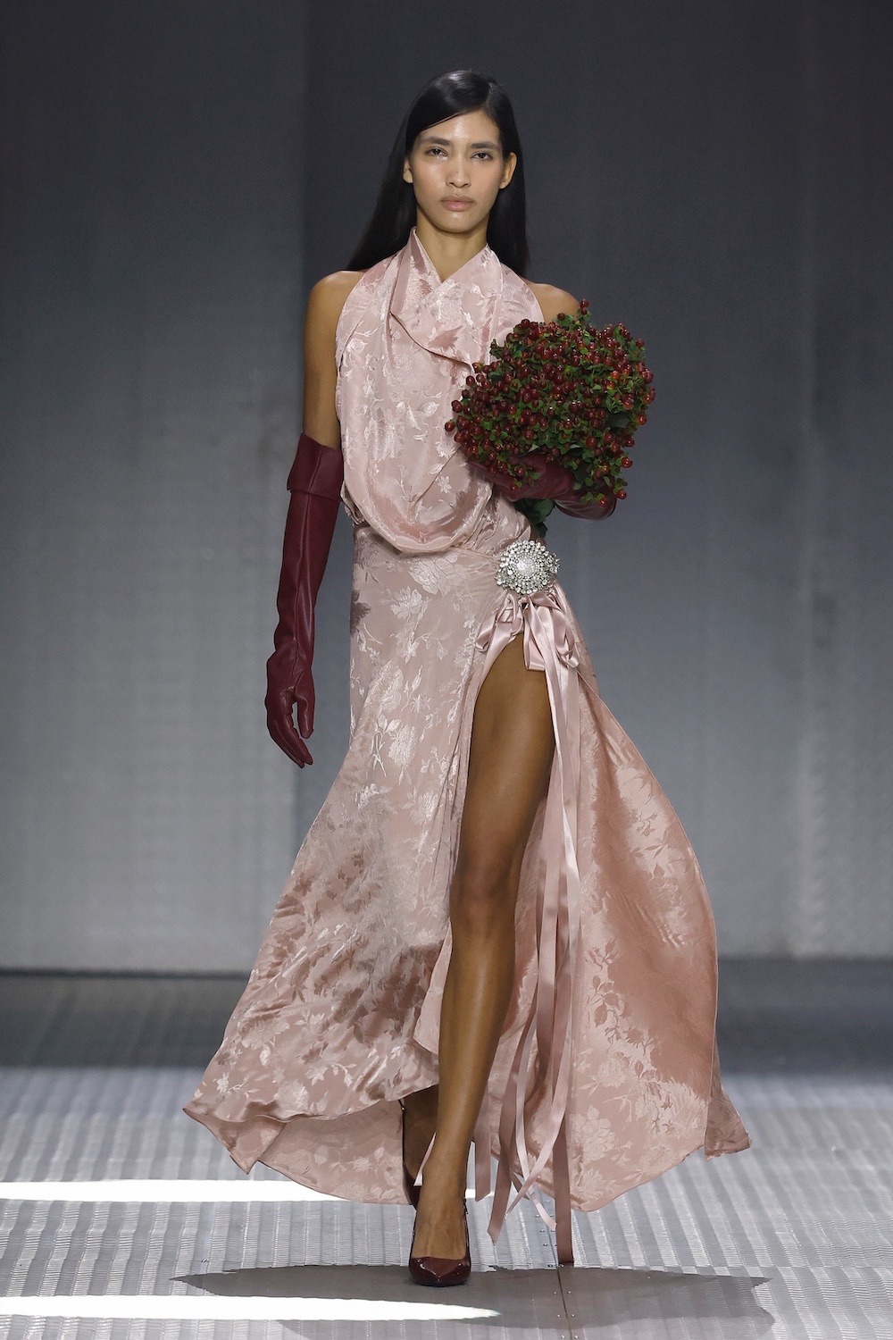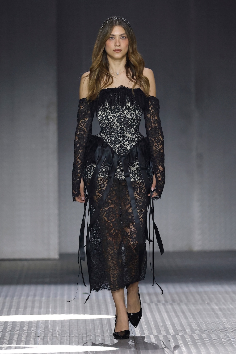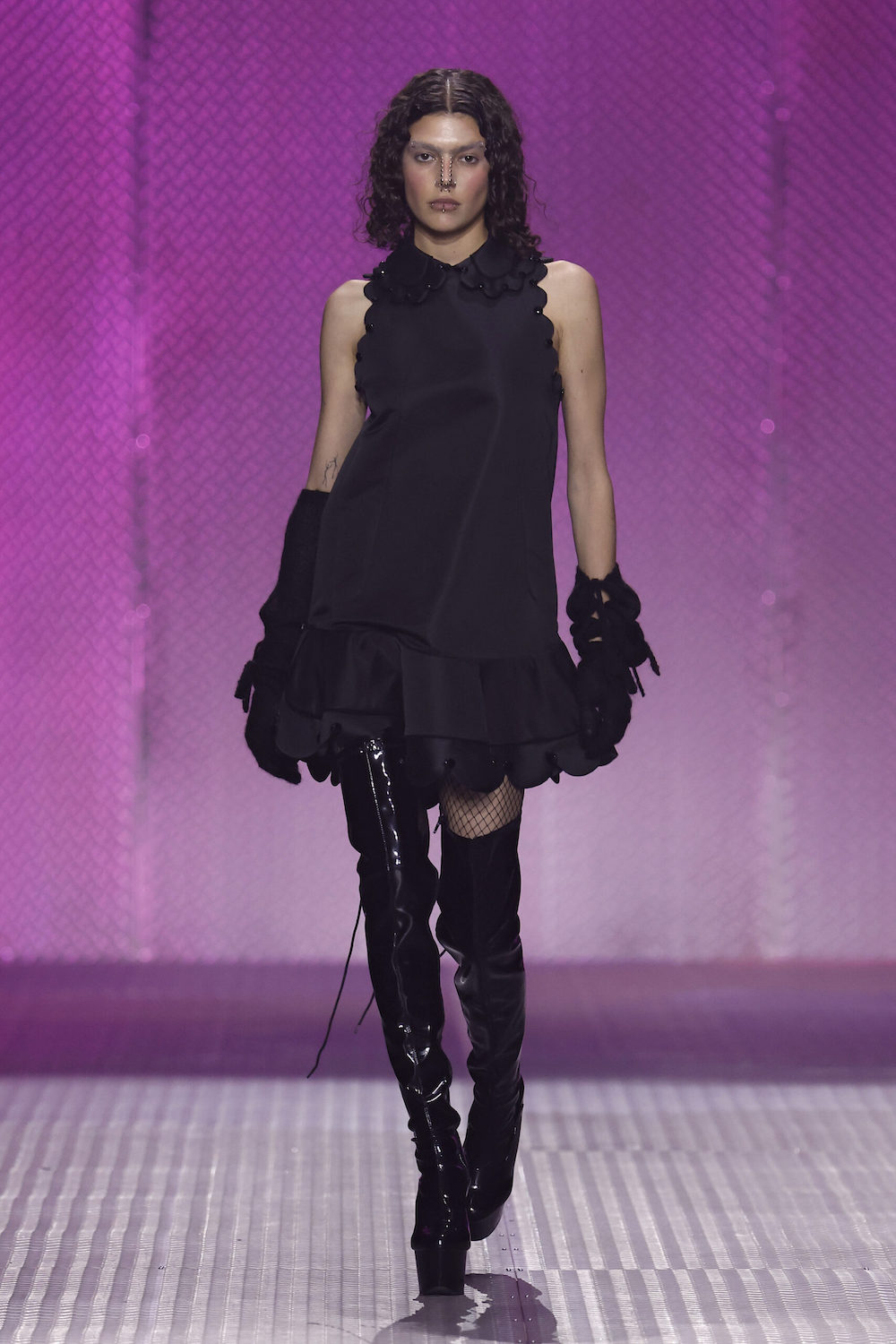 Siluetas versátiles y sin jerarquías de género combinaban materiales diarios —popelinas y algodones— con texturas nocturnas —chantilly, tul y pieles artificiales— en una gama de rosas, granates y tonos oscuros que generaba un equilibrio entre inocencia y teatralidad.