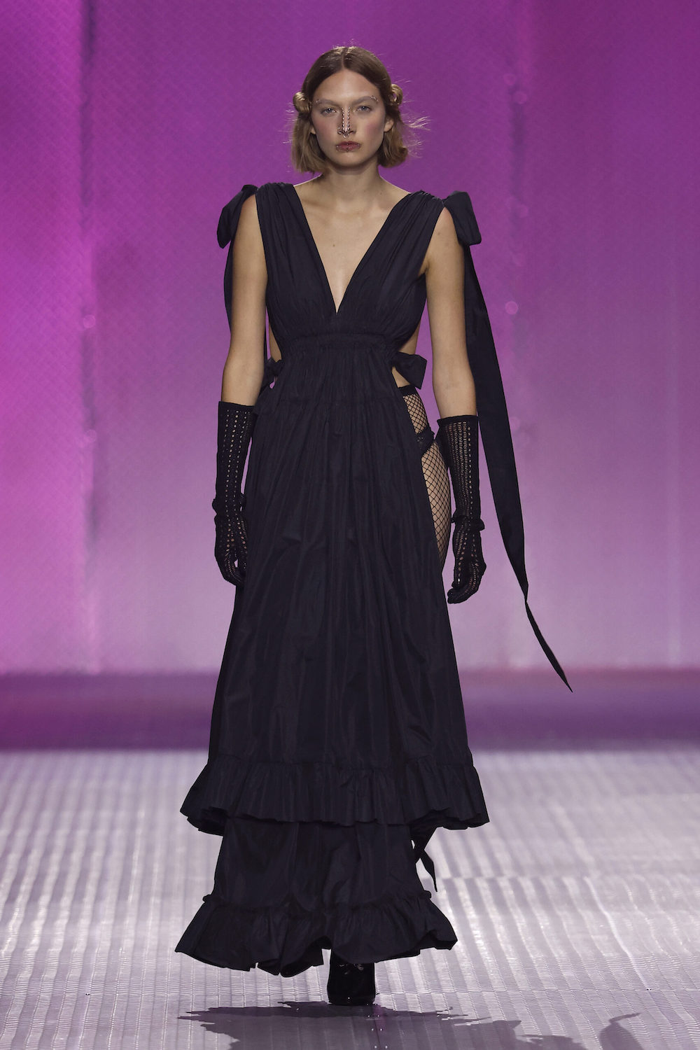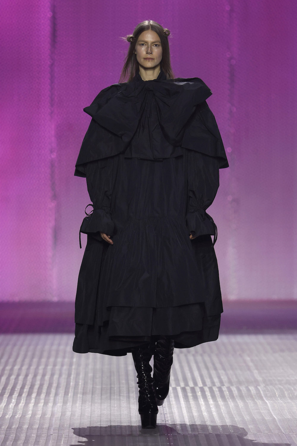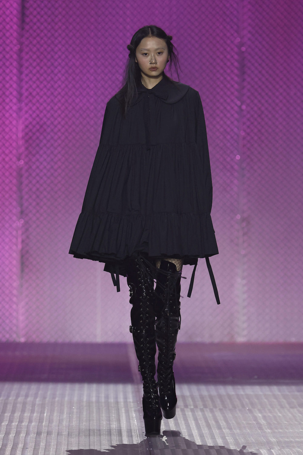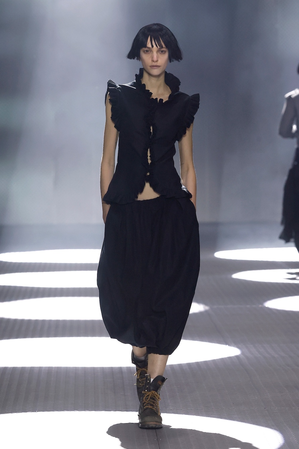 Siluetas versátiles y sin jerarquías de género combinaban materiales diarios —popelinas y algodones— con texturas nocturnas —chantilly, tul y pieles artificiales— en una gama de rosas, granates y tonos oscuros que generaba un equilibrio entre inocencia y teatralidad.