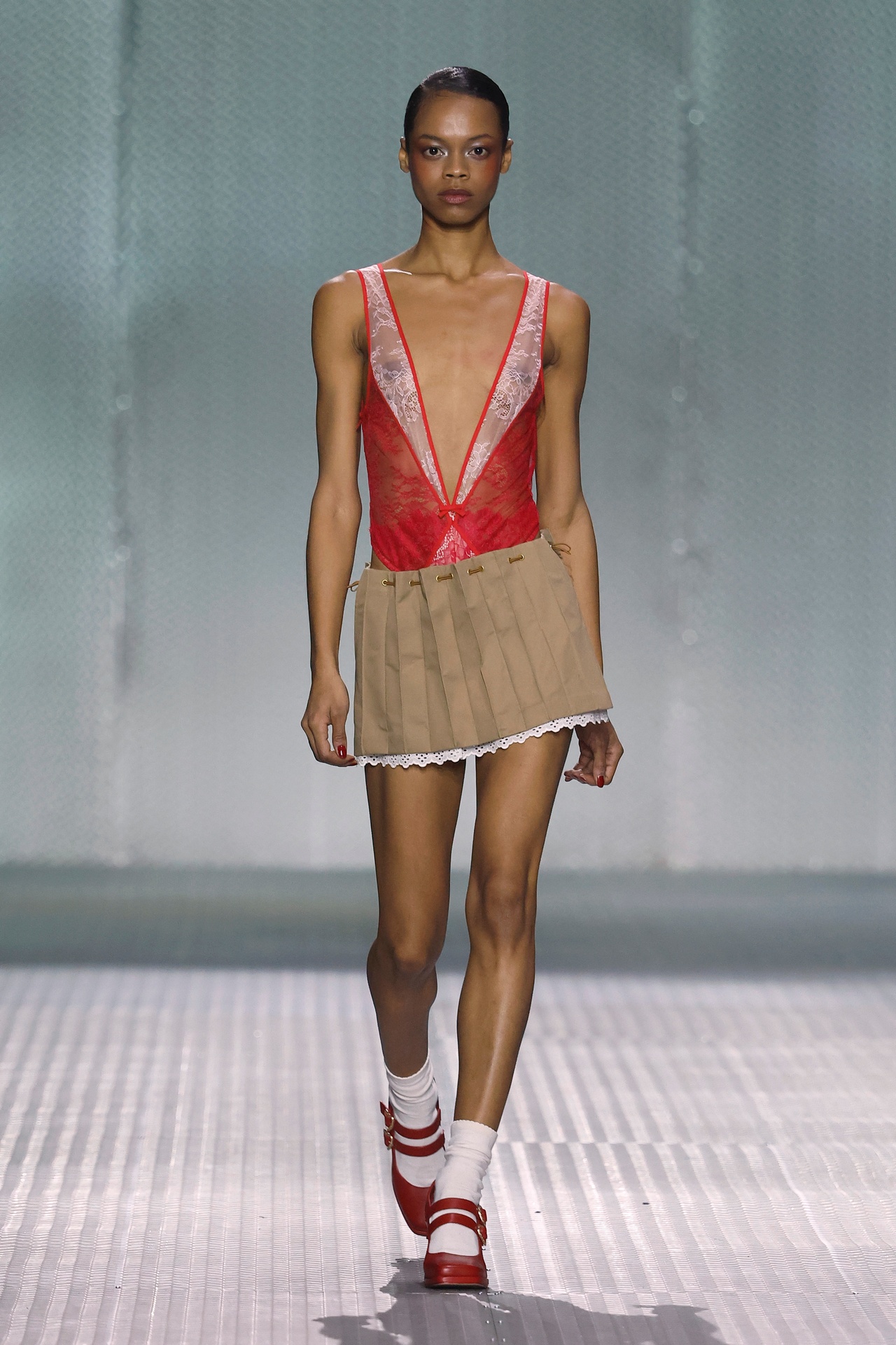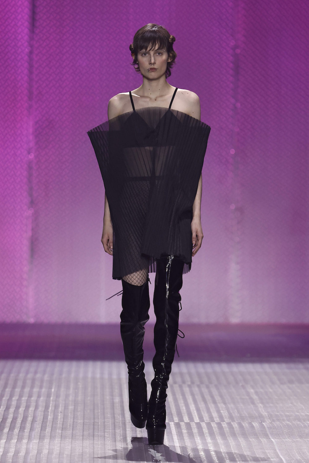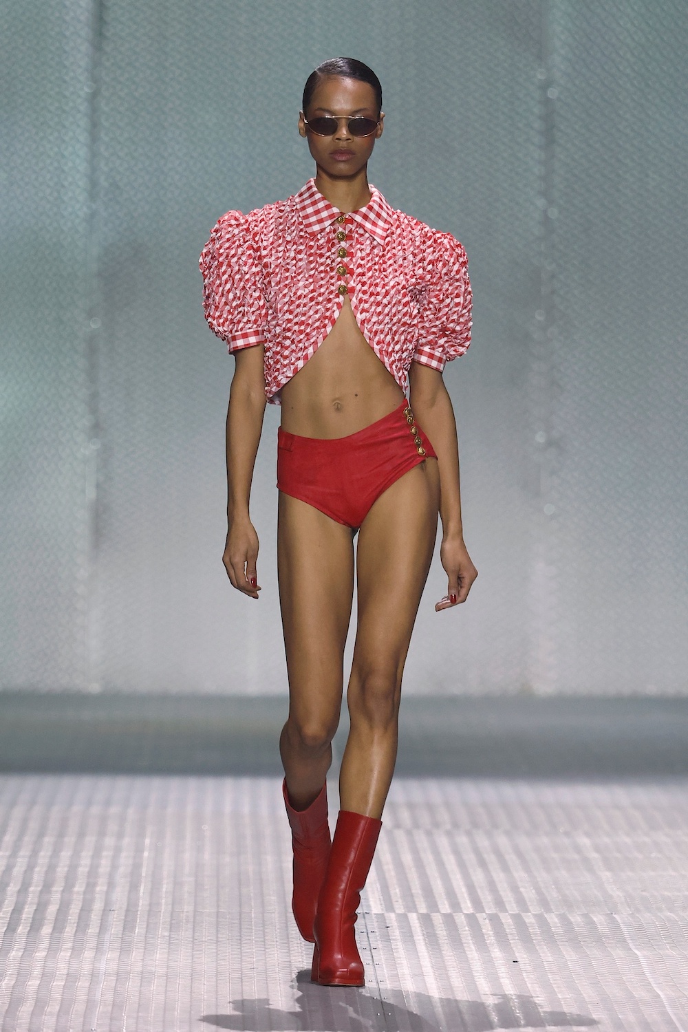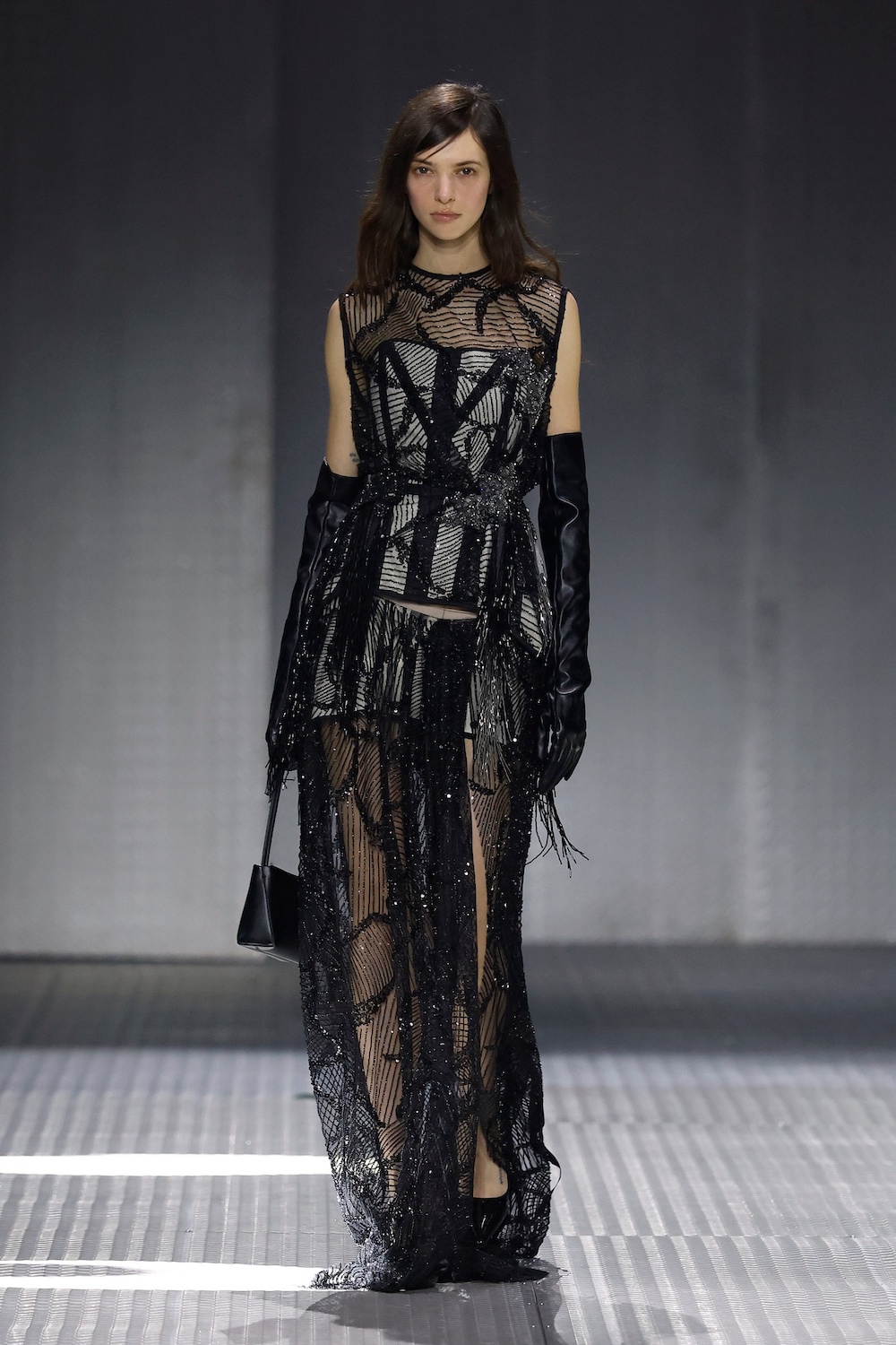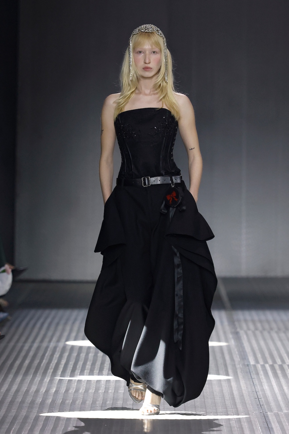 Siluetas versátiles y sin jerarquías de género combinaban materiales diarios —popelinas y algodones— con texturas nocturnas —chantilly, tul y pieles artificiales— en una gama de rosas, granates y tonos oscuros que generaba un equilibrio entre inocencia y teatralidad.