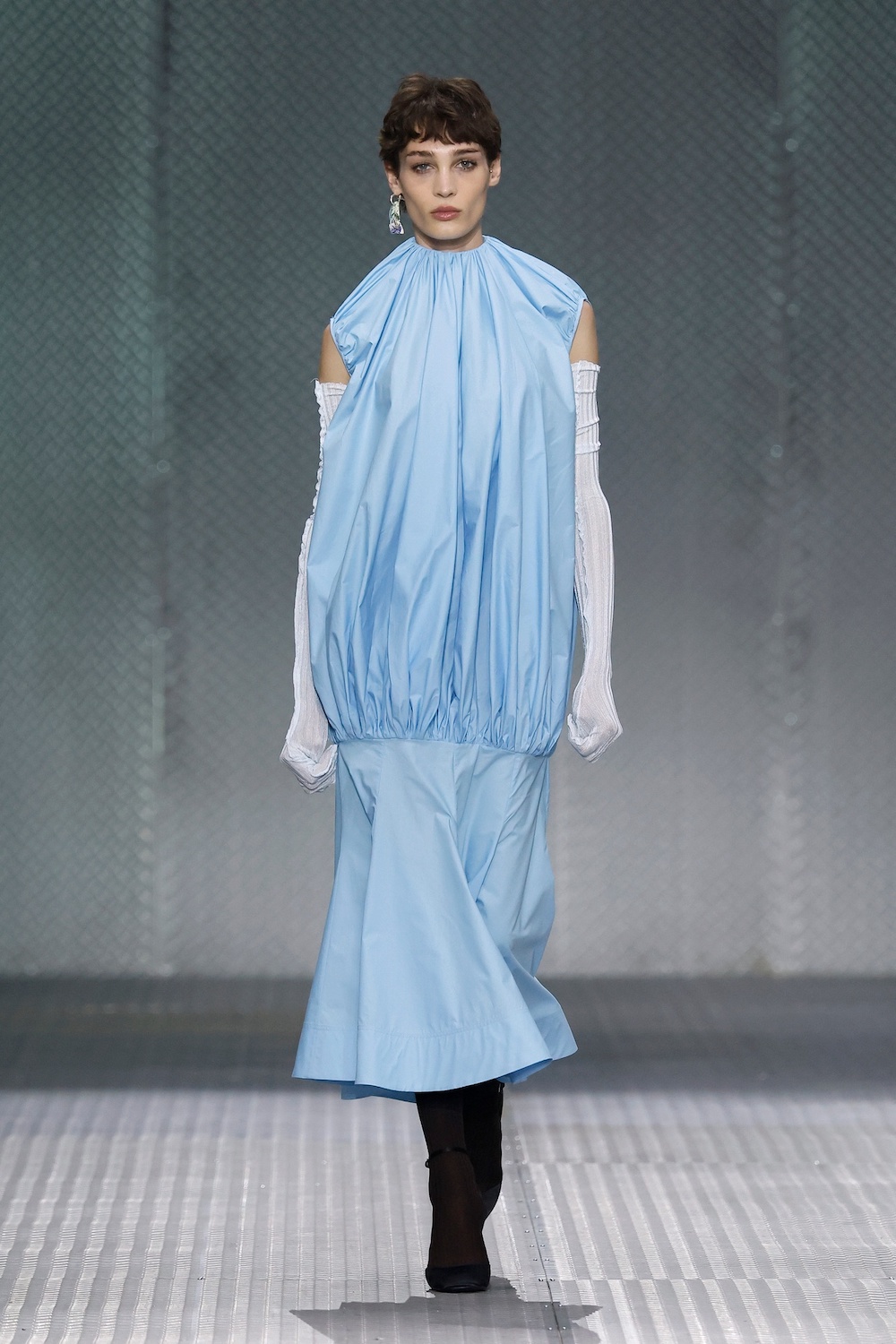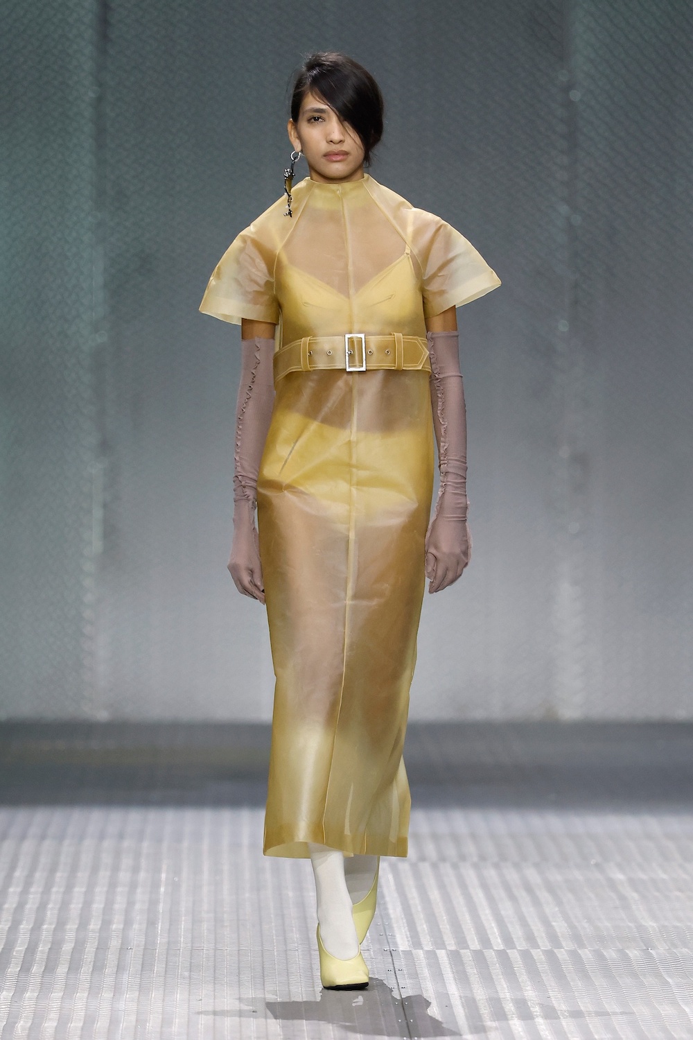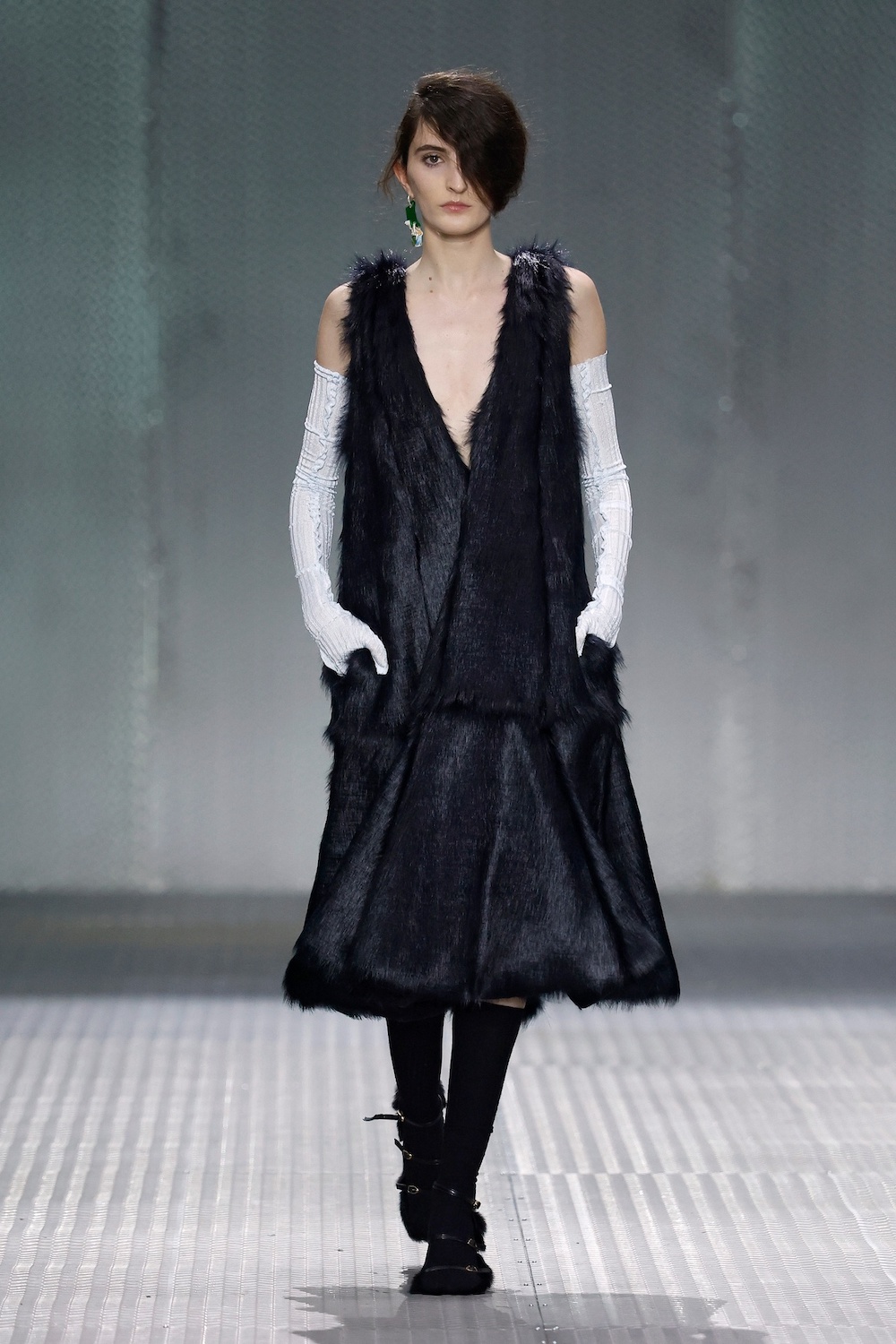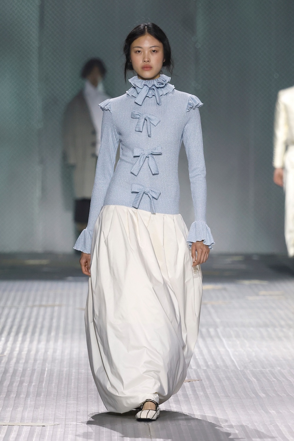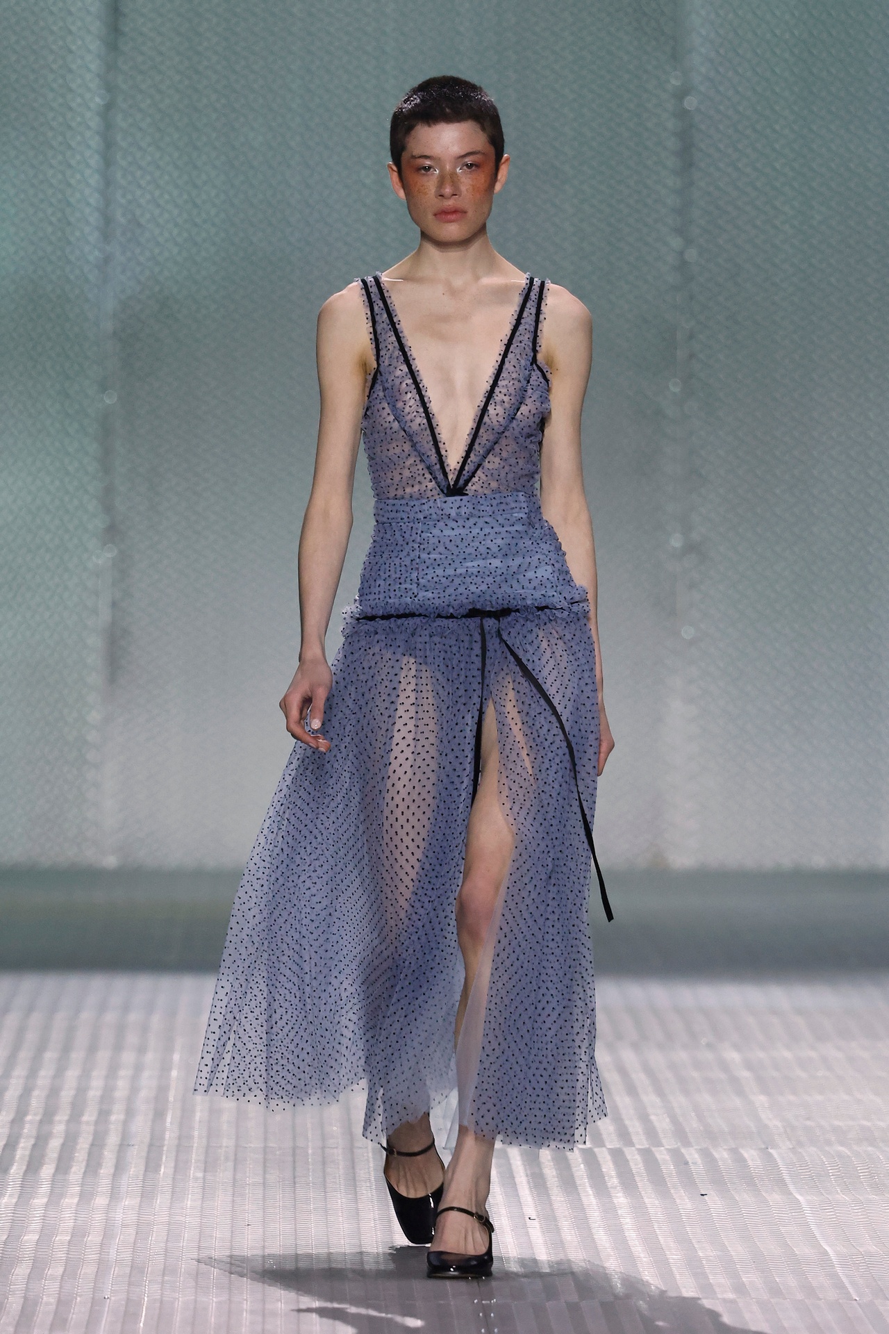 Siluetas versátiles y sin jerarquías de género combinaban materiales diarios —popelinas y algodones— con texturas nocturnas —chantilly, tul y pieles artificiales— en una gama de rosas, granates y tonos oscuros que generaba un equilibrio entre inocencia y teatralidad.