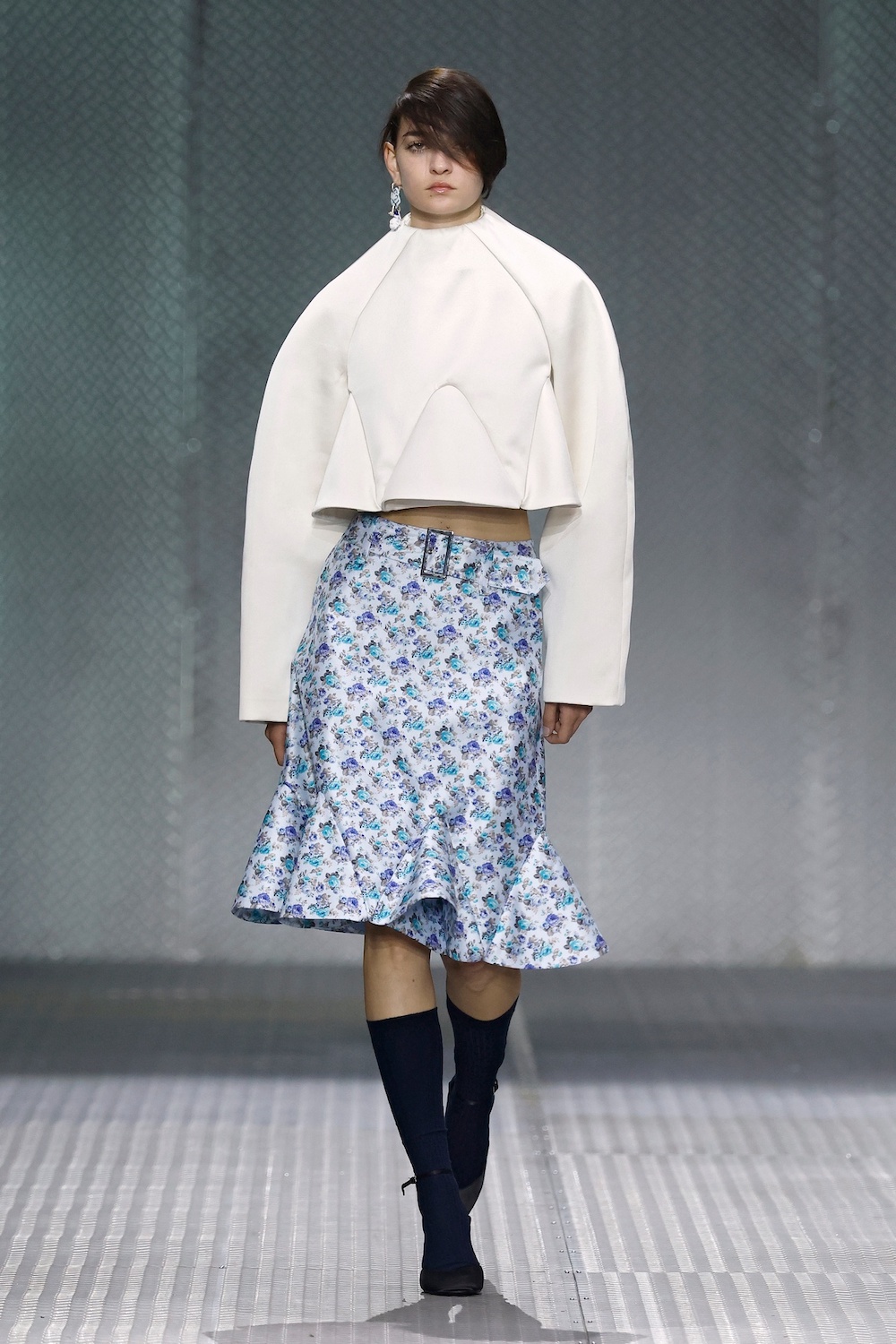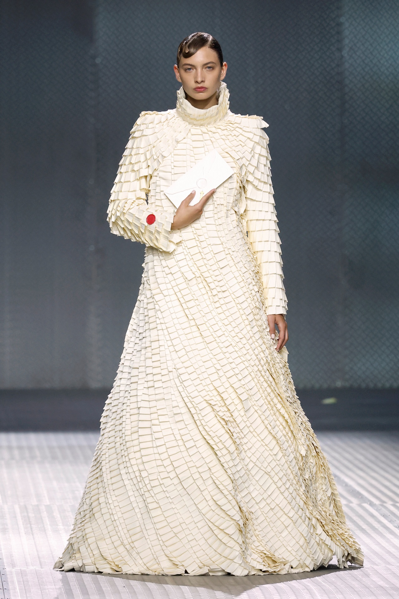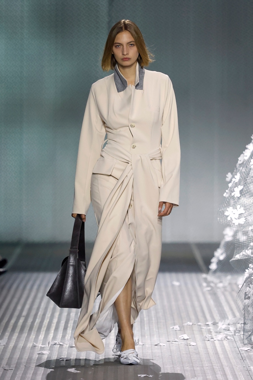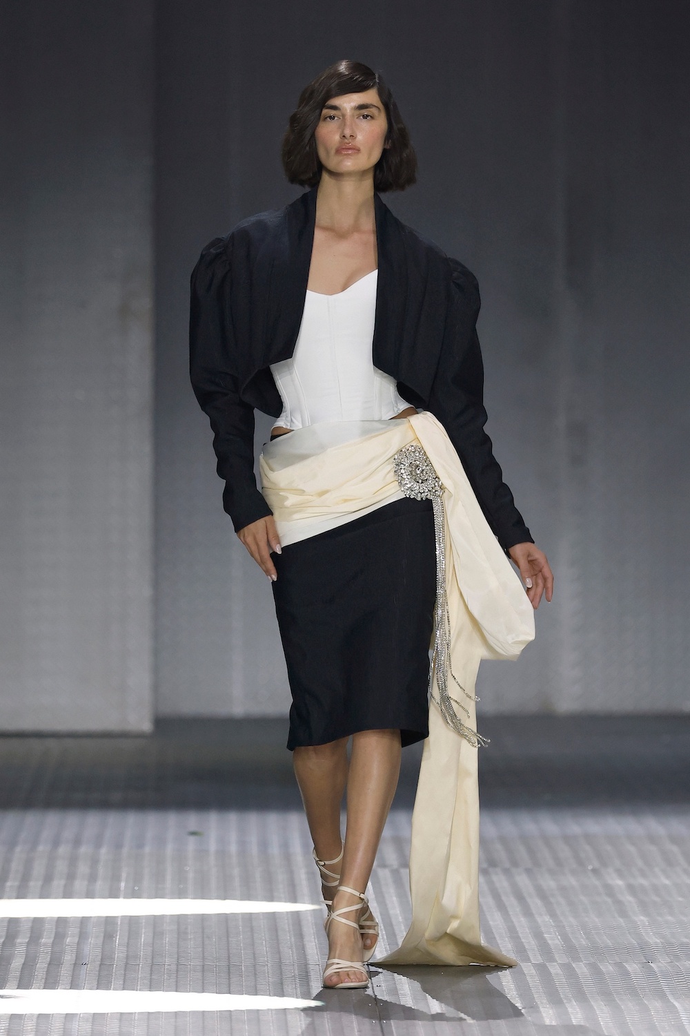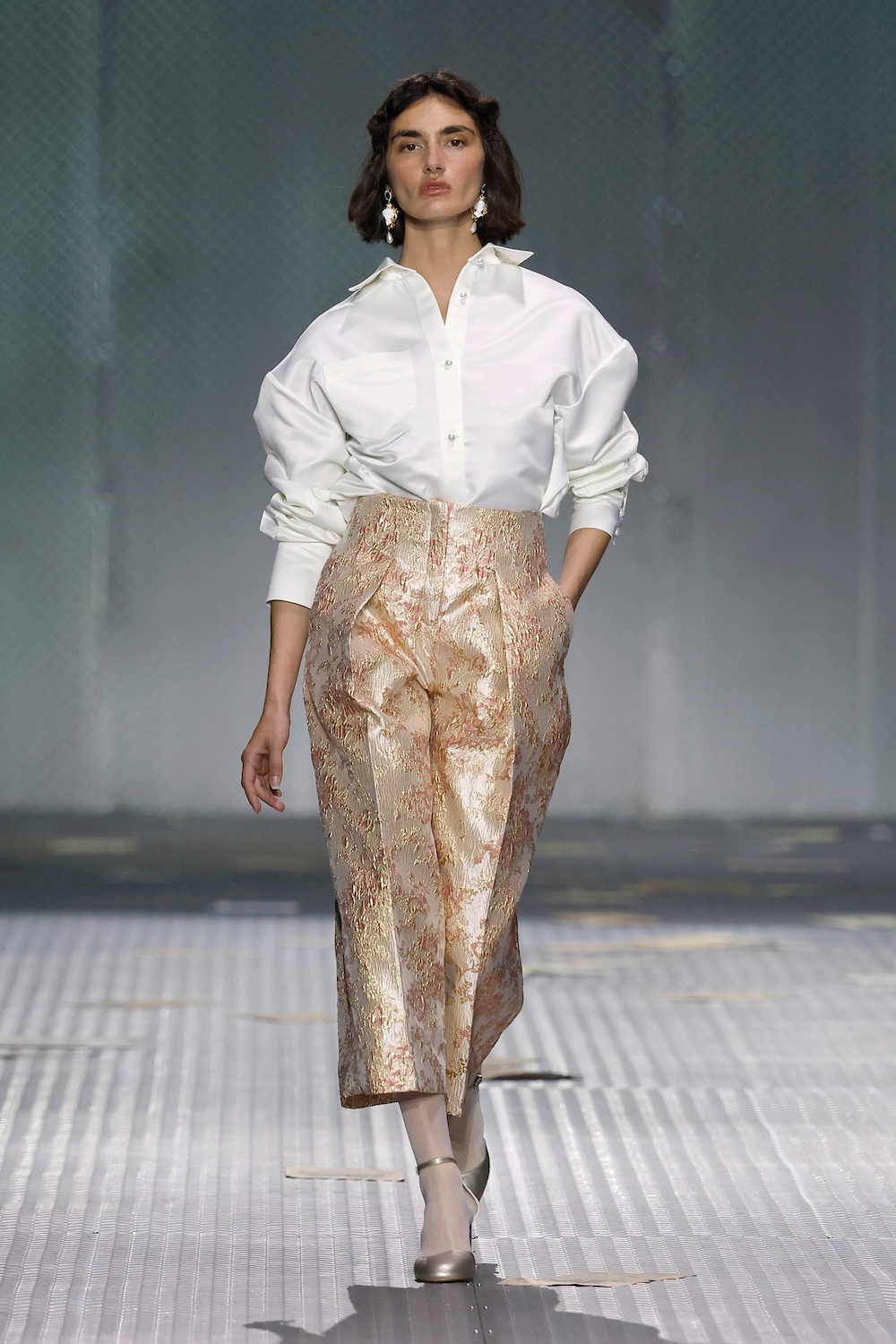 Las herramientas del oficio —reglas, cintas métricas y escuadras— se transformaban en motivos gráficos y estampados, mientras que la magnolia, el árbol favorito de Adolfo, aparecía en un estampado fotográfico que capturaba la belleza fugaz del momento. La colección celebraba su número 50 con detalles ocultos que resaltaban la historia de la casa.