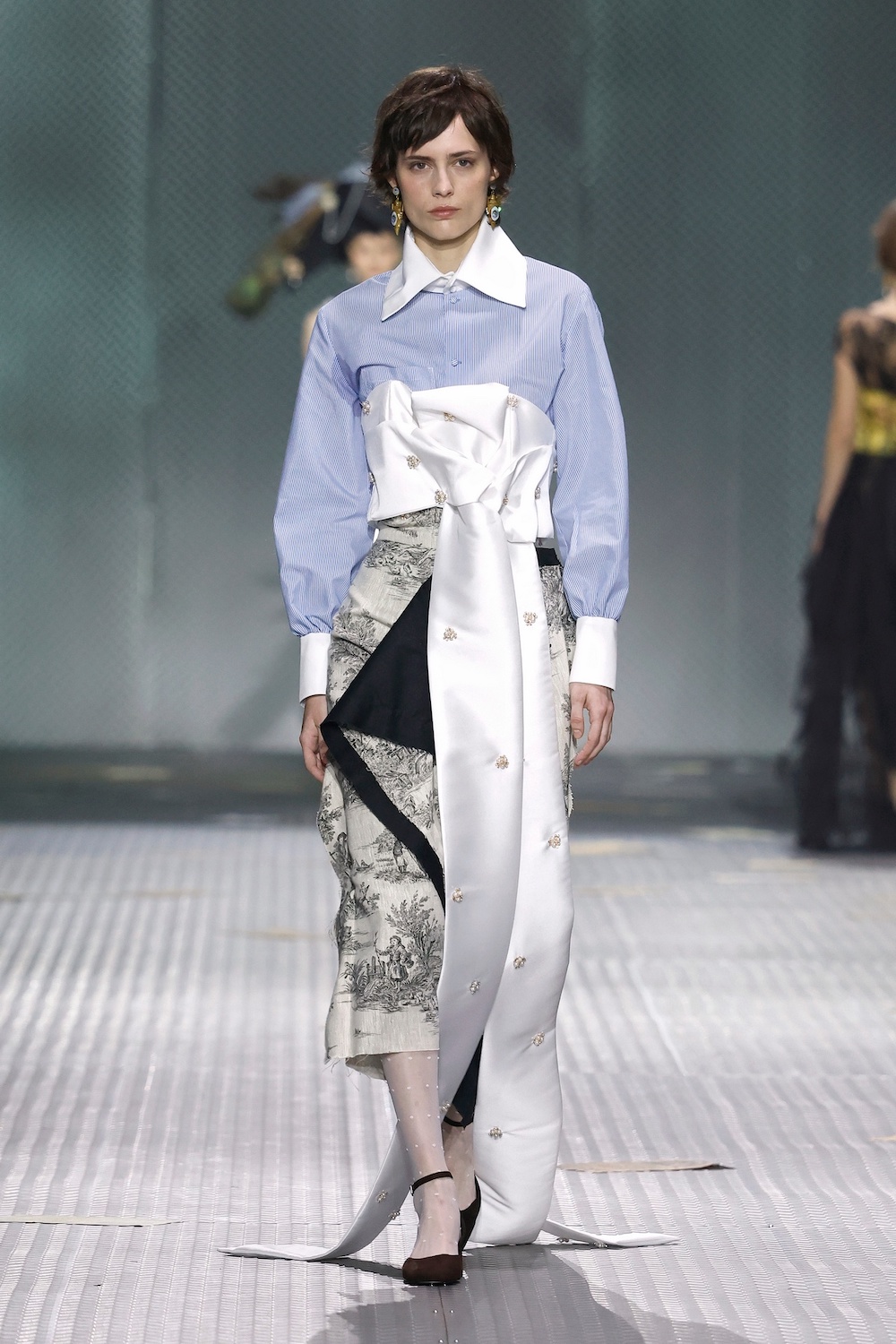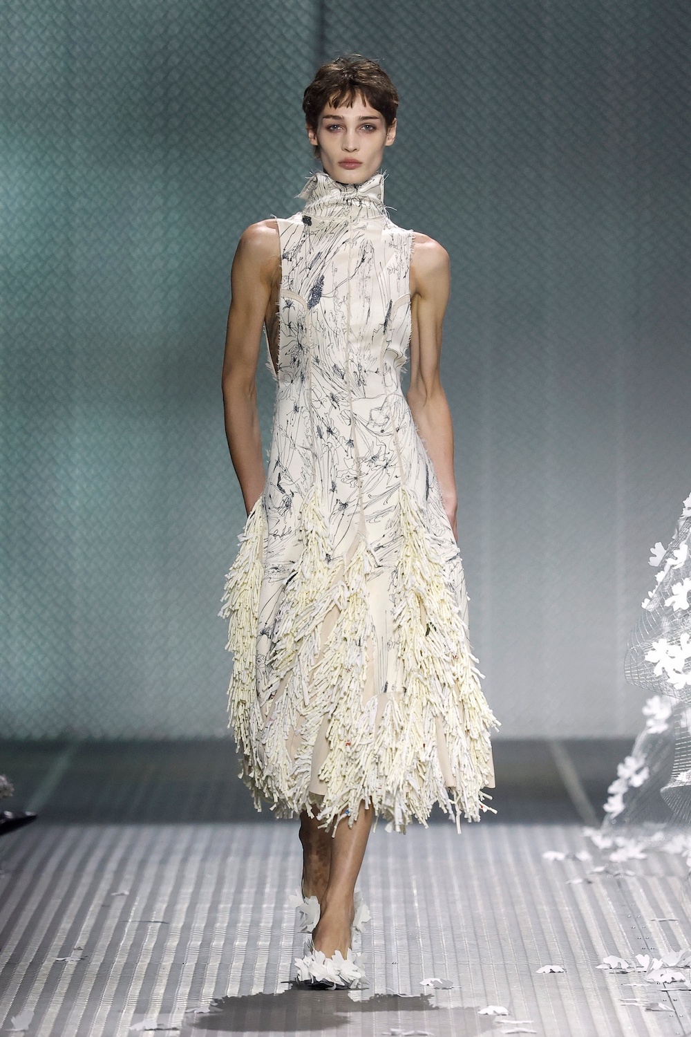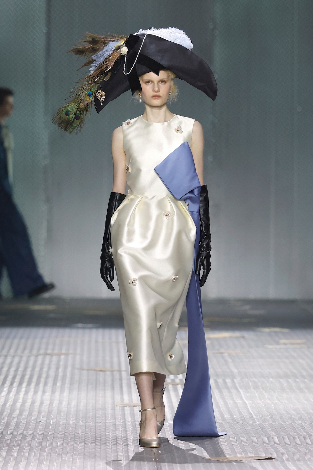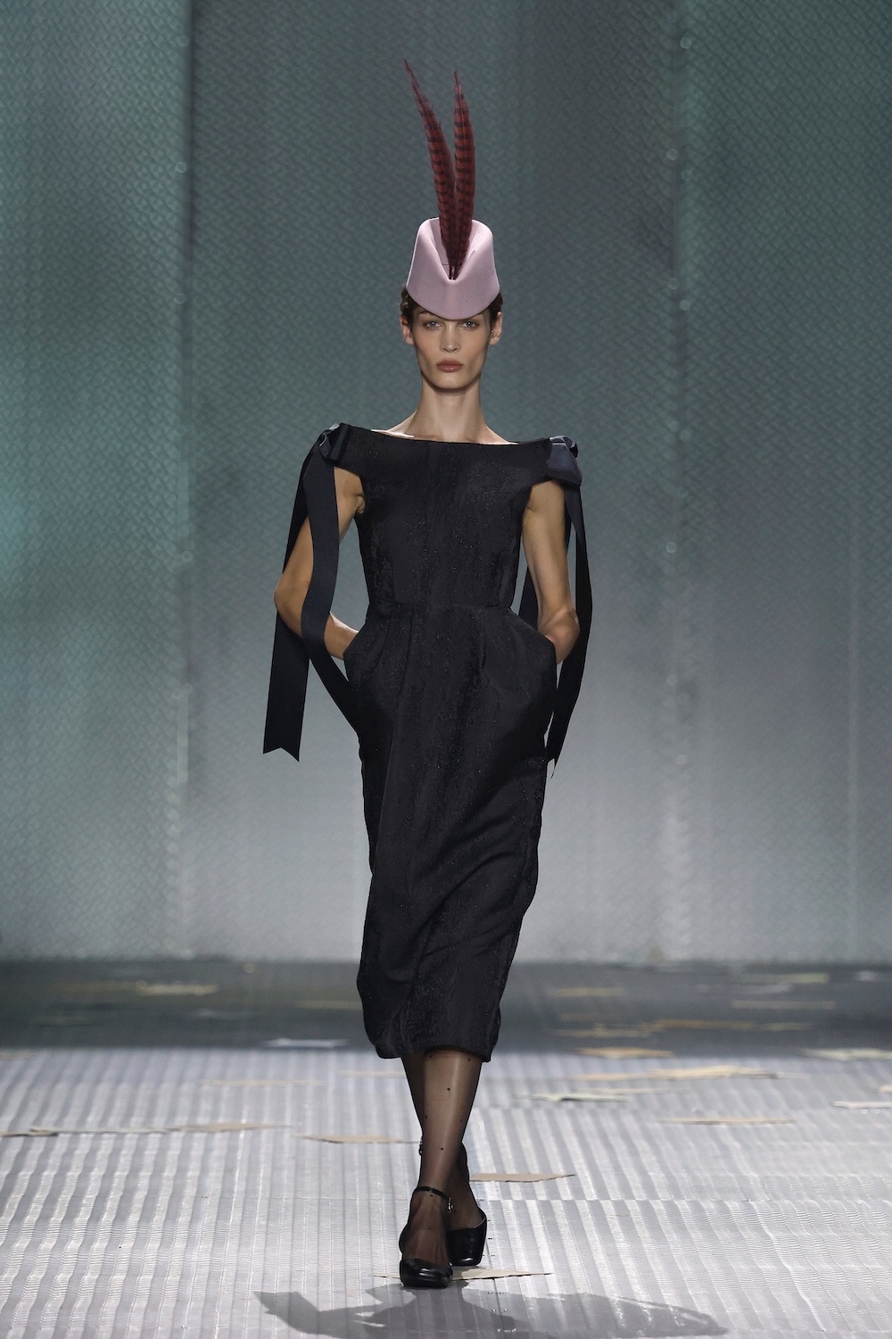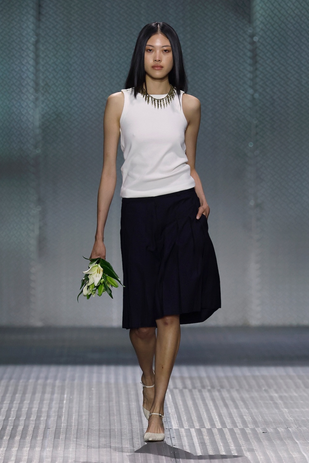 Las herramientas del oficio —reglas, cintas métricas y escuadras— se transformaban en motivos gráficos y estampados, mientras que la magnolia, el árbol favorito de Adolfo, aparecía en un estampado fotográfico que capturaba la belleza fugaz del momento. La colección celebraba su número 50 con detalles ocultos que resaltaban la historia de la casa.
