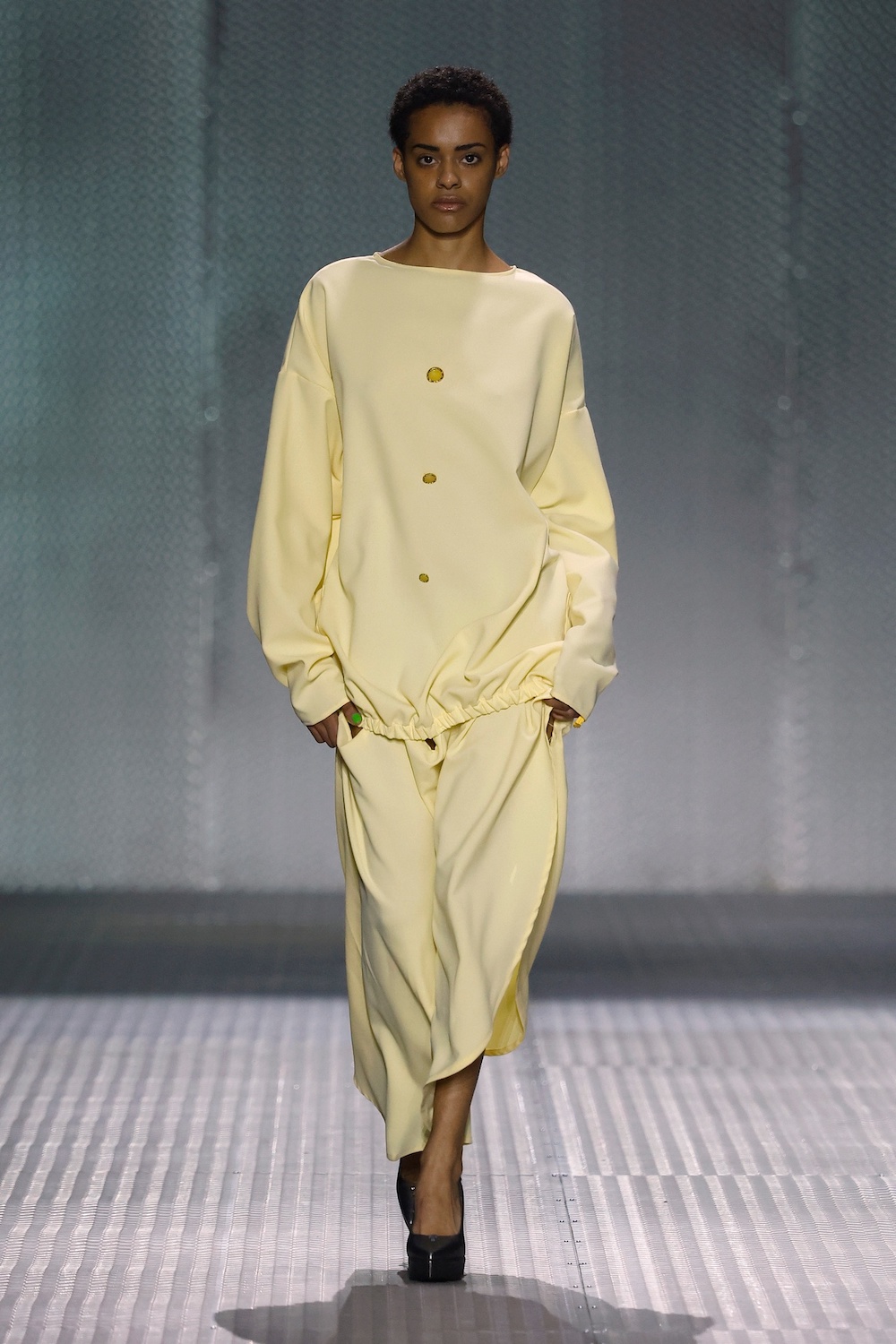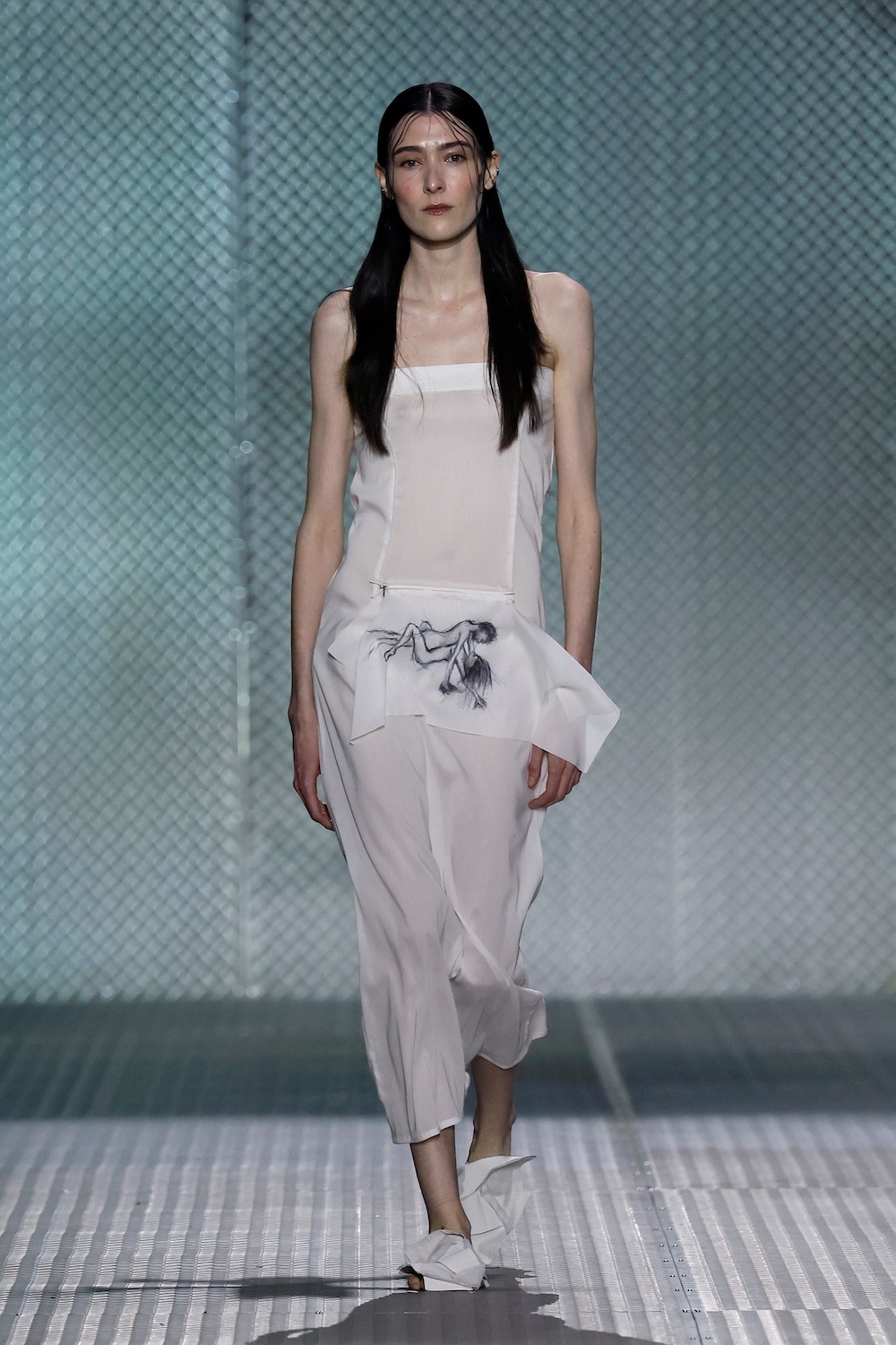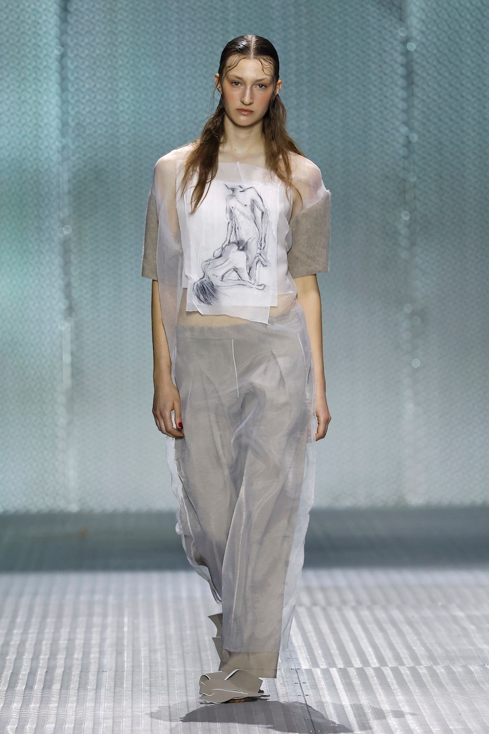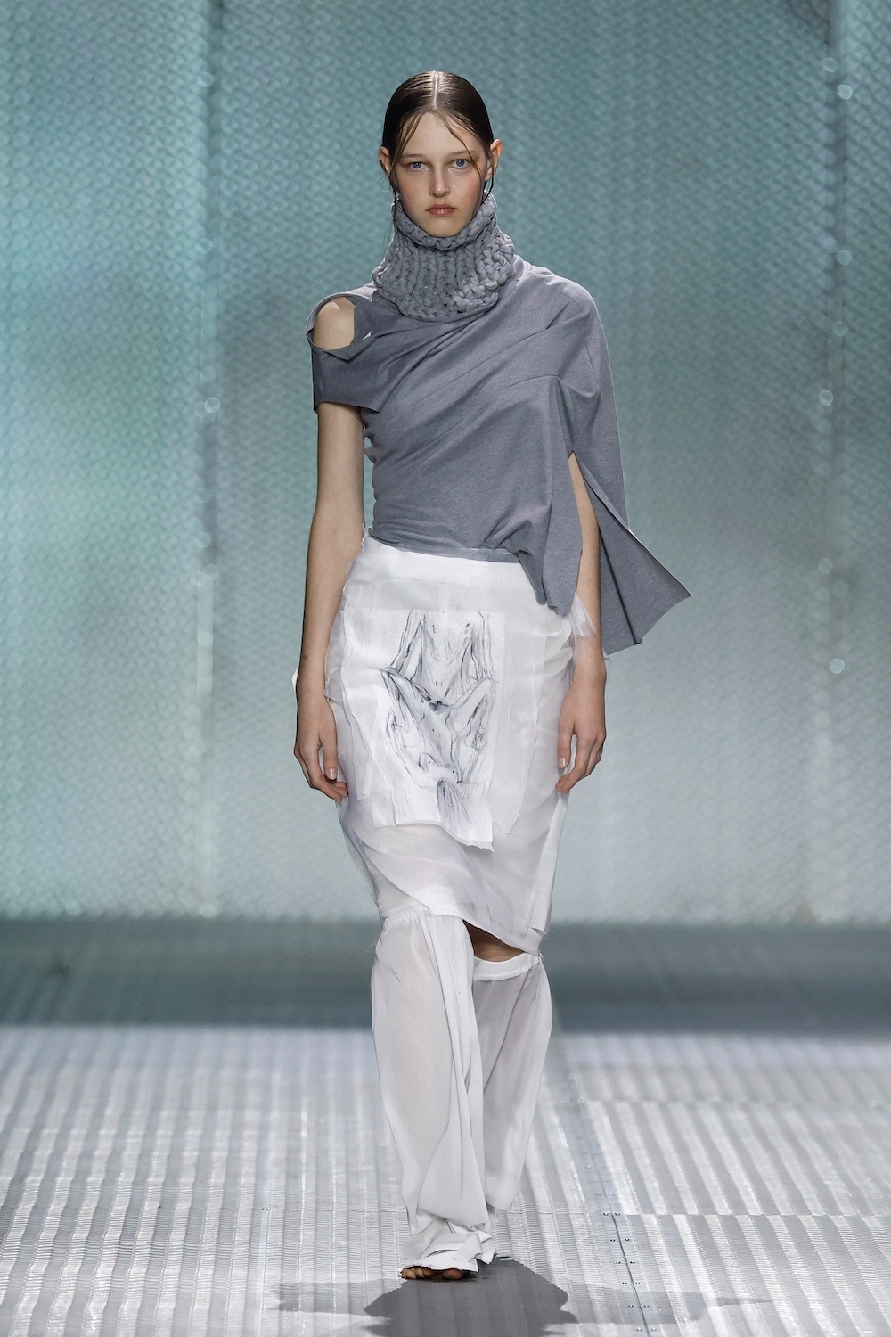 Siluetas minimalistas, desestructuraciones y una gama contrastada entre blancos puros, metalizados y tonos tierra conformaban piezas que jugaban con las capas, los volúmenes controlados y las ilustraciones de rostros a medio terminar.
