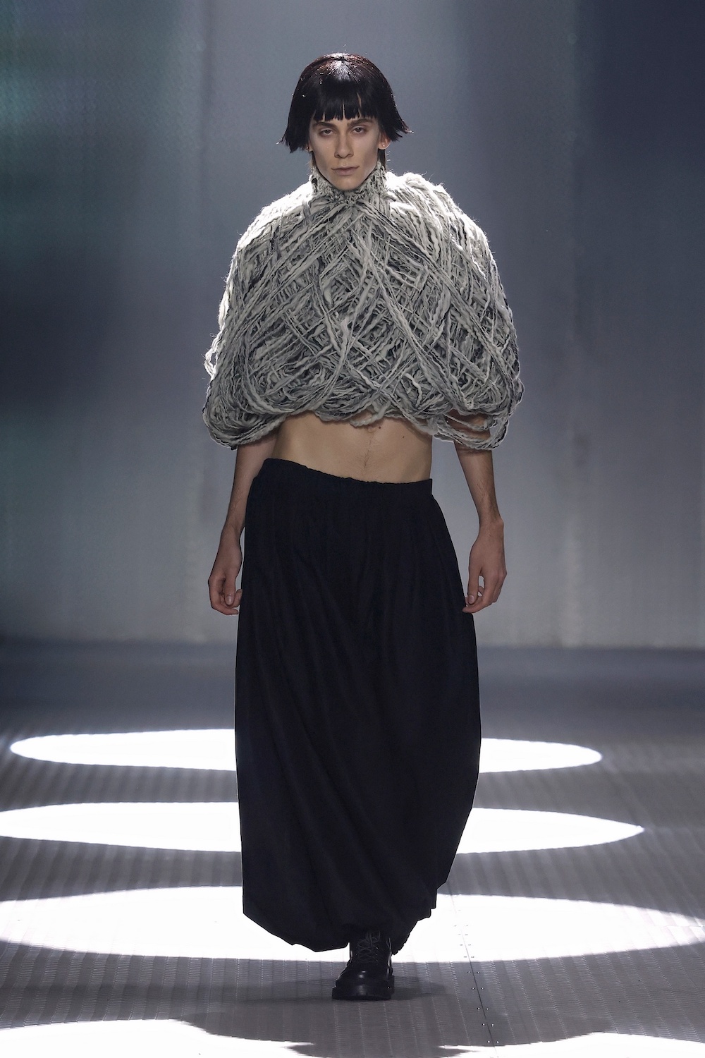 Txell Miras, la diseñadora catalana que recientemente creaba el vestuario de la ceremonia inaugural de la Copa América de Vela y los uniformes del Orfeó Català, presentaba «Una llàgrima simplificada en el desig» (Una lágrima simplificada en el deseo), una colección conceptual que trasladaba al patronaje y a las texturas el sotobosque emocional del deseo y la soledad.