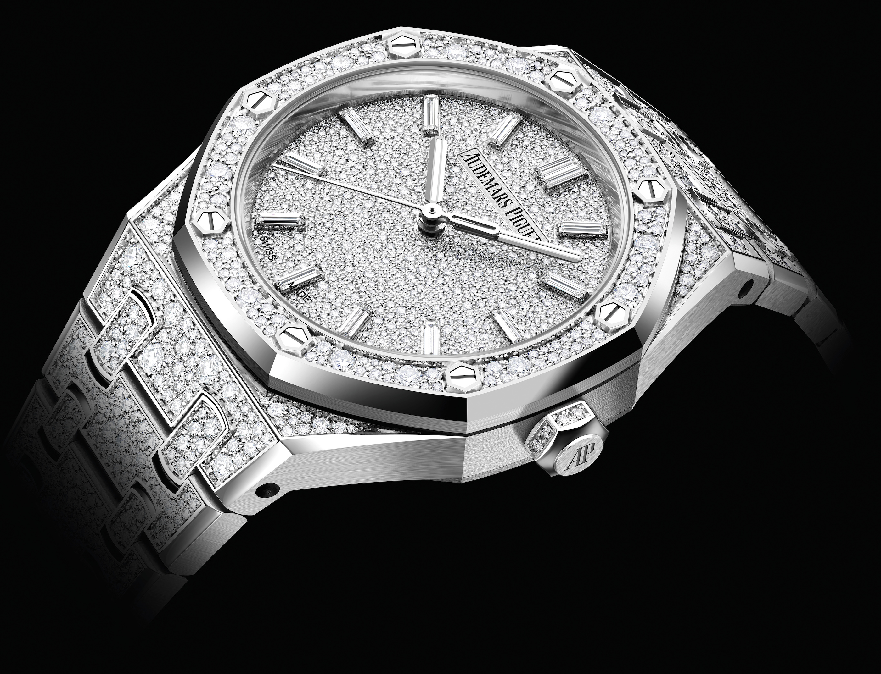 Un sinfín de diamantes de talla brillante en diferentes medidas se apoderan de los Royal Oak de Audemars Piguet en una exclusiva y lujosa colección donde el engaste nieve, singular y de gran destreza técnica aporta un efecto luminoso que resalta todavía más la estructura de esta pieza.