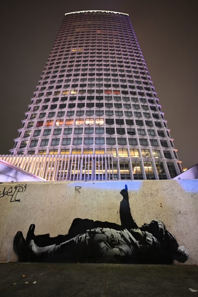 El primer mural apareció el 20 de diciembre junto a la torre Centre Point, cerca de Tottenham Court Road. Poco después, surgió una segunda versión en Queen’s Mews, en el barrio de Bayswater, sobre una fila de garajes.