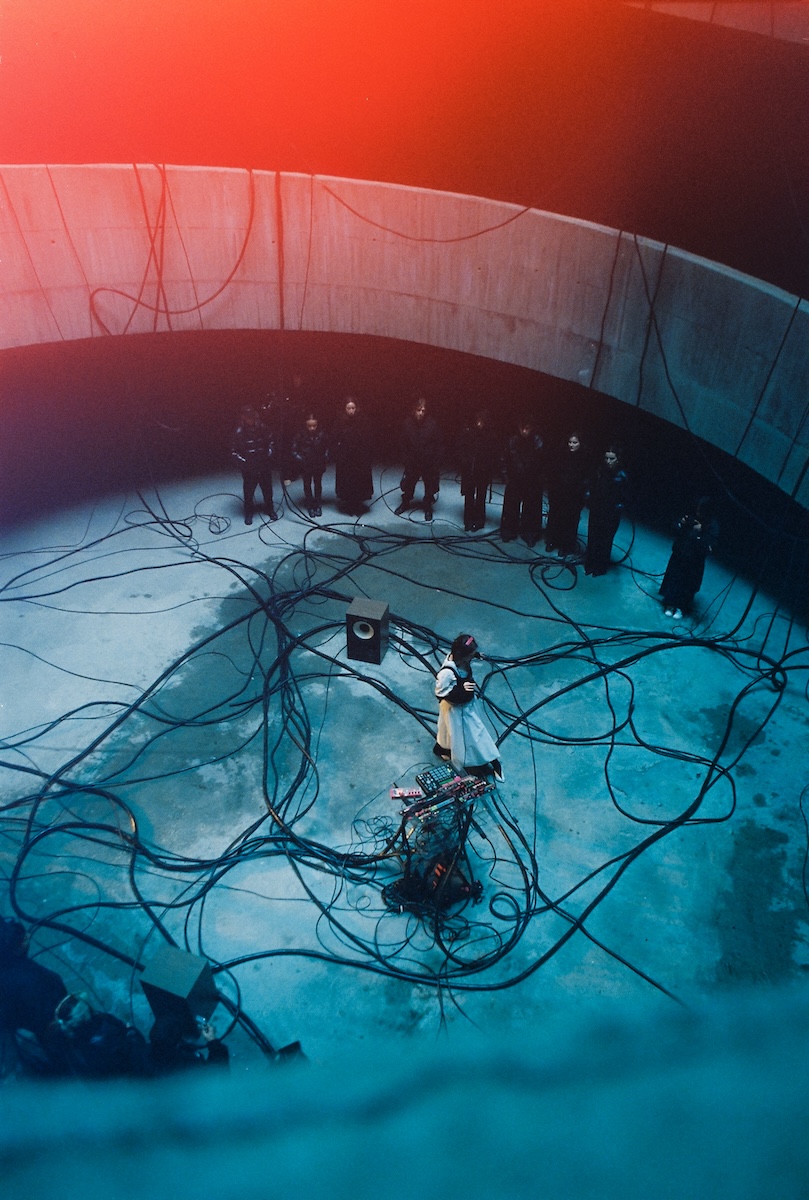 El ambiente del rodaje era íntimo, casi suspendido en el tiempo (sí, todo bastante «definido por la presencia de luz»). Y de las sombras. La localización, única: el que iba a ser el Museo de la Automoción concebido por los arquitectos Mansilla + Tuñón al sur de Madrid, que hoy permanece en pie como una construcción brutalista vacía digna de una rave. Un grupo muy reducido observaba en silencio mientras Ela Minus construía la atmósfera con sus máquinas, fiel a esa identidad DIY que define su trayectoria. No era solo un shooting, sino una ventana abierta a su universo creativo.