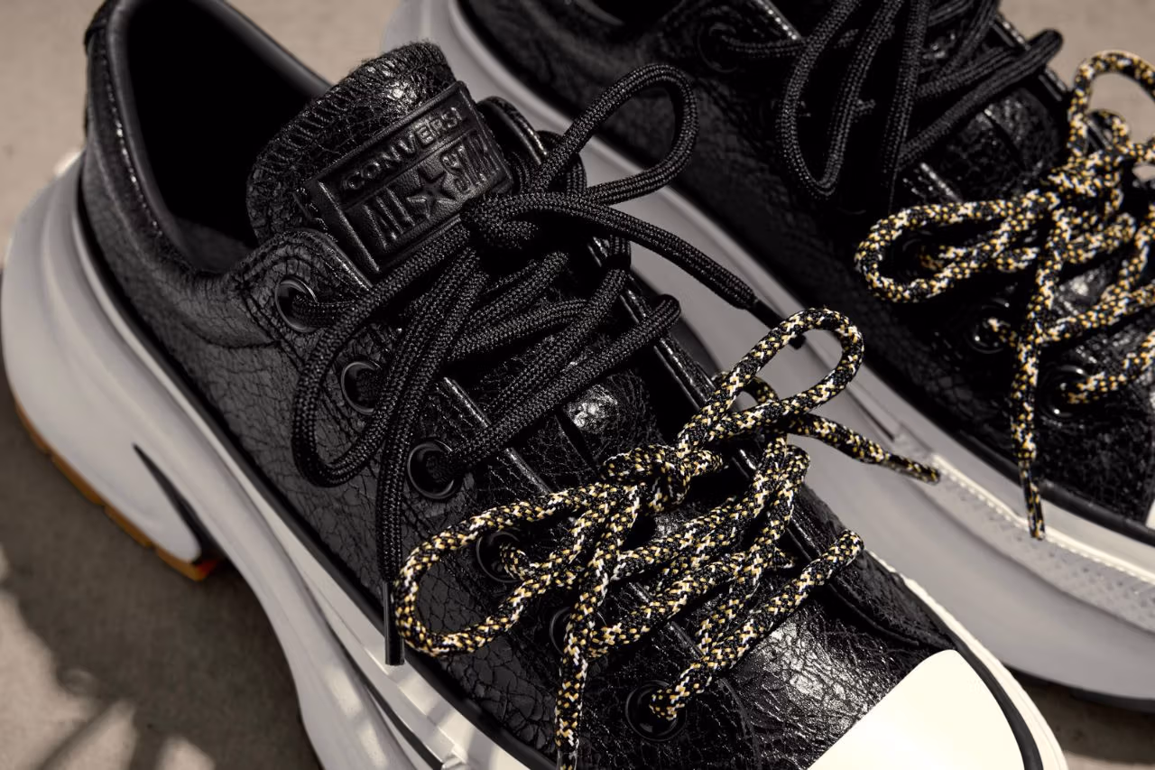 Finalmente, la Run Star Crush se posiciona como la opción más audaz del trío. En este caso, Converse lleva el modelo hacia un terreno más experimental, con una silueta de plataforma marcada y un enfoque claramente escultórico. El upper de piel con acabado brillante y efecto craquelado se combina con una suela exagerada que transforma la zapatilla en una pieza llamativa, orientada a un público más cercano al mundo de la moda.