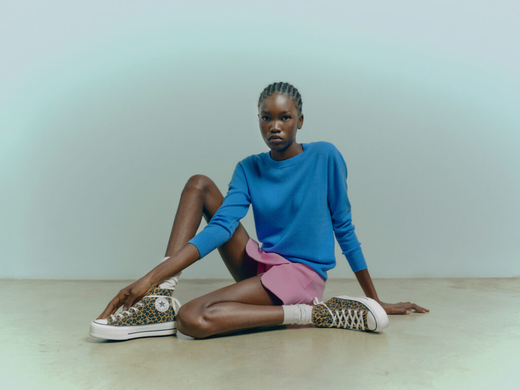 En la editorial, la fusión entre lo natural y lo urbano se materializa en imágenes que revelan la fuerza interior de cada individuo. Es una reflexión sobre la identidad como instinto, sobre esa energía silenciosa que late al margen de las modas. La estética juega con el contraste: lo primitivo frente a lo pulido, lo táctil frente a lo brillante, el movimiento frente a la quietud. Todo en equilibrio con la esencia de Converse, que mantiene sus códigos icónicos, la puntera de goma, la placa de matrícula y el empeine de lona, ahora reinterpretados bajo el prisma salvaje del animal print.