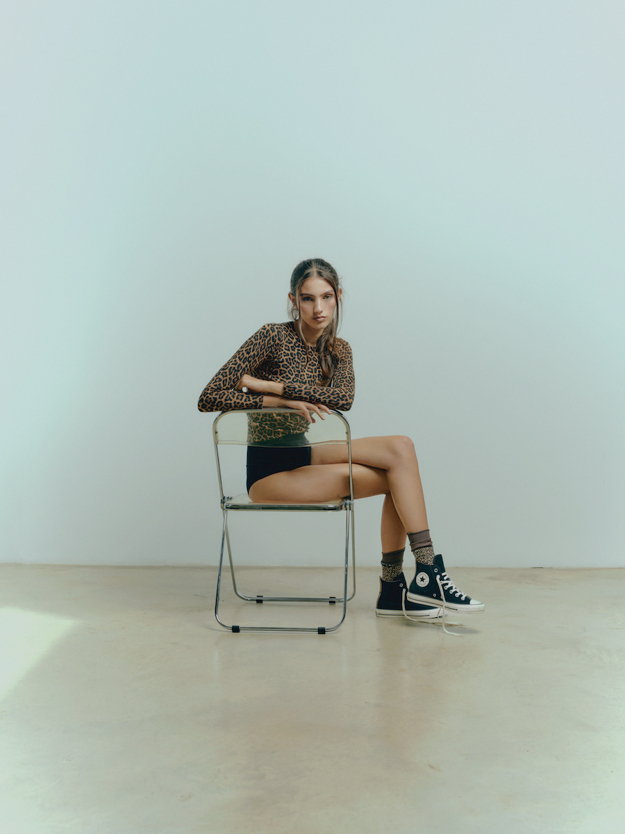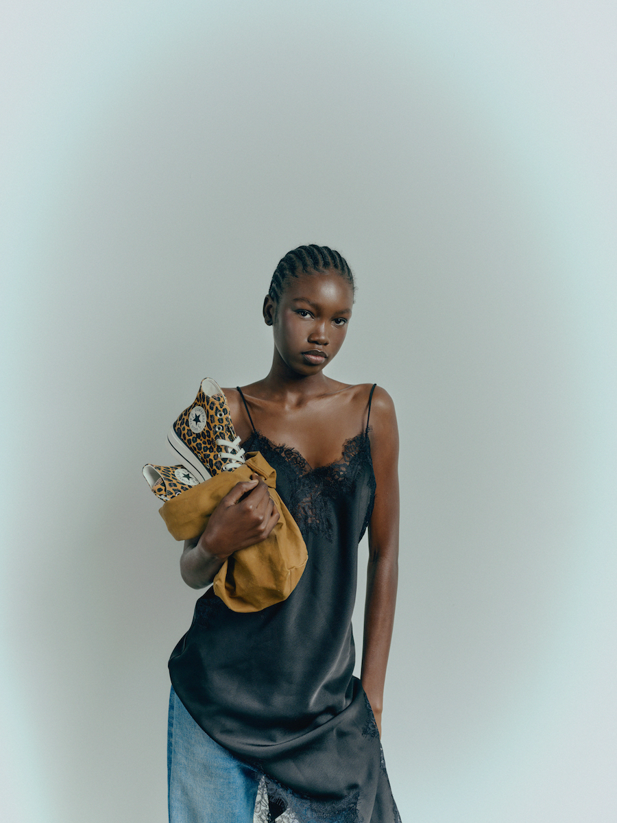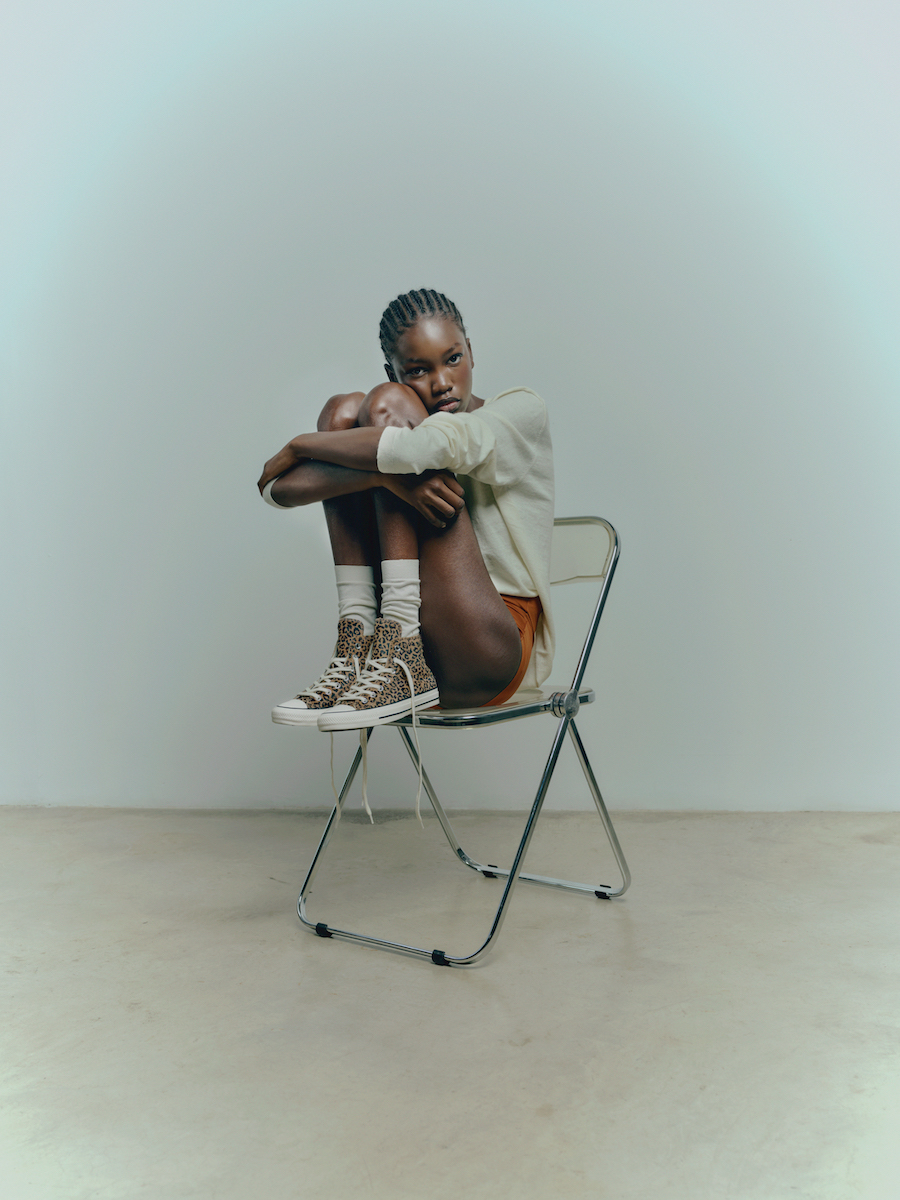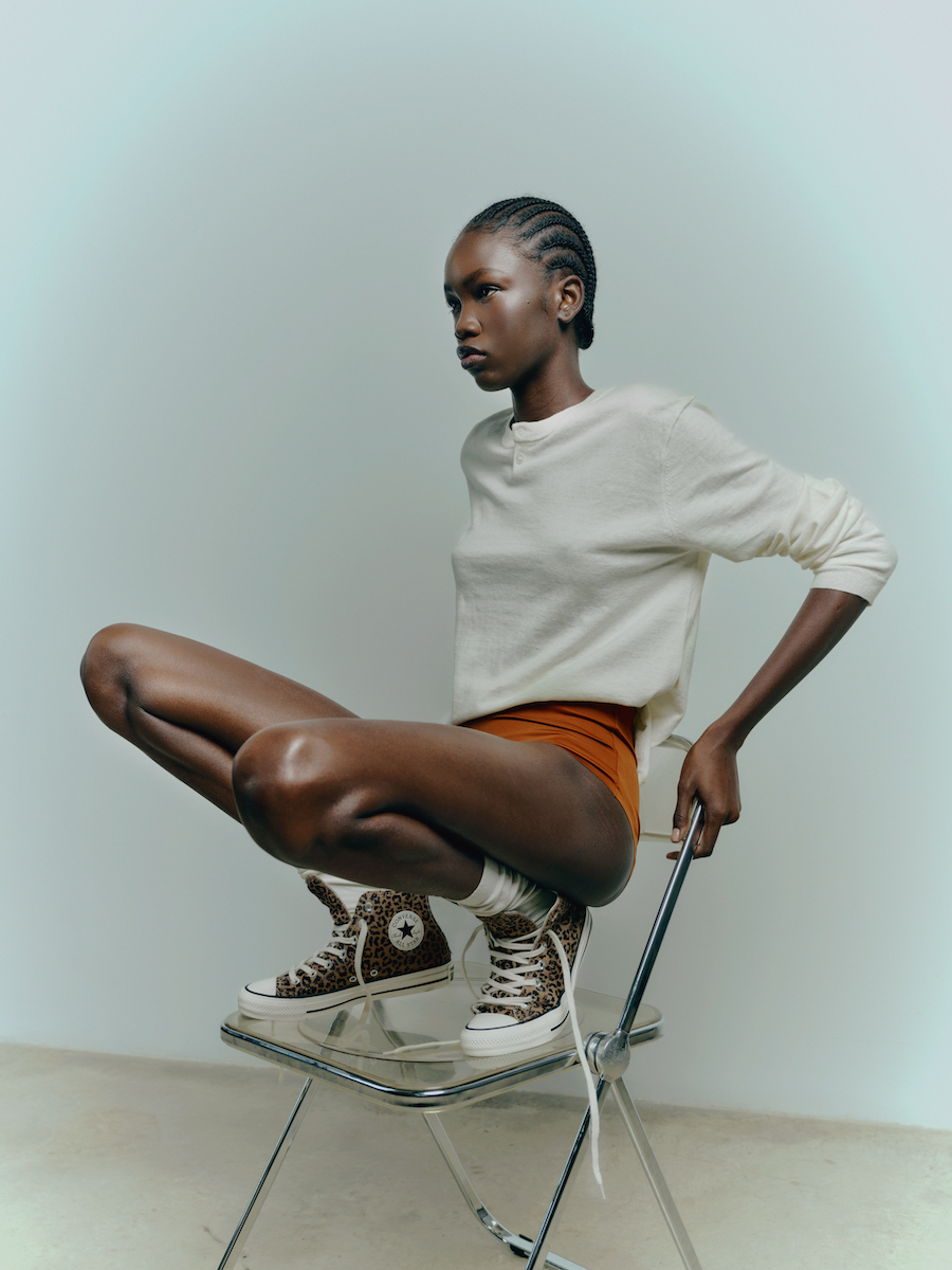 En la editorial, la fusión entre lo natural y lo urbano se materializa en imágenes que revelan la fuerza interior de cada individuo. Es una reflexión sobre la identidad como instinto, sobre esa energía silenciosa que late al margen de las modas. La estética juega con el contraste: lo primitivo frente a lo pulido, lo táctil frente a lo brillante, el movimiento frente a la quietud. Todo en equilibrio con la esencia de Converse, que mantiene sus códigos icónicos, la puntera de goma, la placa de matrícula y el empeine de lona, ahora reinterpretados bajo el prisma salvaje del animal print.