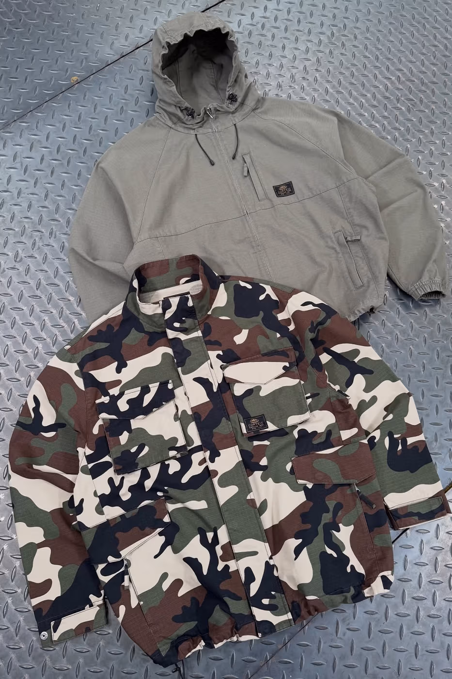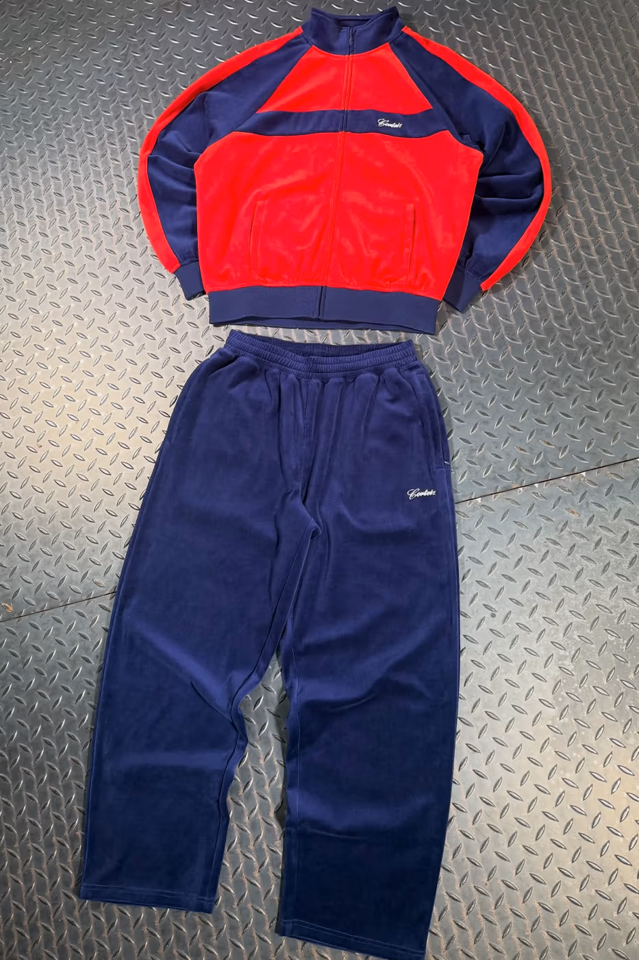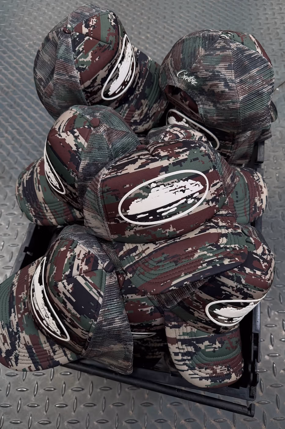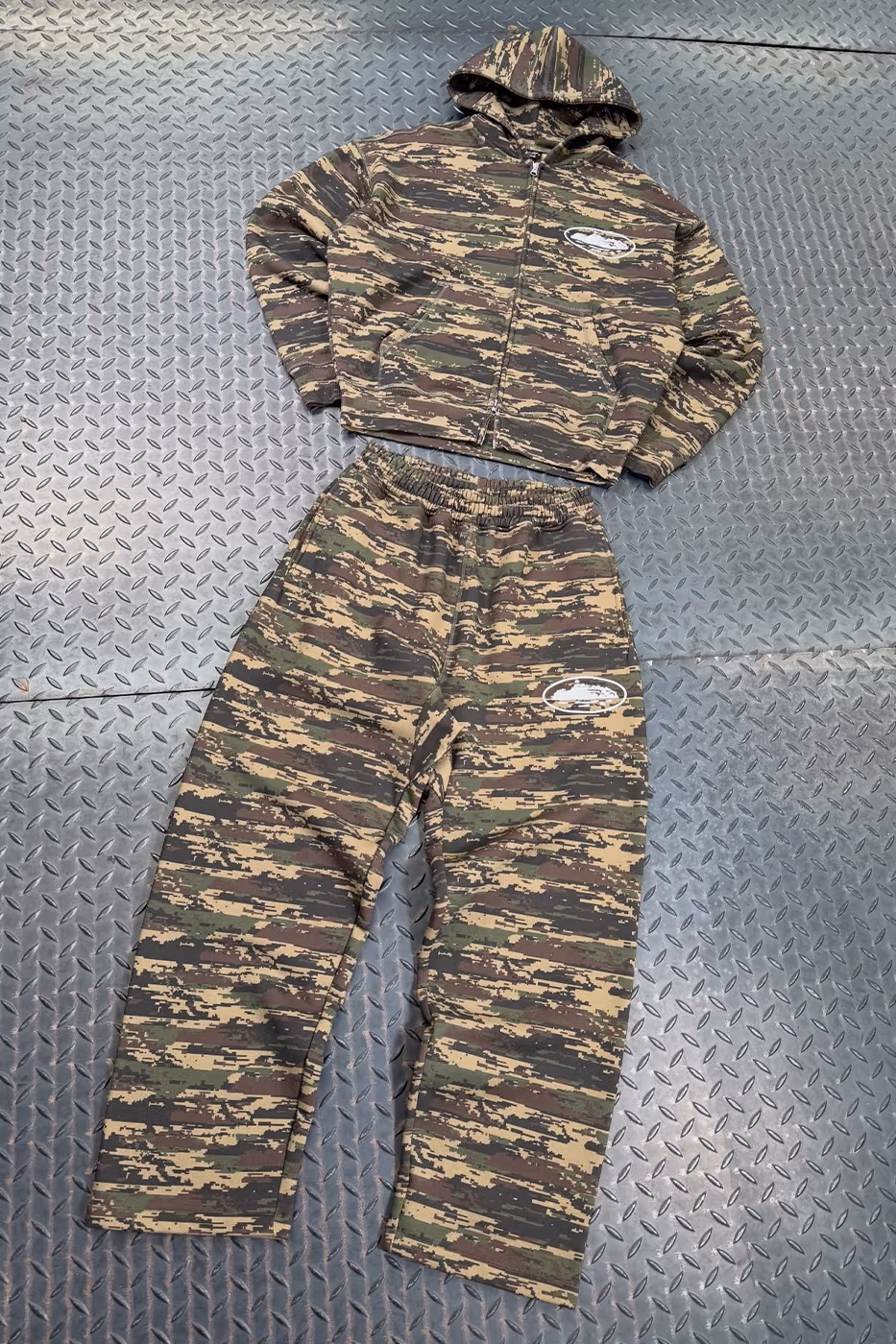 La sorpresa es que no solo habrá gorras. El lanzamiento también incluye ropa completa: pantalones de chándal, sudaderas a juego y tracksuits tanto en nylon como en terciopelo más cuidado. También aparecerán prendas con estampado camuflaje y, como no podía faltar, el logo de Alcatraz de Corteiz bien visible en varias piezas.