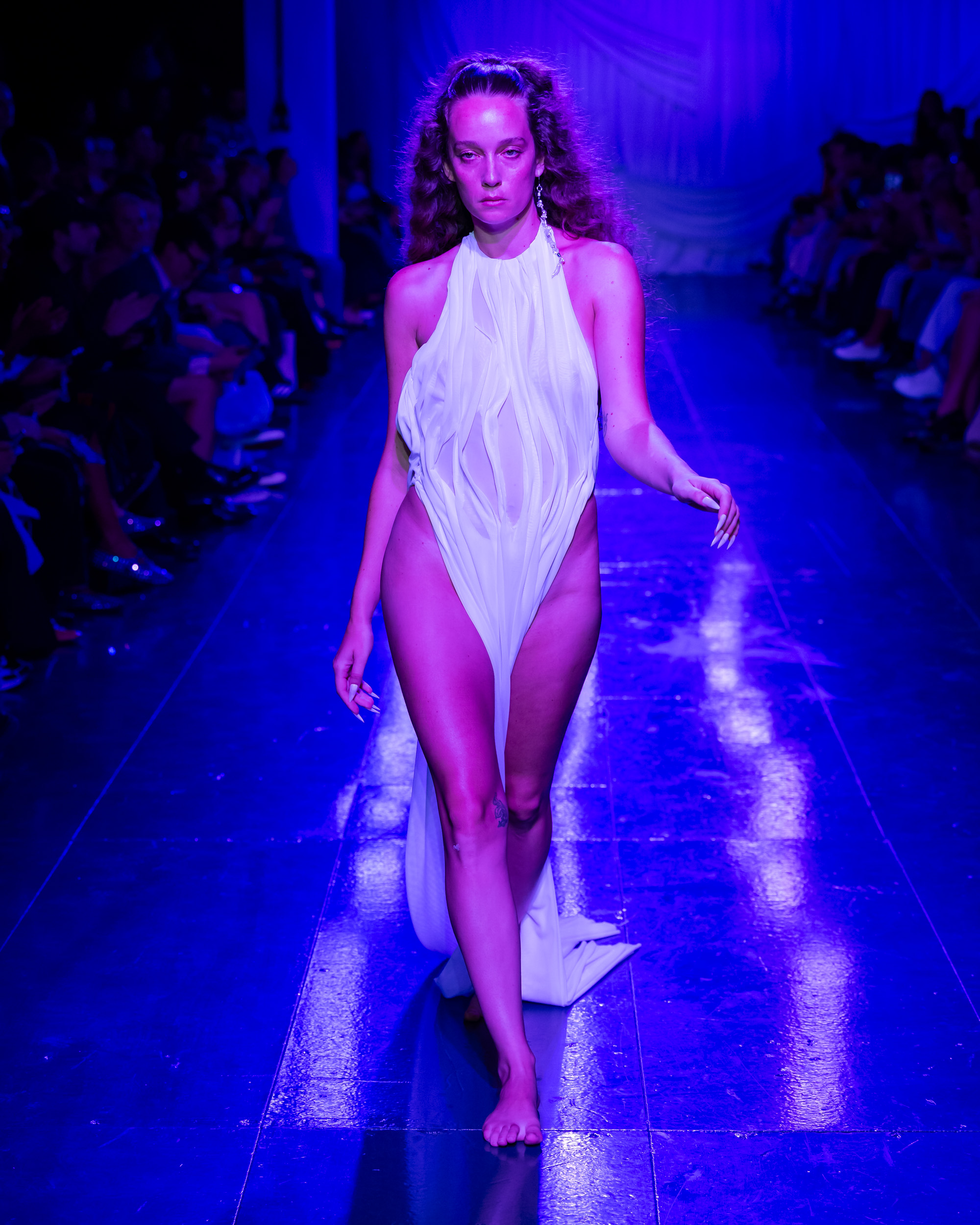 La colección SS24 de Di Petsa se adentra en la exploración de distintas facetas de Venus, reflejando las etapas del amor propio y la recuperación del amor incondicional. Los drapeados fragmentados y los vestidos que se visten y desvisten a través de cuerdas entrelazadas representan la dualidad de ocultación y revelación. Cada diseño es una celebración de la forma y una invitación a abrazar la propia desnudez.