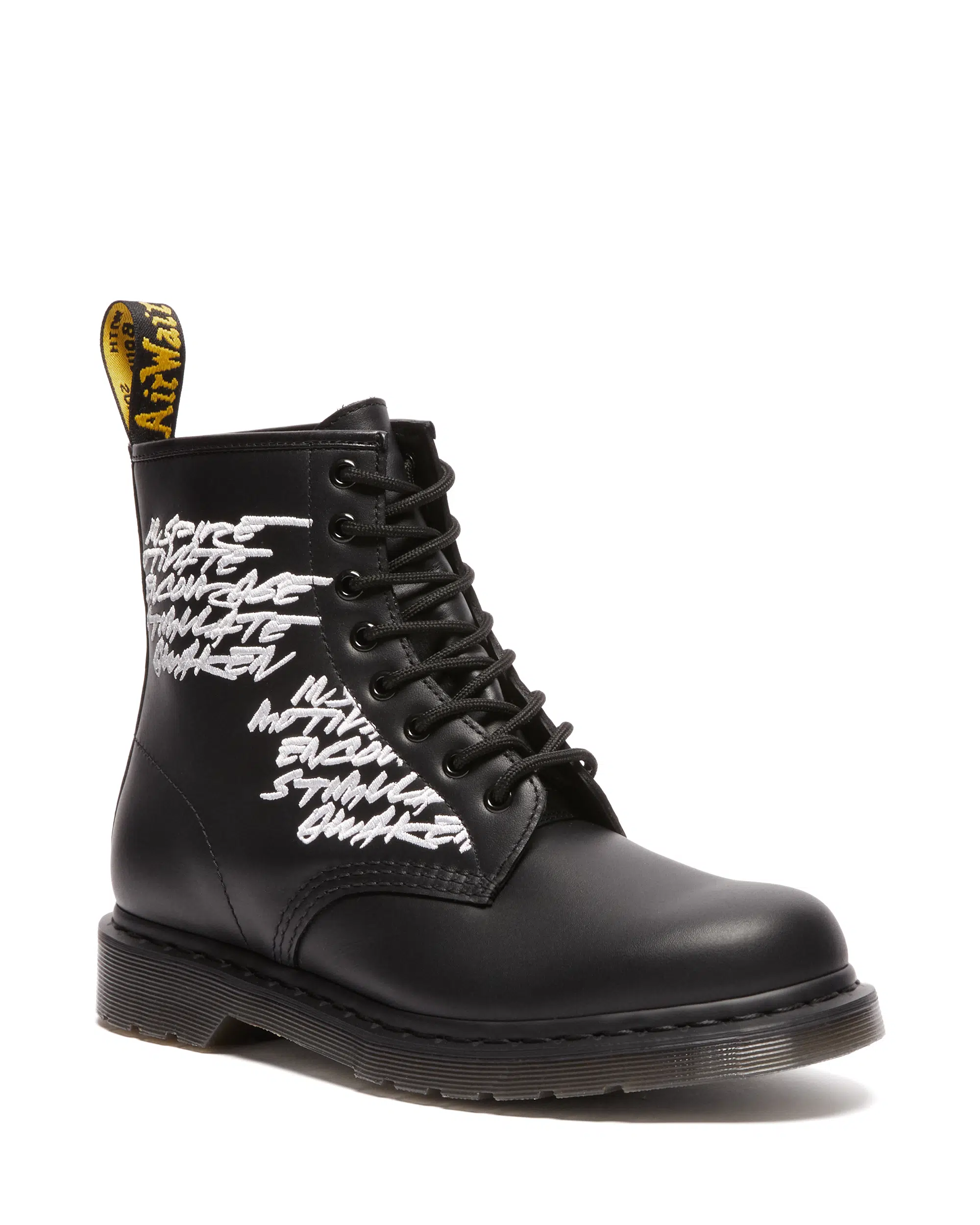 La primera pieza de esta colección posee un diseño que rinde homenaje a las raíces artísticas de Futura. Fabricadas con piel Nappa, las botas 1460 EMB FUTURA están decoradas con unos bordados que representan el espíritu rebelde de ambas marcas. Esta versión monocroma cuenta con ojales negros que contrastan con las letras blancas del graffiti de Futura. Además, como ya es habitual en Dr. Martens, cuentan con el icónico heel-loop en color amarillo y una suela de color ahumado.