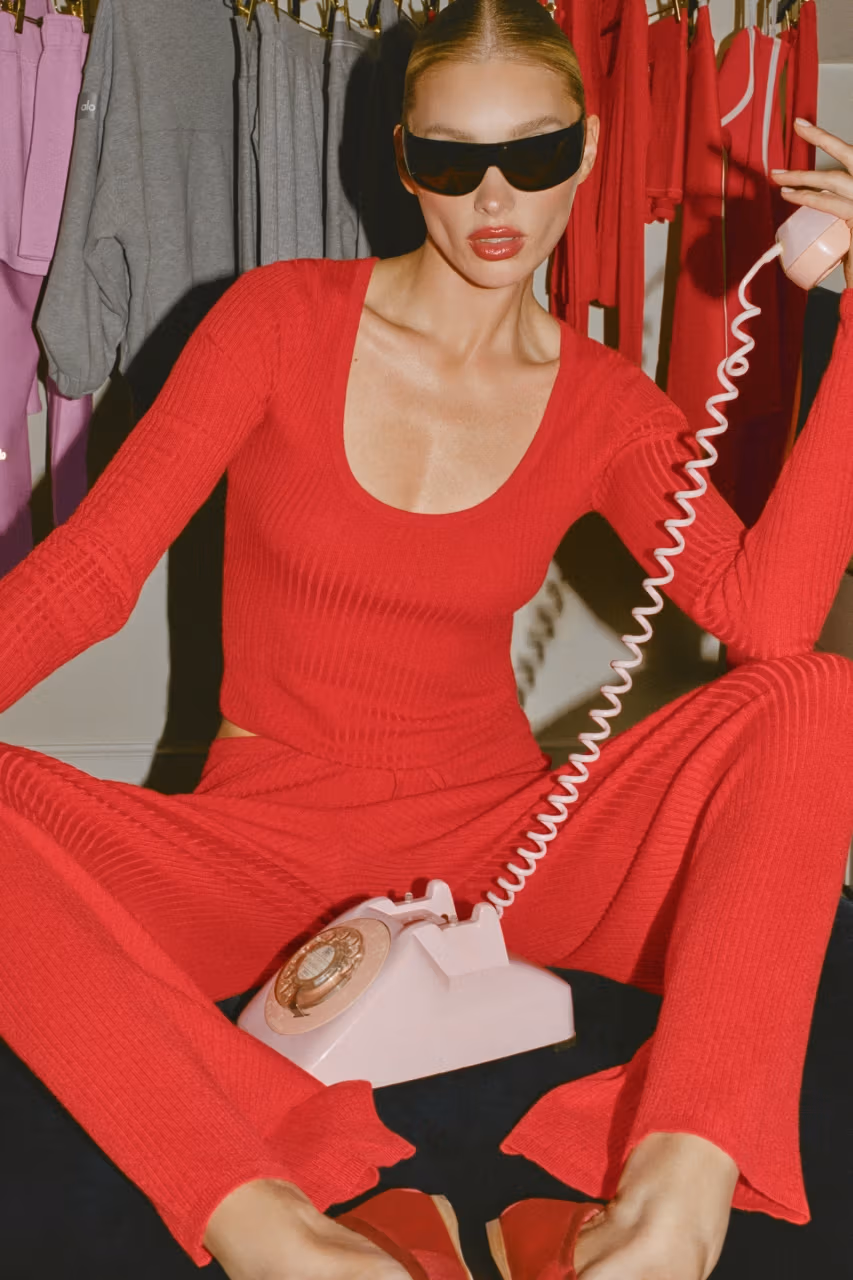 La colección ofrece básicos suaves en rojo, ciruela y rosa tipo «candy heart«. Incluye vestidos, micro shorts con bras y chaquetas, además de leggings y pantalones de pierna ancha. También suma zapatillas y bolsos que completan los conjuntos. Todo mantiene el estilo limpio y moderno que define a Alo.