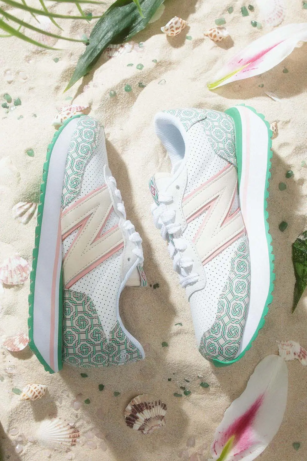 Casablanca unveils new designs for the 327 and 237 silhouettes in collaboration with New Balance. The new designs are still dominated by the green hue that has been present in previous collaborations between the two brands. The new designs reissue the iconic shoes, adding a pastel pink and monogram print.