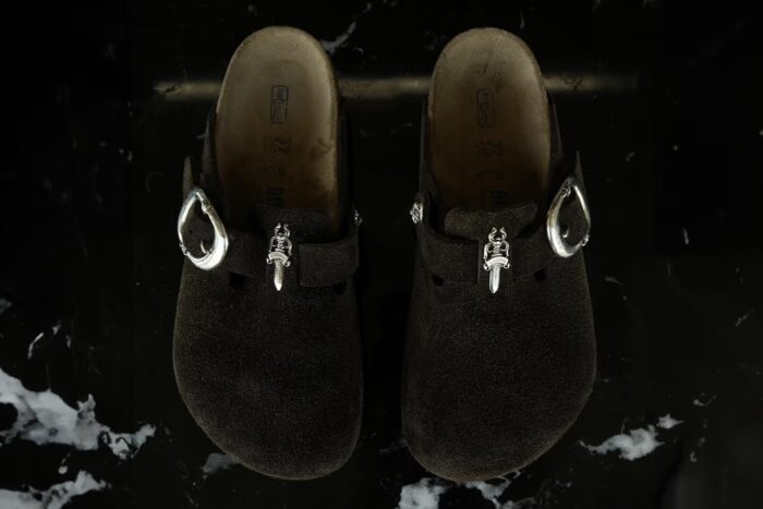 A pair of coveted Birkenstock Bostons tapped by Chrome Hearts has begun circulating online, sparking immediate interest from loyal fans of both houses. This unofficial, carefully curated collaboration combines the timeless functionality of Birkenstock with the subversive and luxurious DNA of Chrome Hearts, cementing itself as a new object of desire.