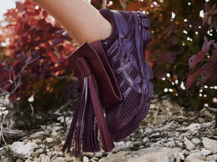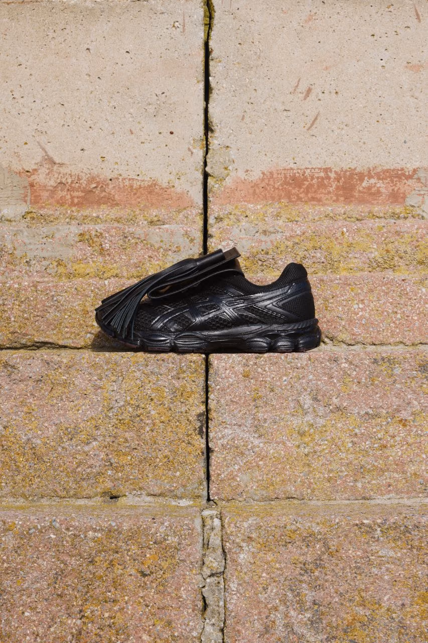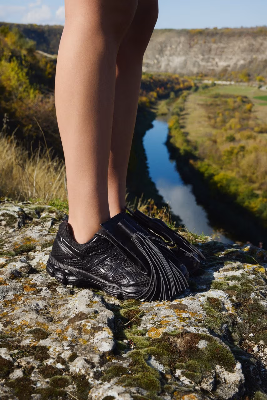 The new GEL-CUMULUS 16 arrives in two monochrome colourways: “Black” and “Cherry Red.” Its most distinctive feature is a large, square tongue finished with a leather tassel that almost completely conceals the laces. This detail, inspired by traditional footwear such as loafers and brogues, pays tribute to classic shoemaking and the artisanal work that defines Novruzova’s creative universe.