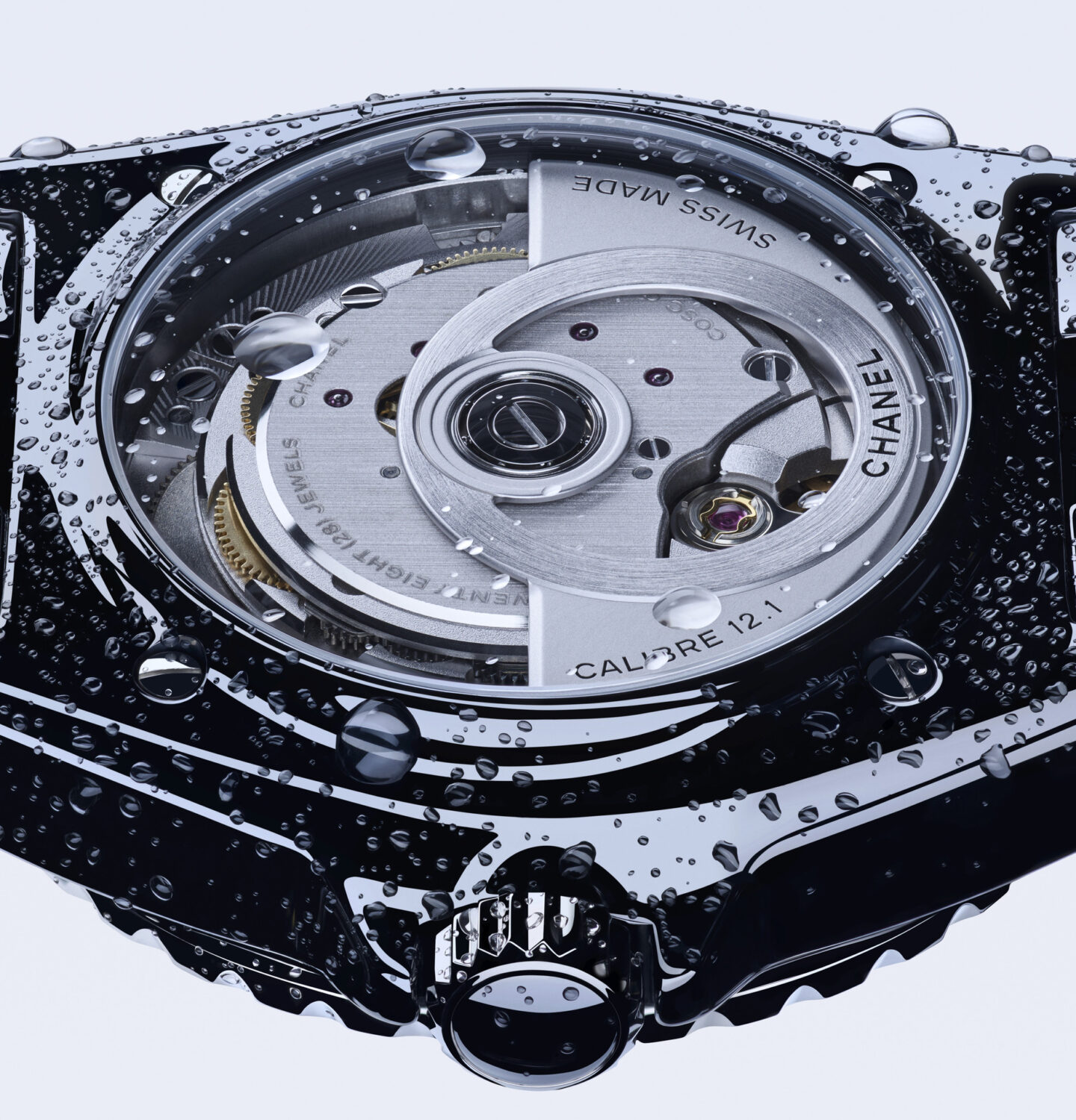 The J12 is manufactured in La Chaux-de-Fonds, Switzerland‘s watchmaking capital par excellence. It is powered by the automatic Calibre J12.1, a movement offering a 70-hour power reserve, developed in 2019 by Kenissi, a movement manufacturer in which Chanel holds a stake. In the watch Gisele wears for diving, the sapphire crystal case back reveals the calibre certified as a chronometer by COSC, an organisation that certifies the accuracy of watches after subjecting them to tests. This means she can dive safe in the knowledge that her watch will not let her down.