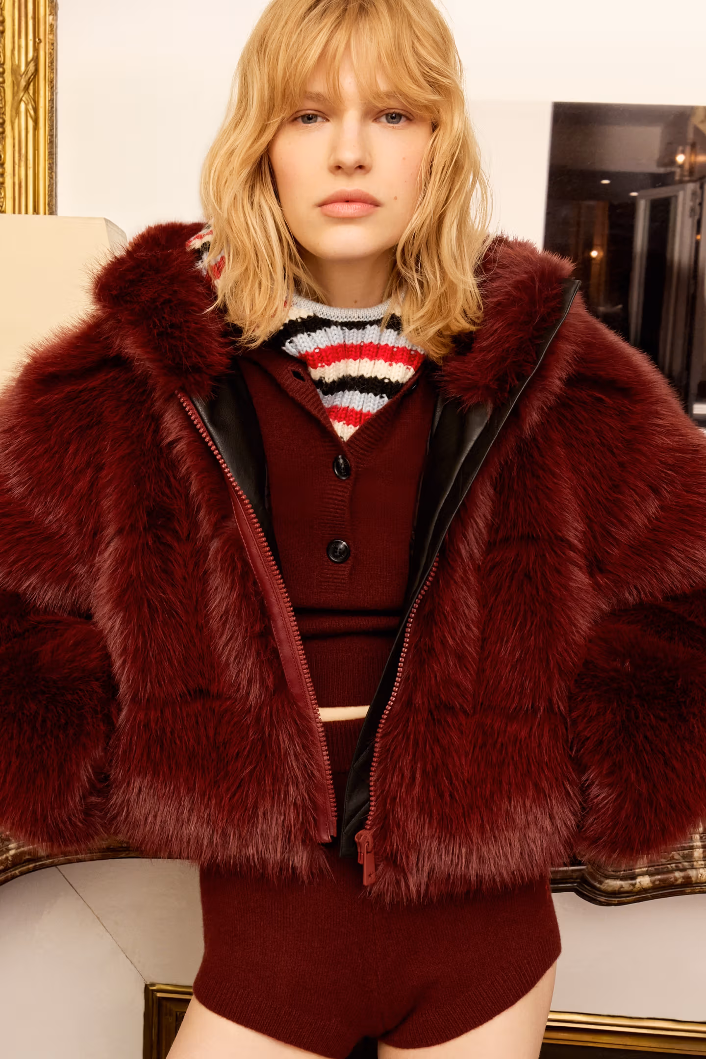 Among the standout pieces is a burgundy down puffer jacket, cropped at the hips with a flattering cinched waist. For those leaning more “street” than “ski,” the burgundy leather trousers reinterpret the ski pant silhouette with a subtle bootcut and zipped calves. Finally, faux-fur tall moon boots and pom-pom beanies complete the accessories lineup — ideal for snowy getaways or a stroll through Christmas markets.