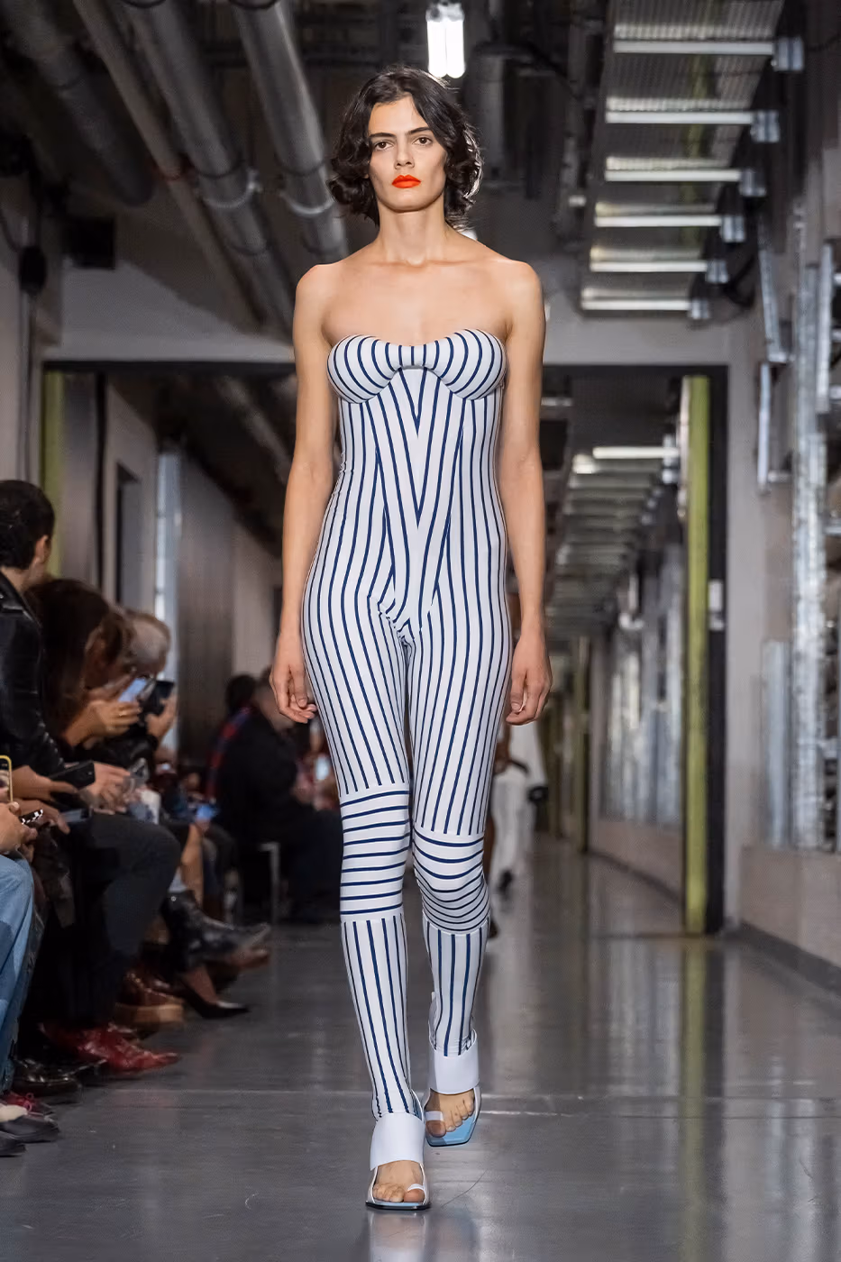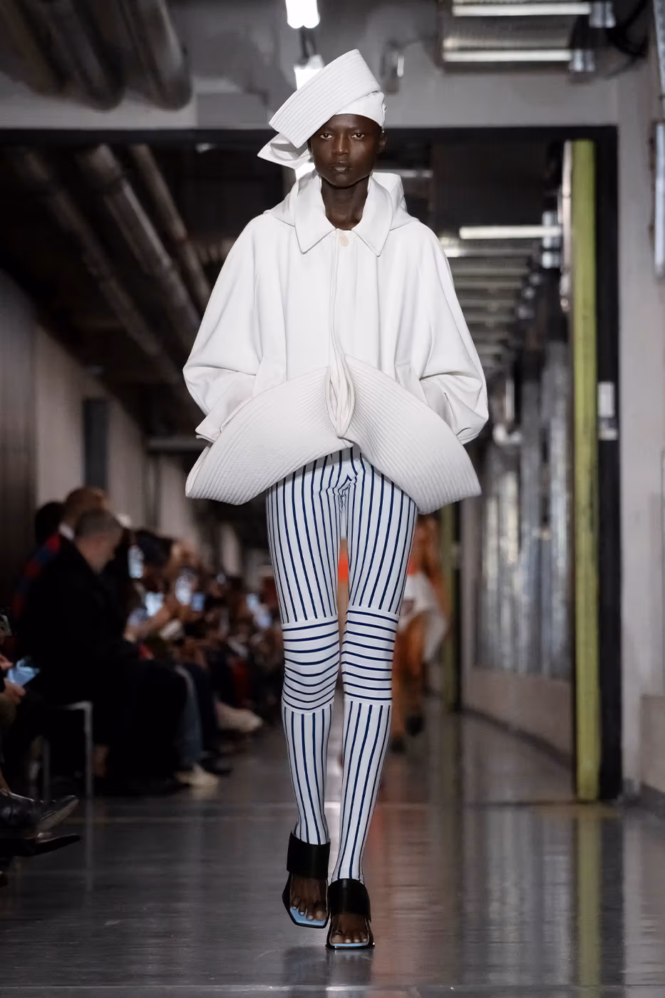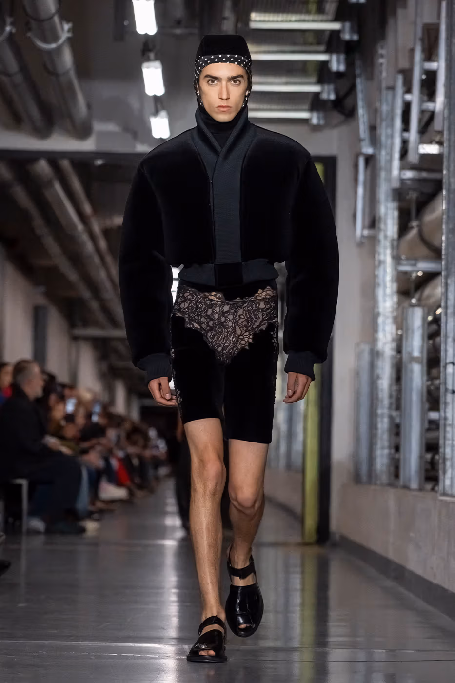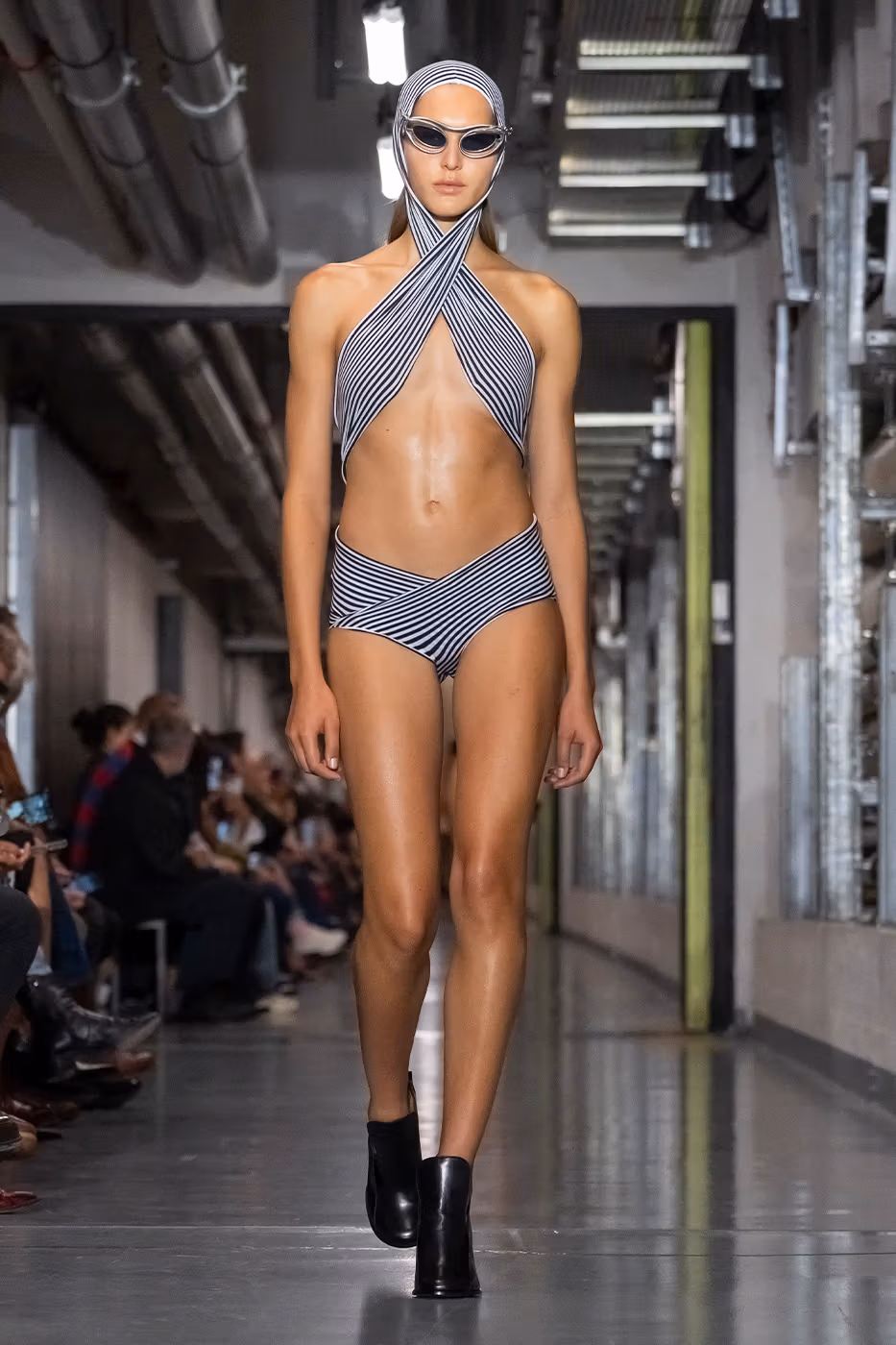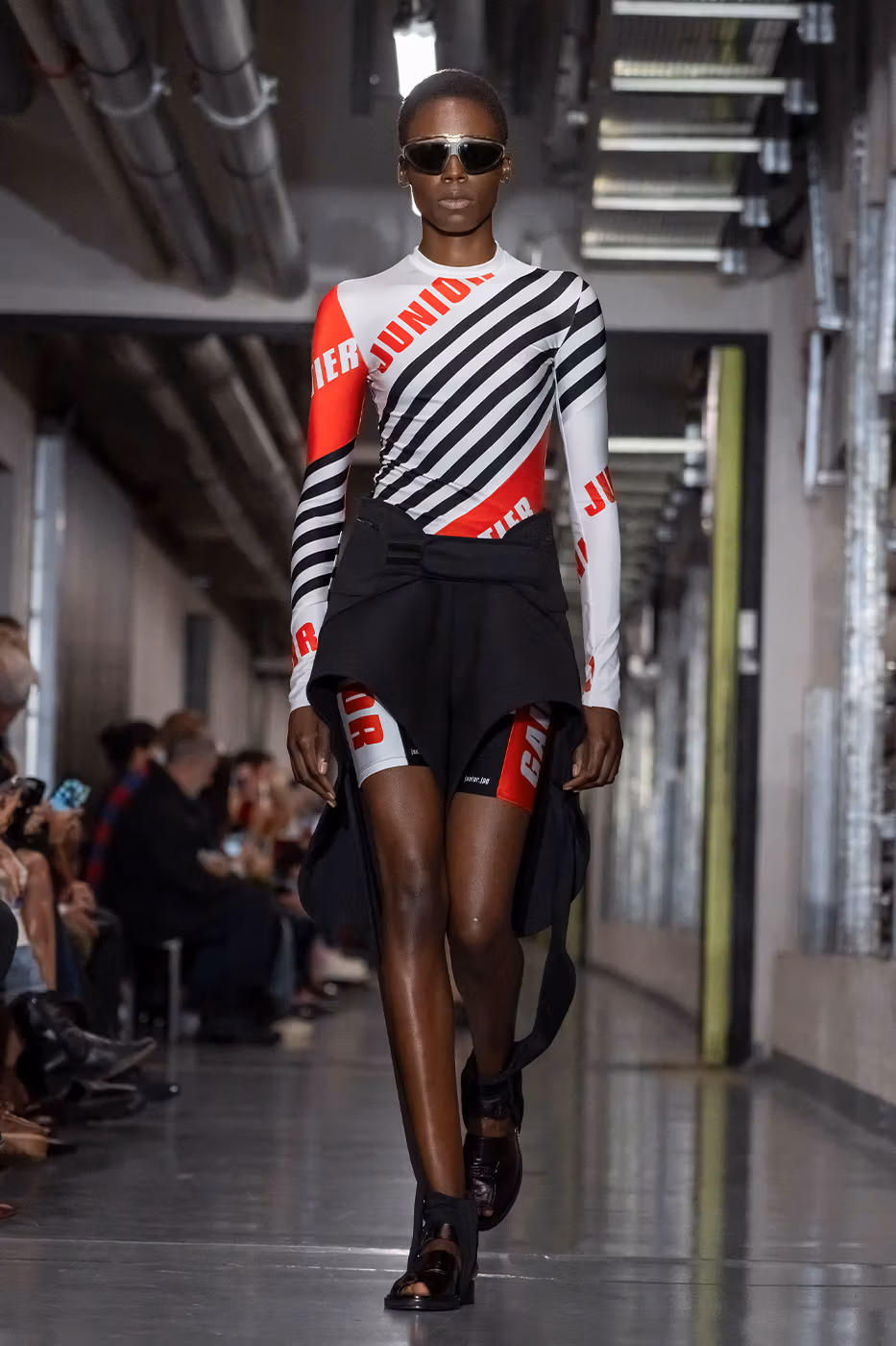 Through his signature process of “Duranification,” Lantink transforms the house’s iconic codes into a study of visual and conceptual experimentation. The classic Marinière becomes an optical illusion, while the tattoo-on-mesh motif expands into three-dimensional forms that explore the limits of body and movement. Proportions shift, volumes blur, and identity multiplies.