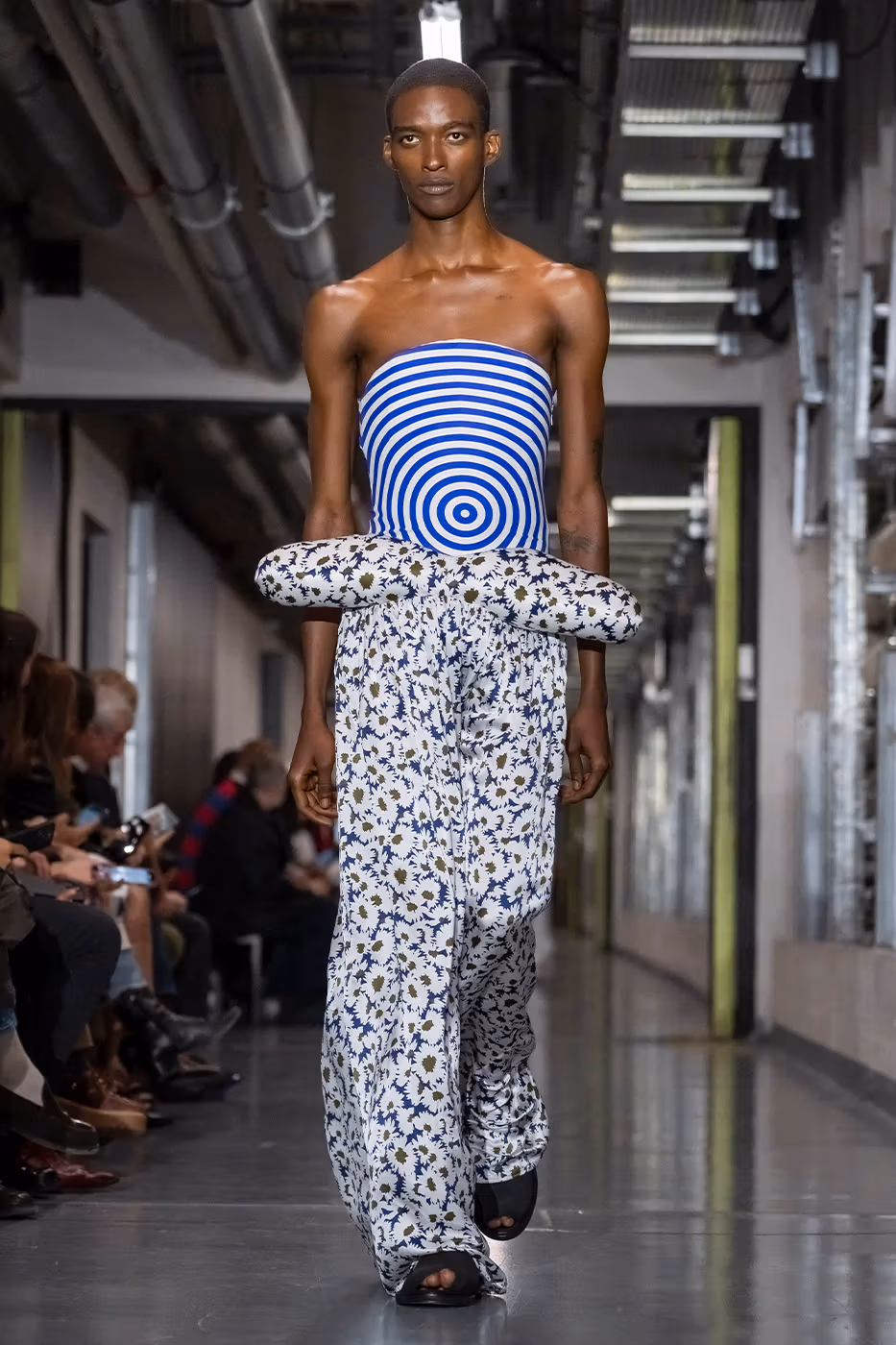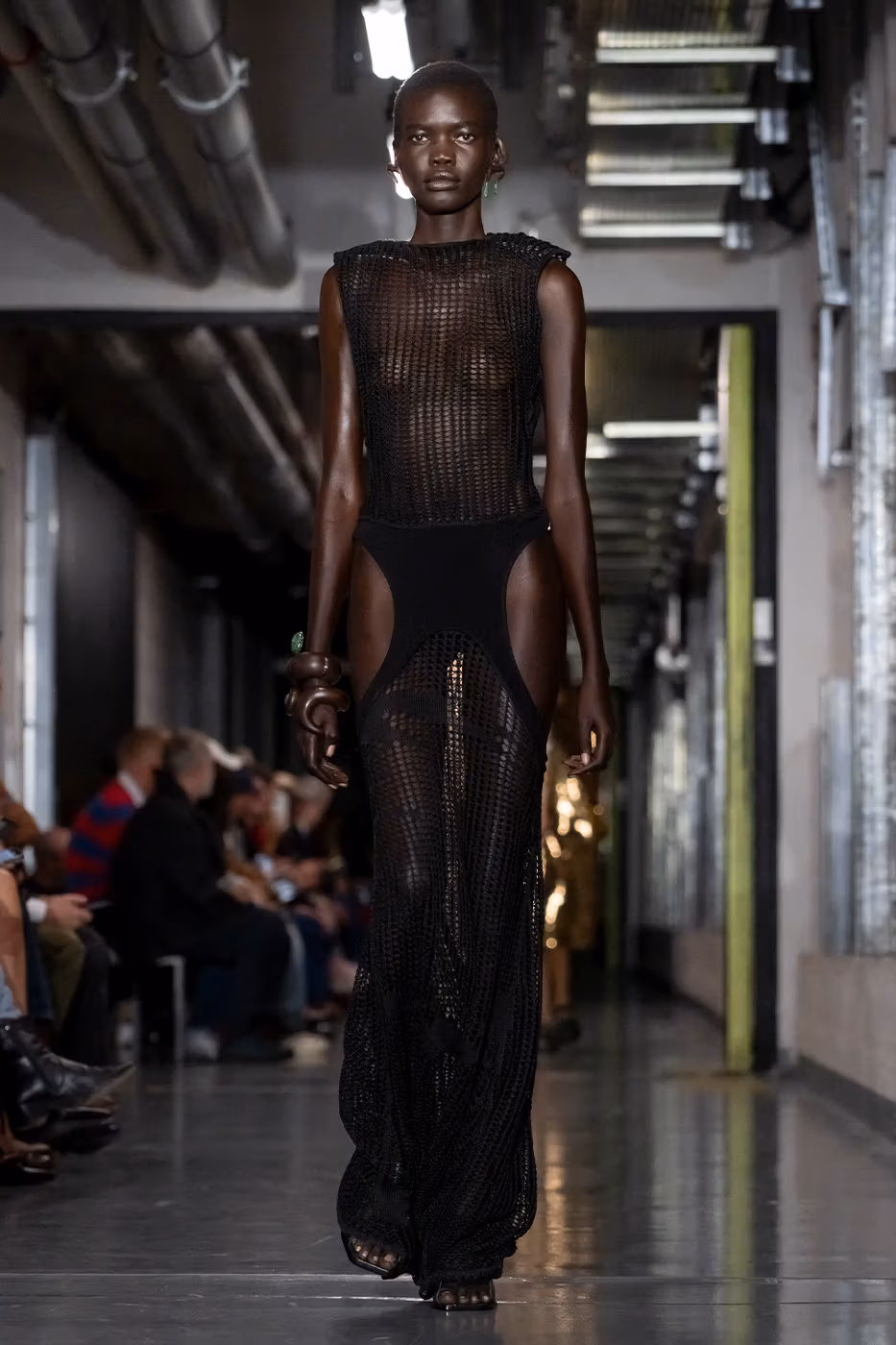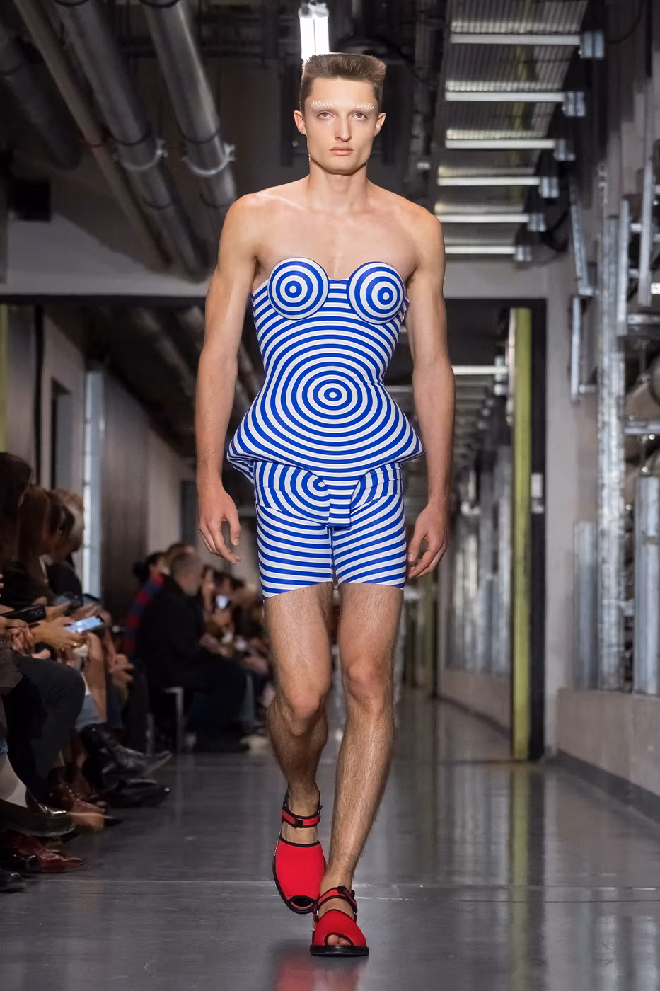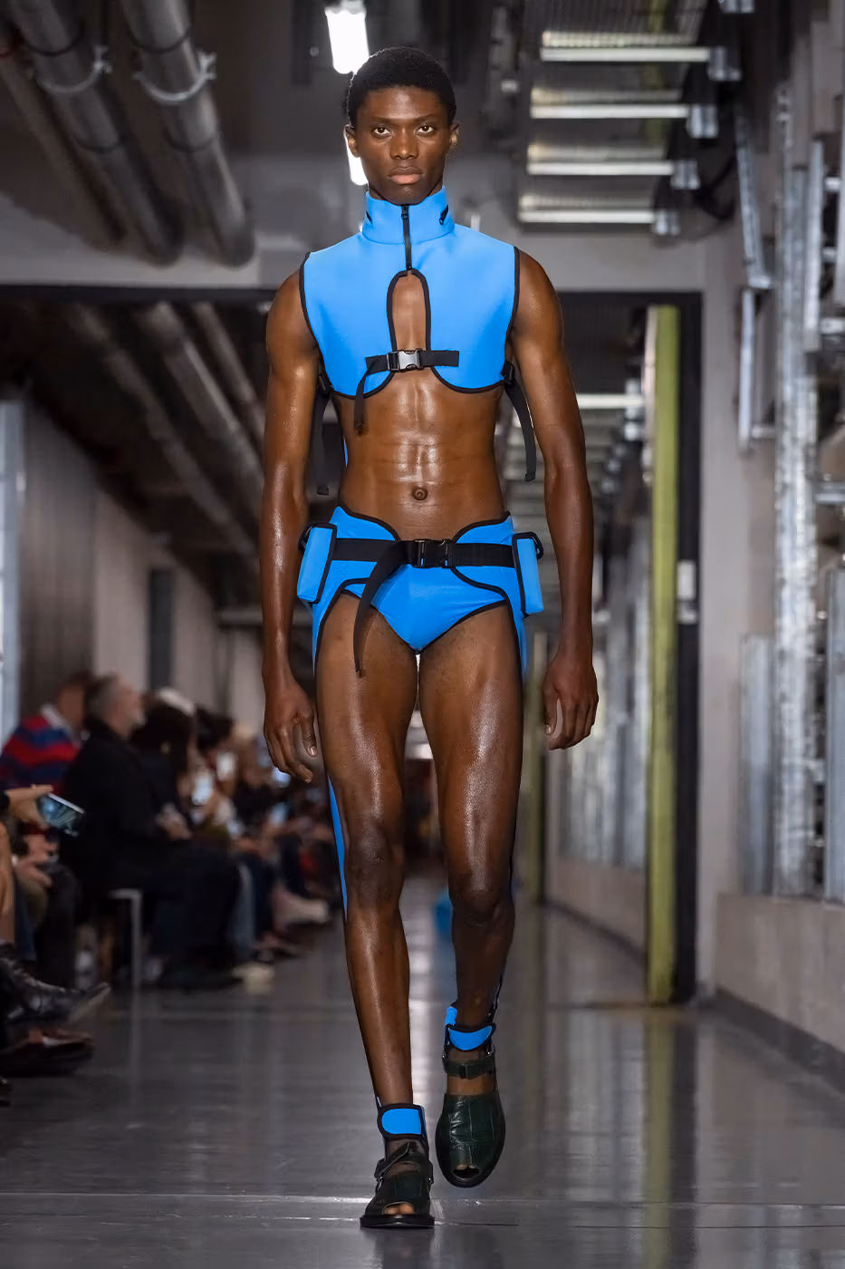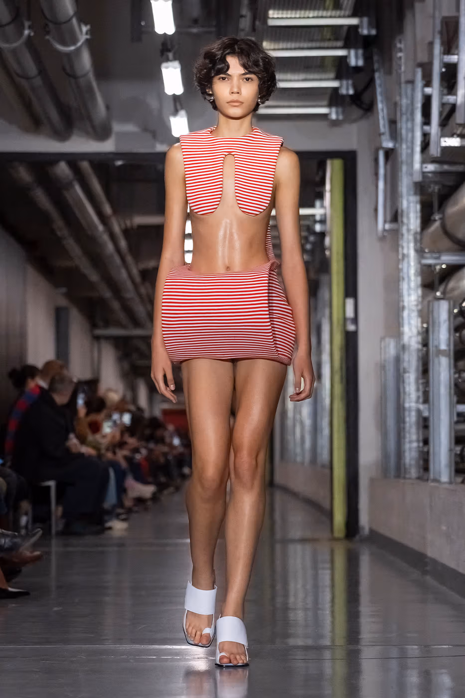 Through his signature process of “Duranification,” Lantink transforms the house’s iconic codes into a study of visual and conceptual experimentation. The classic Marinière becomes an optical illusion, while the tattoo-on-mesh motif expands into three-dimensional forms that explore the limits of body and movement. Proportions shift, volumes blur, and identity multiplies.