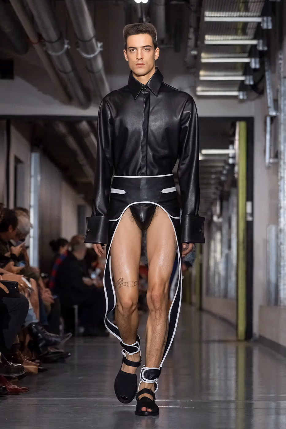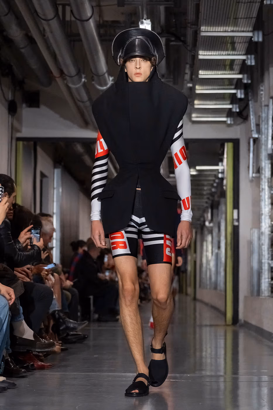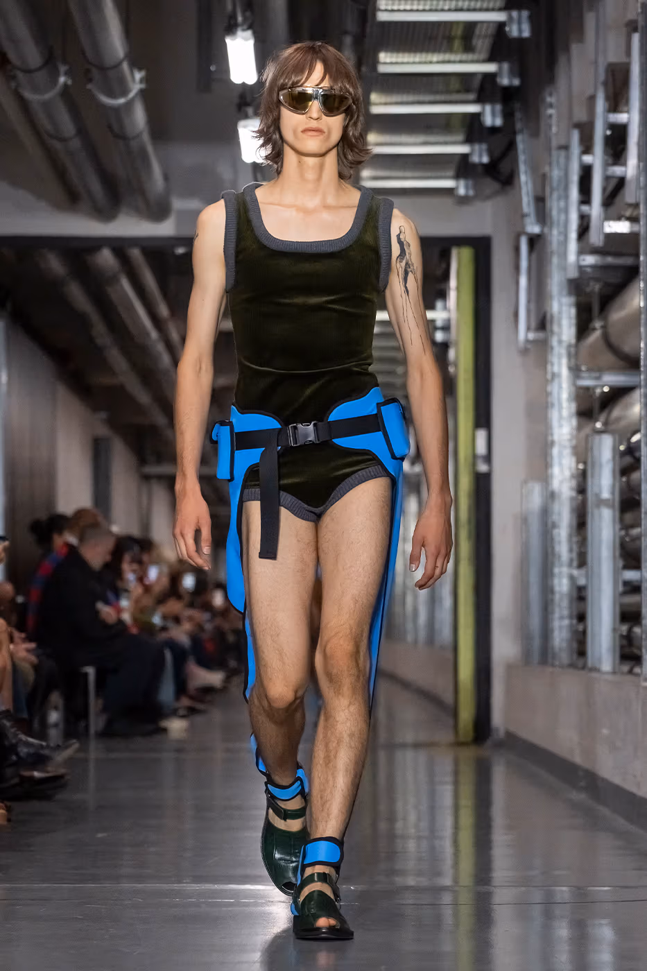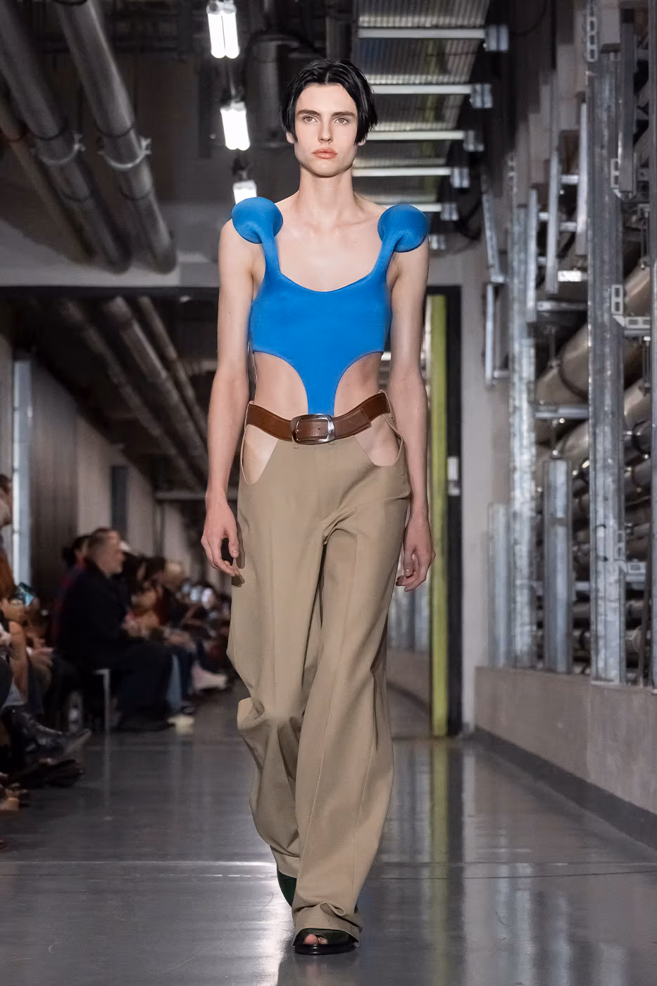 Through his signature process of “Duranification,” Lantink transforms the house’s iconic codes into a study of visual and conceptual experimentation. The classic Marinière becomes an optical illusion, while the tattoo-on-mesh motif expands into three-dimensional forms that explore the limits of body and movement. Proportions shift, volumes blur, and identity multiplies.