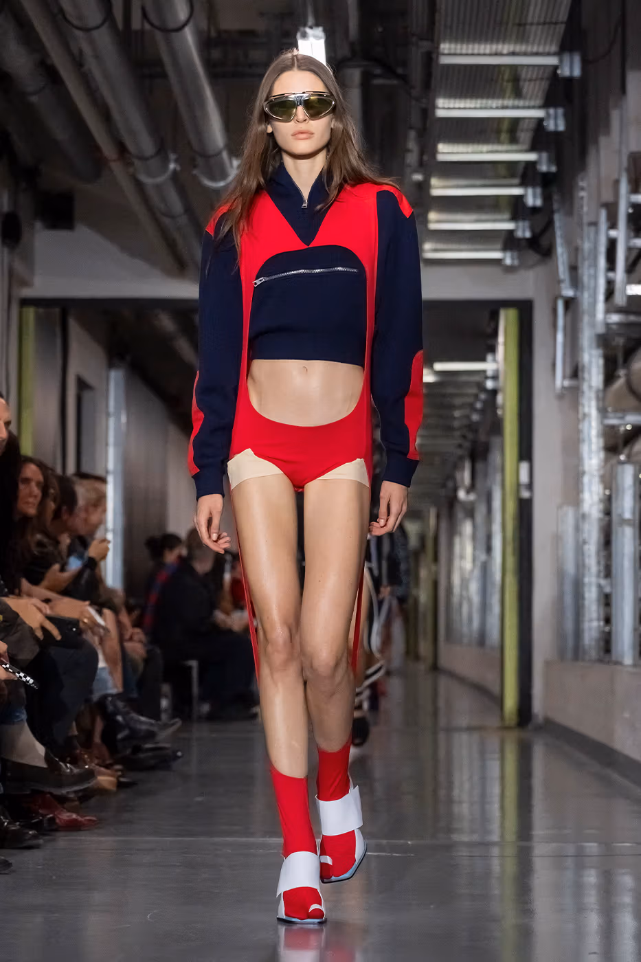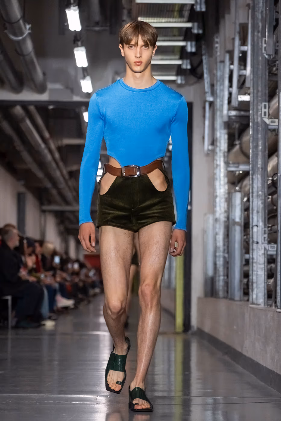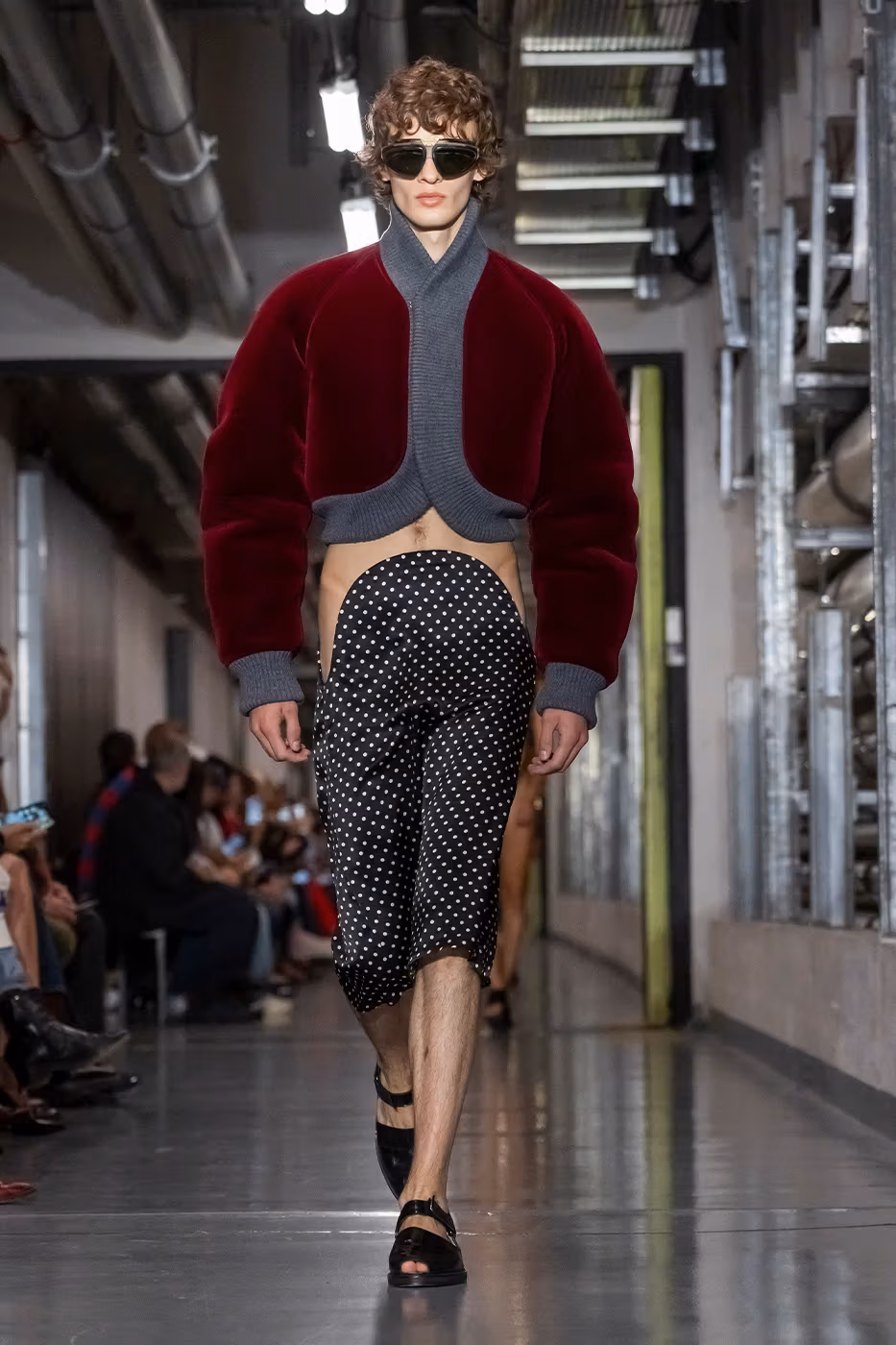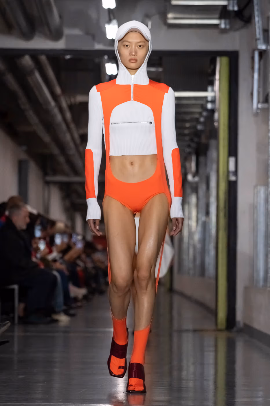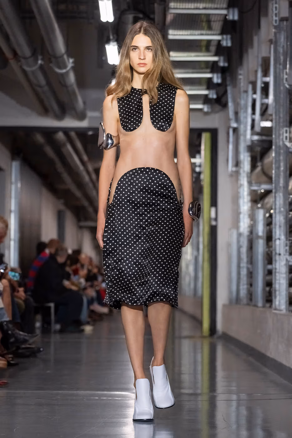Through his signature process of “Duranification,” Lantink transforms the house’s iconic codes into a study of visual and conceptual experimentation. The classic Marinière becomes an optical illusion, while the tattoo-on-mesh motif expands into three-dimensional forms that explore the limits of body and movement. Proportions shift, volumes blur, and identity multiplies.