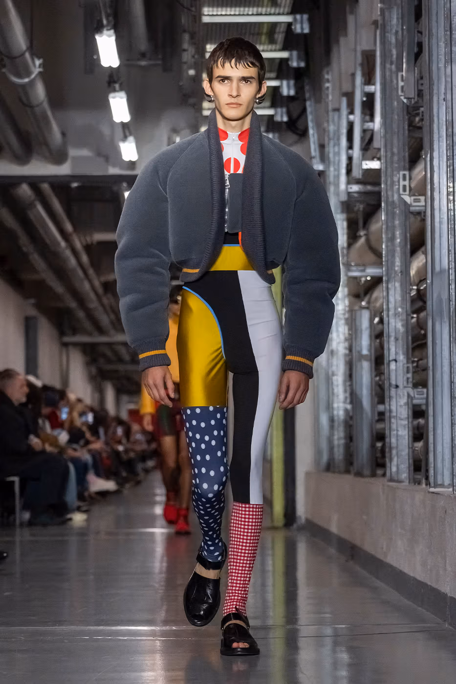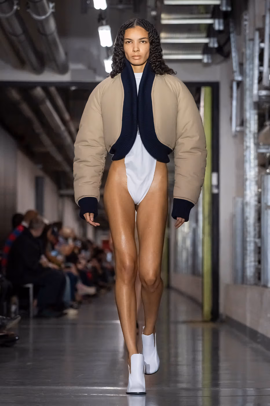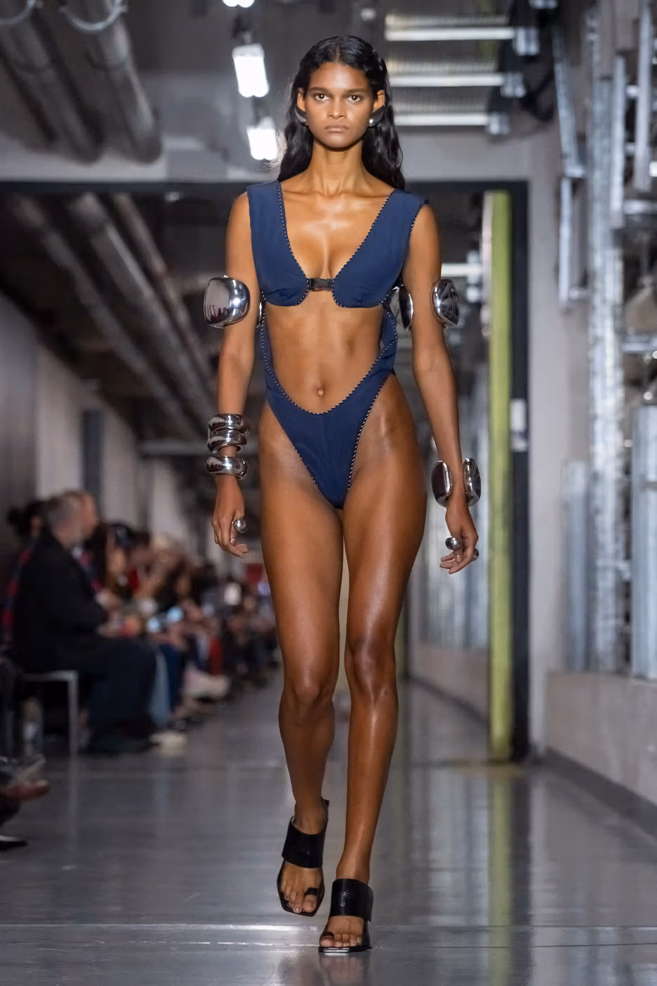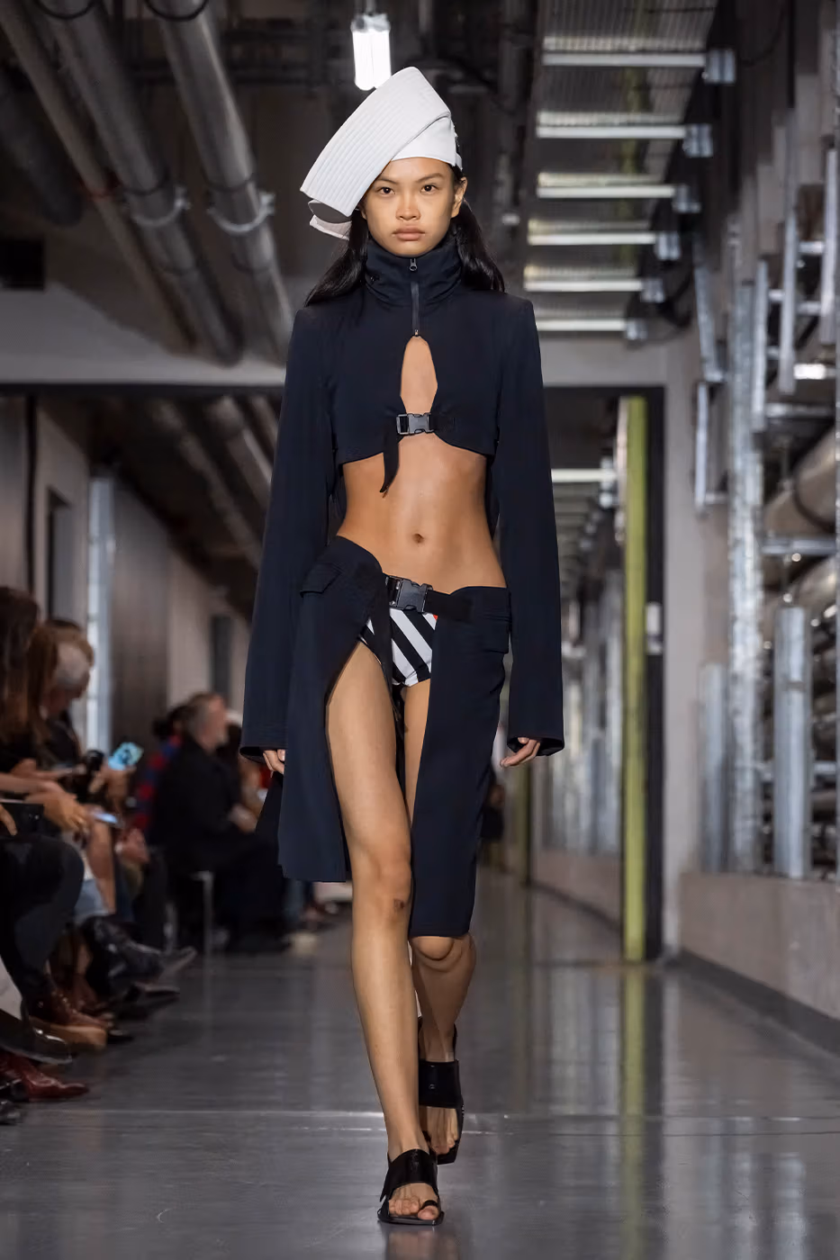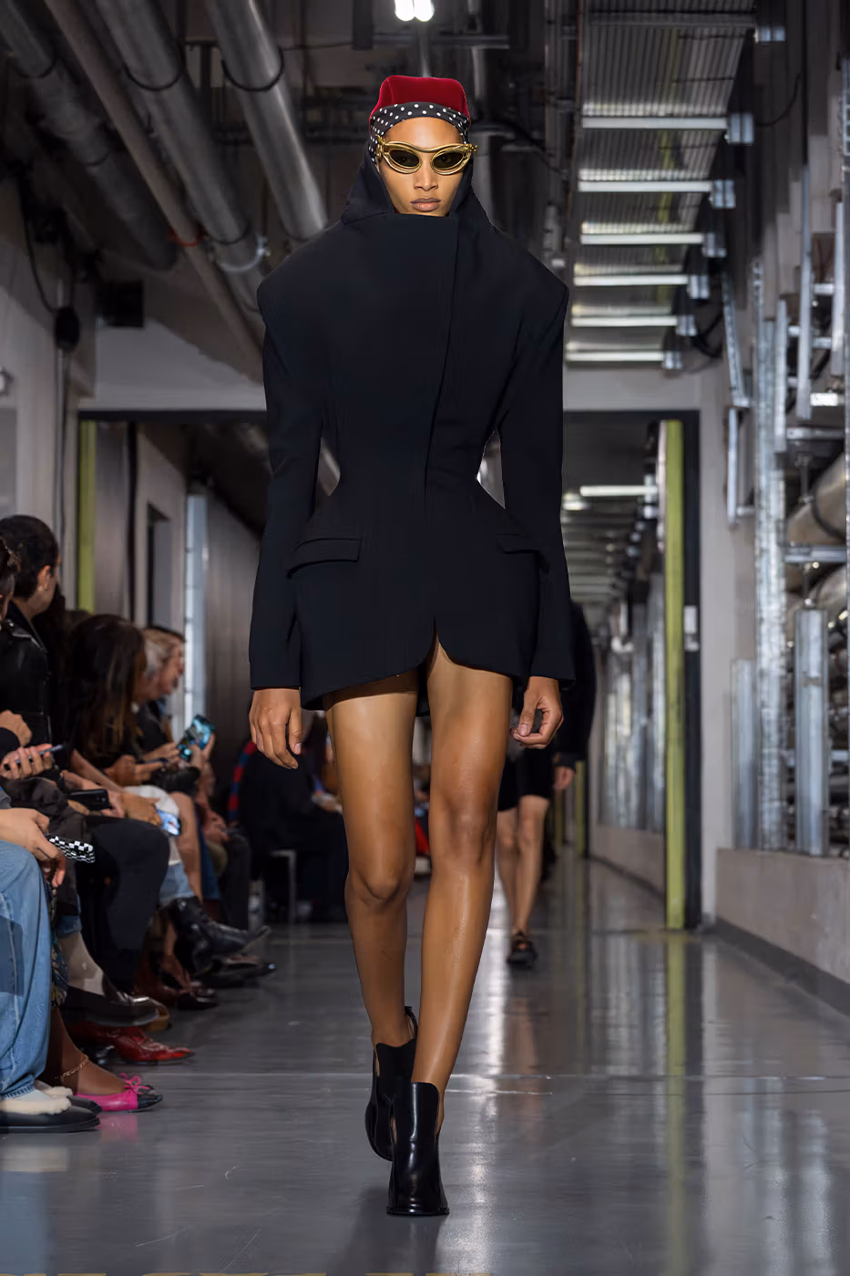 Through his signature process of “Duranification,” Lantink transforms the house’s iconic codes into a study of visual and conceptual experimentation. The classic Marinière becomes an optical illusion, while the tattoo-on-mesh motif expands into three-dimensional forms that explore the limits of body and movement. Proportions shift, volumes blur, and identity multiplies.
