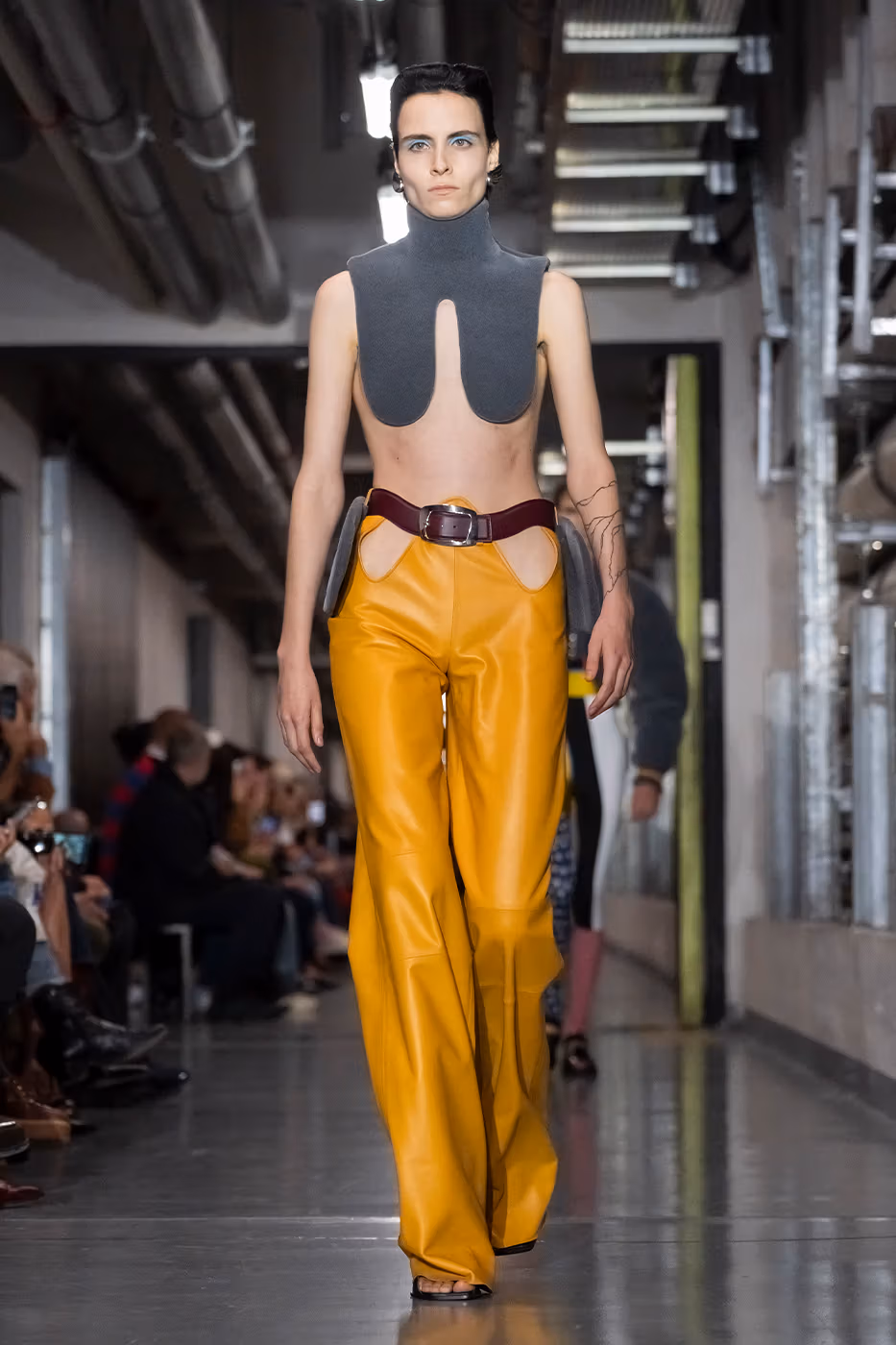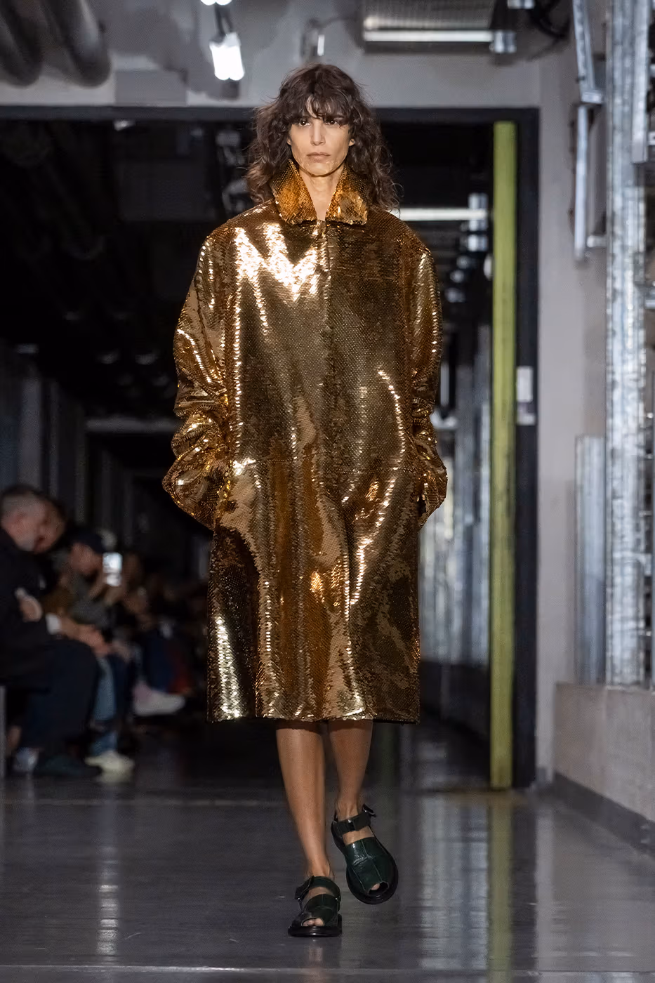 The collection finds its rhythm in the spirit of Amsterdam’s RoXY club — a symbol of hedonism and creative anarchy, where fashion and nightlife merged into a single language of expression. The voice of poet John Giorno accompanies the show with a hypnotic cadence, deepening its introspective tone.