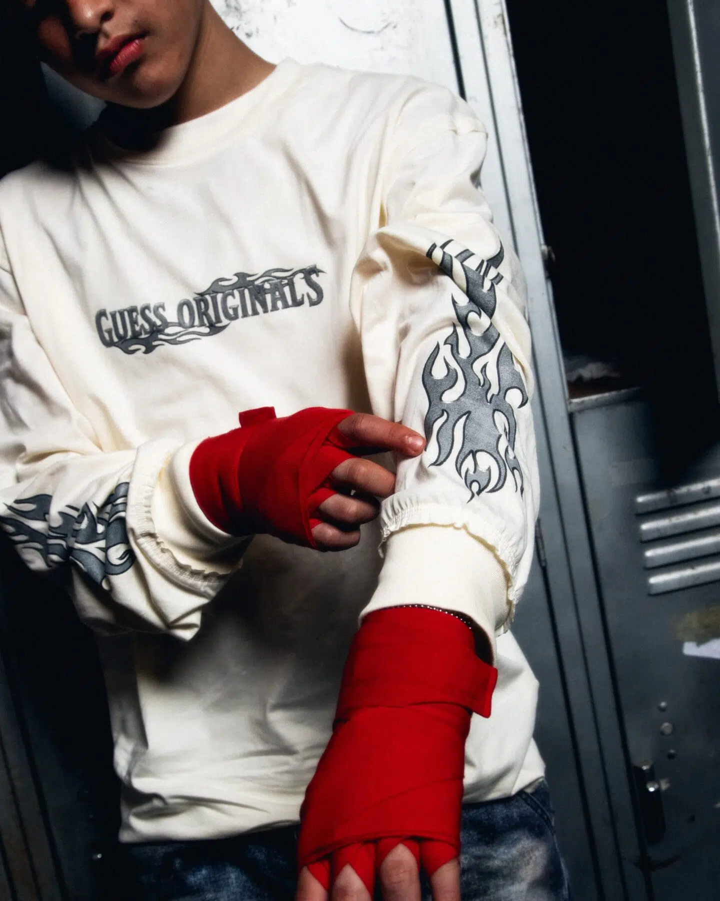 Finally, Junior arrives at a boxing gym in Tribeca, where he prepares for a training session. In this more intimate setting, the focus shifts to a GUESS Originals staple piece. This classic is revamped with fresh graphic details and a boxier fit, staying true to the brand’s roots, but with a modern twist.