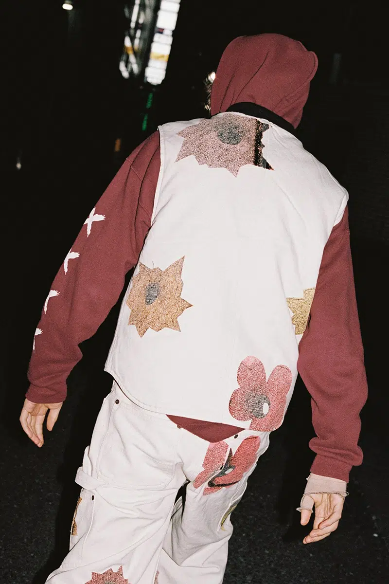 The release, consisting of a waistcoat, jumper, short-sleeved shirt, hoodie and painter’s trousers, features Lowman’s work. “I was very interested in how you could attach violent content to a very peaceful surface of geometric abstraction.”