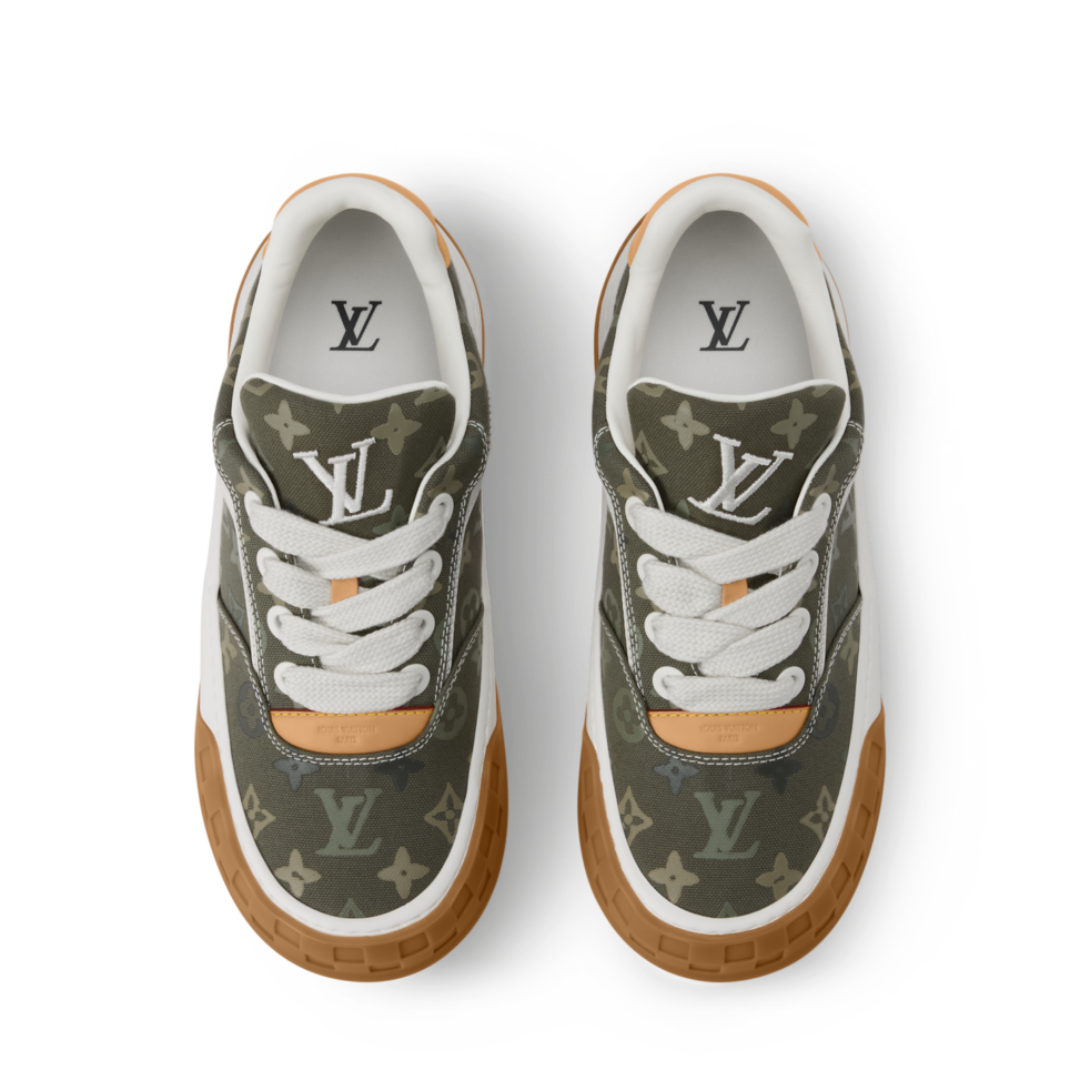 The name of the shoe comes from the slanted logo that adorns its padded tongue, a direct nod to the inclines and slopes of skateboarding. The wide, flat outsole features iconic Louis Vuitton details such as the Monogram flower and Damier pattern in high relief, while the upper stands out for its minimalism, embellished with stitching reminiscent of 1990s designs.