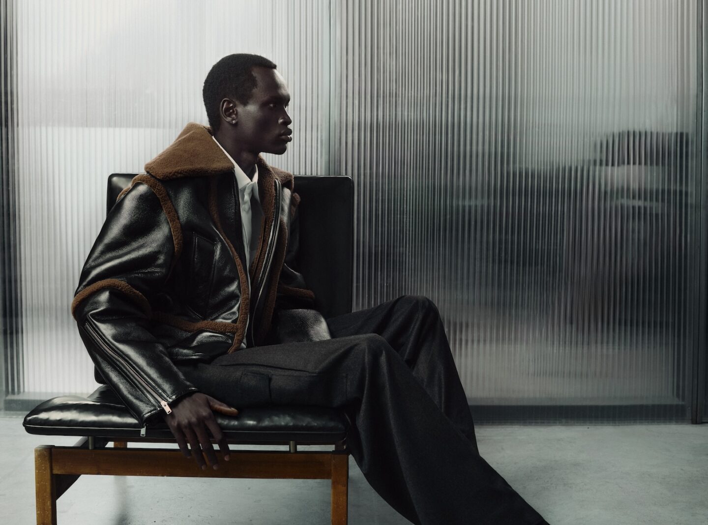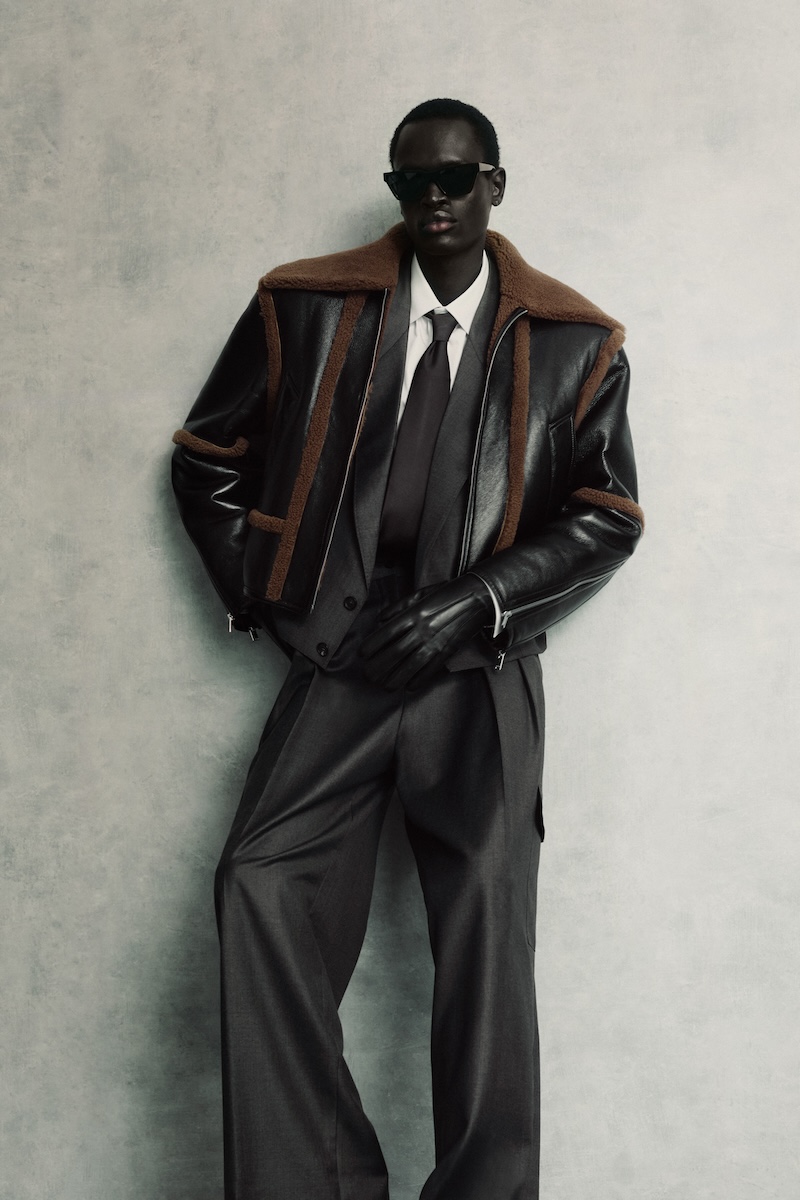 The double-faced shearling jacket, already worn by personalities like Gabriel Guevara, is the collection’s true star item, featuring biker construction, zipped cuffs, controlled volume and a commanding presence.